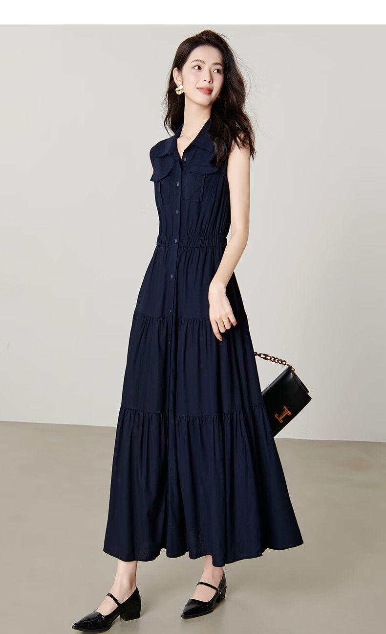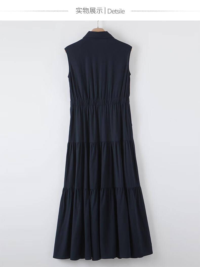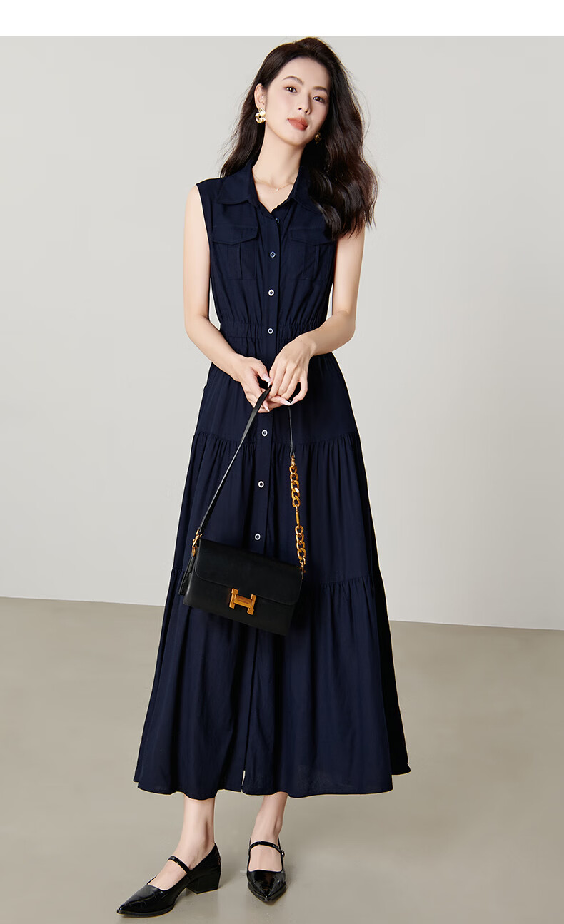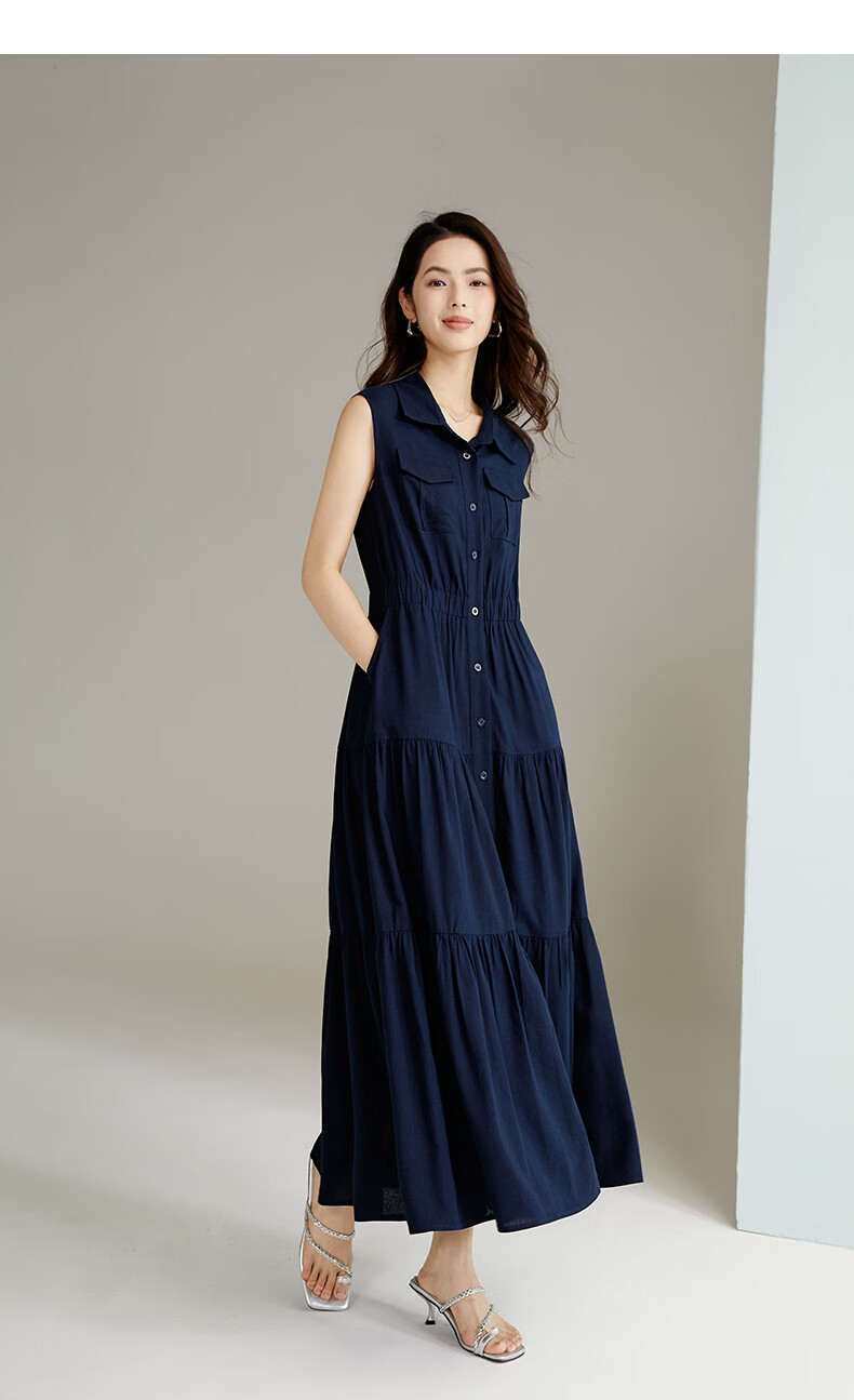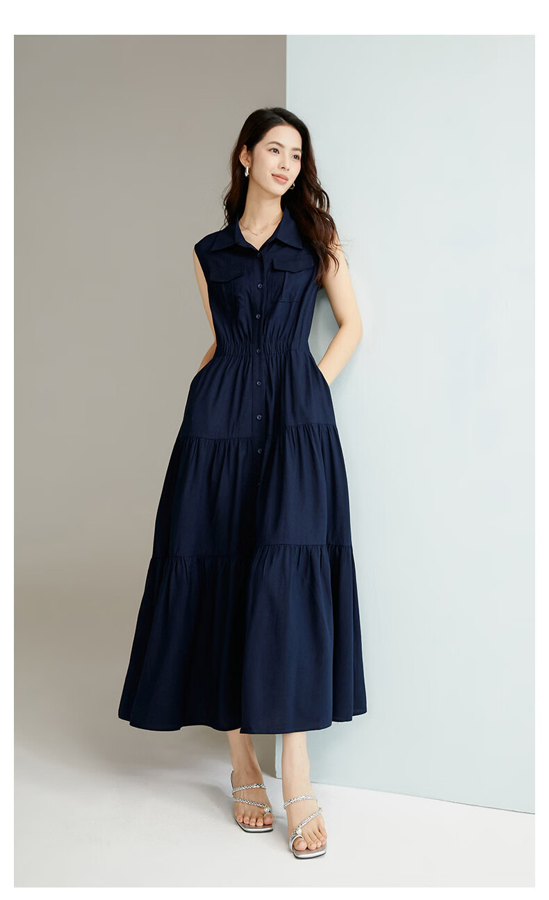 晚白【新品】2026年春款翻领衬衫裙亲肤棉麻休闲高腰无袖连衣裙 深蓝色 S