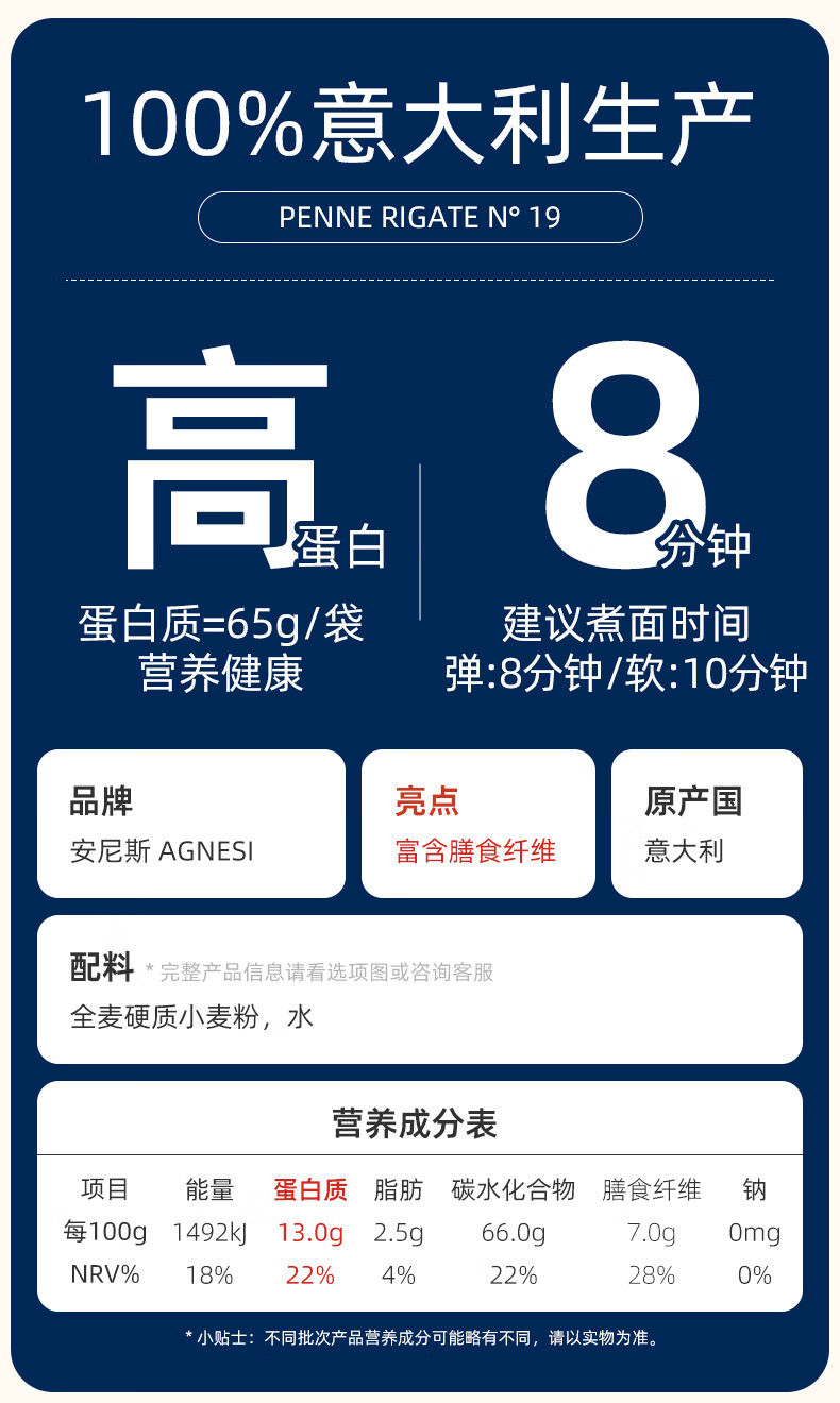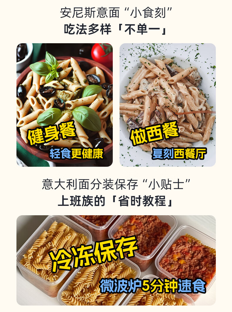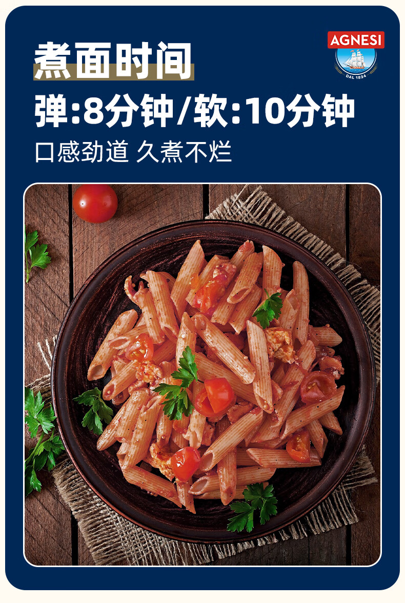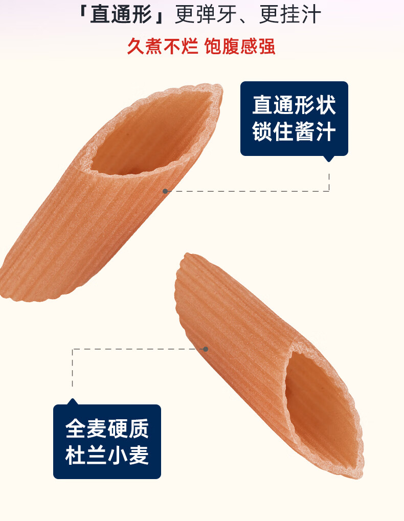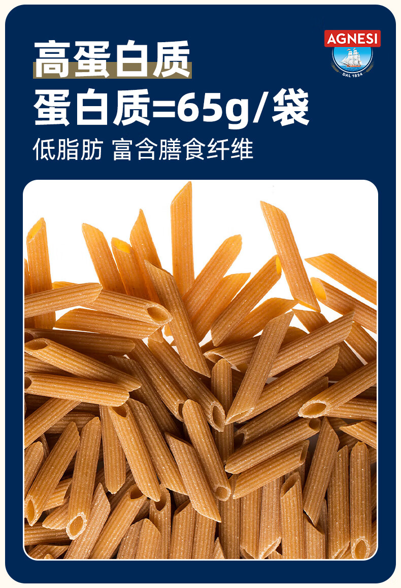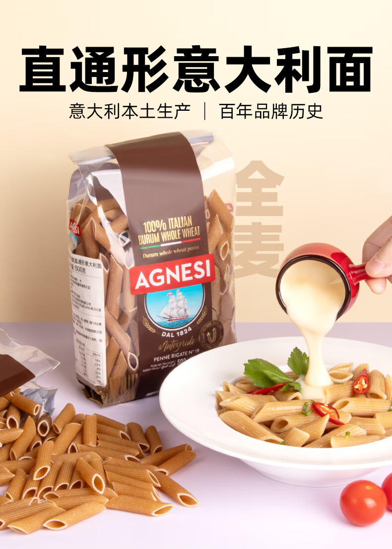 安尼斯全麦通心意面500g意大利进口传统意面低脂高蛋白全麦斜切空心意面