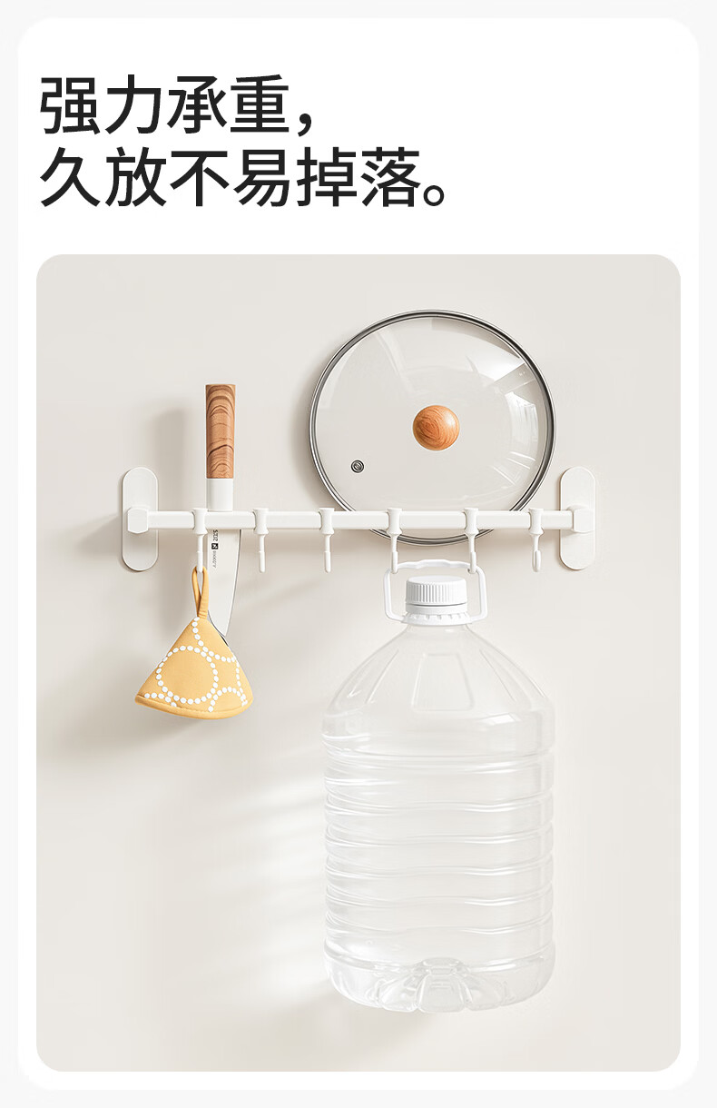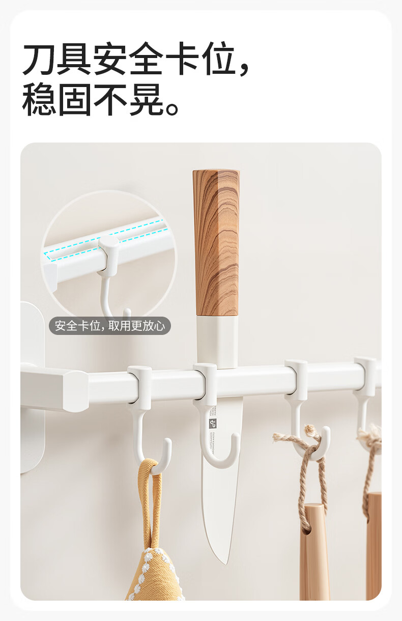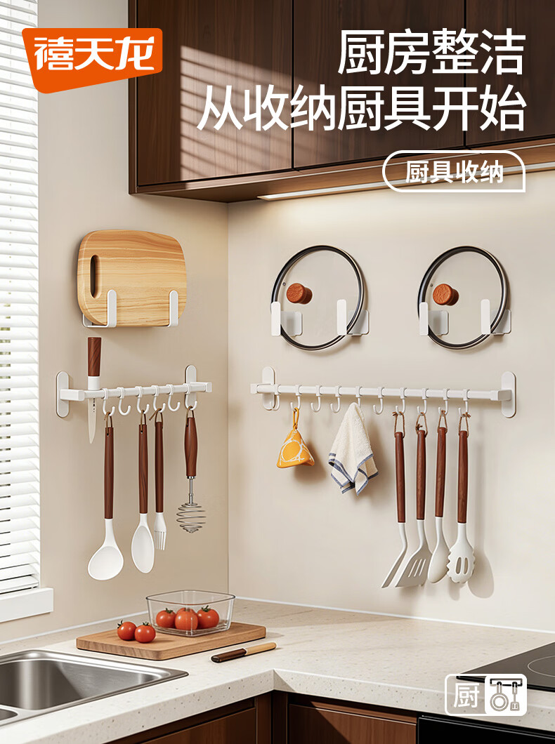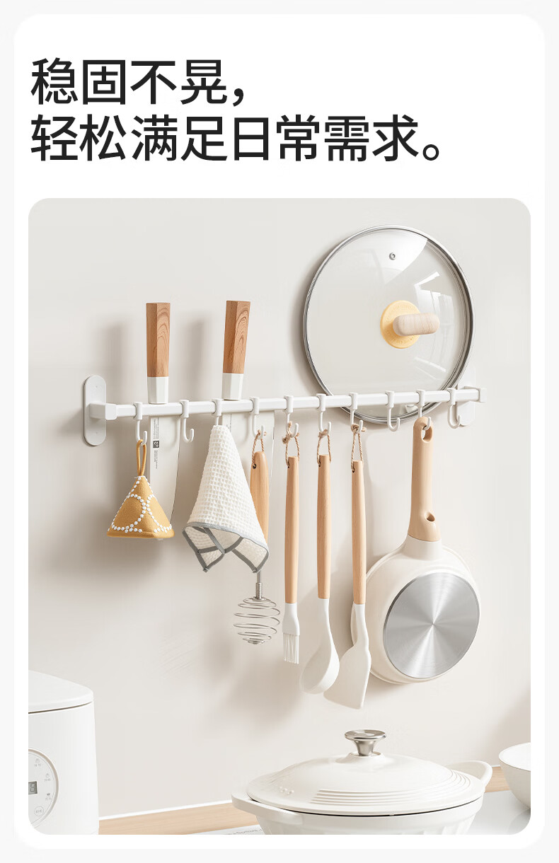 禧天龙厨房挂钩免打孔挂杆厨房置物架锅铲勺子挂架不锈钢排钩壁挂式收纳 【不锈钢厨房排钩】39cm6钩