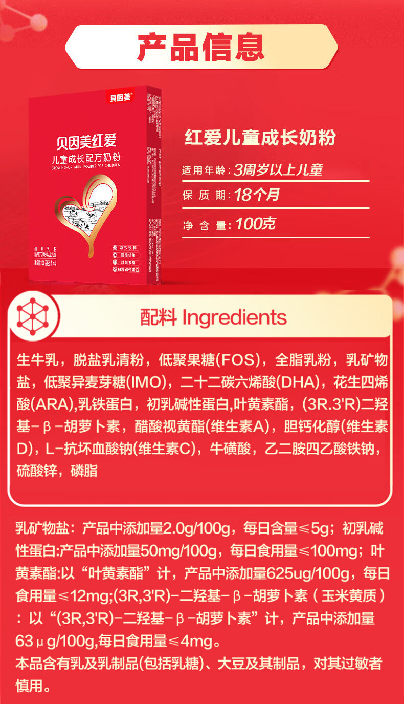 贝因美(Beingmate)红爱儿童成长奶粉4段100g CBP+乳钙+VD+乳铁蛋白 3-15岁