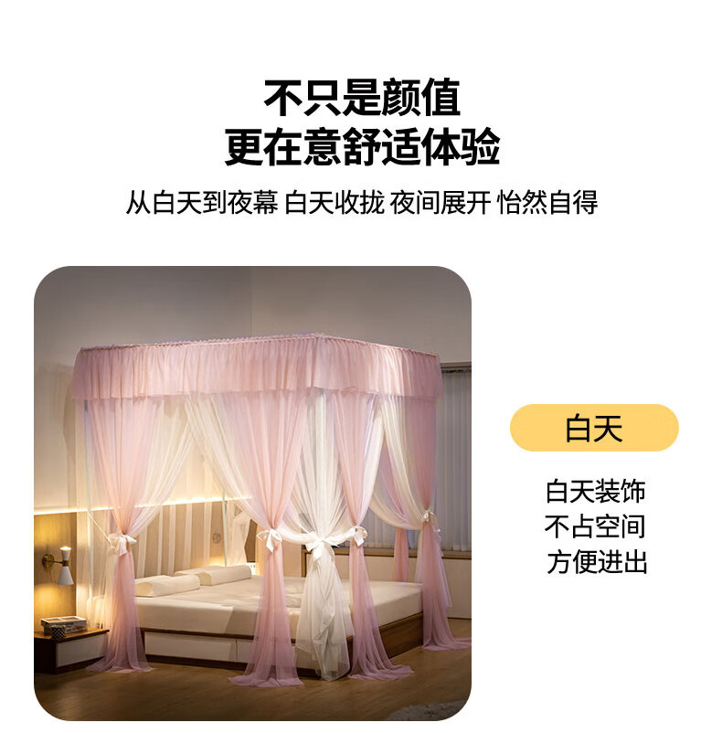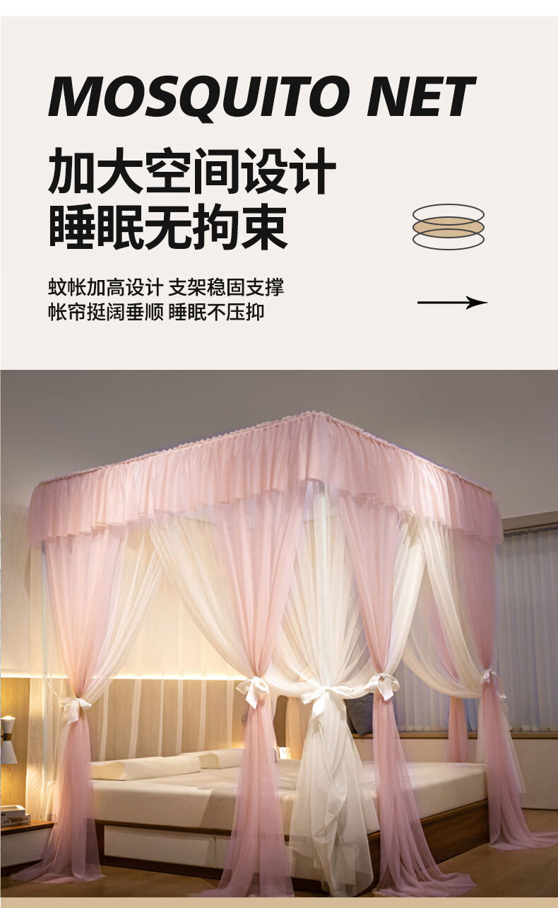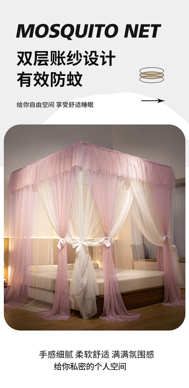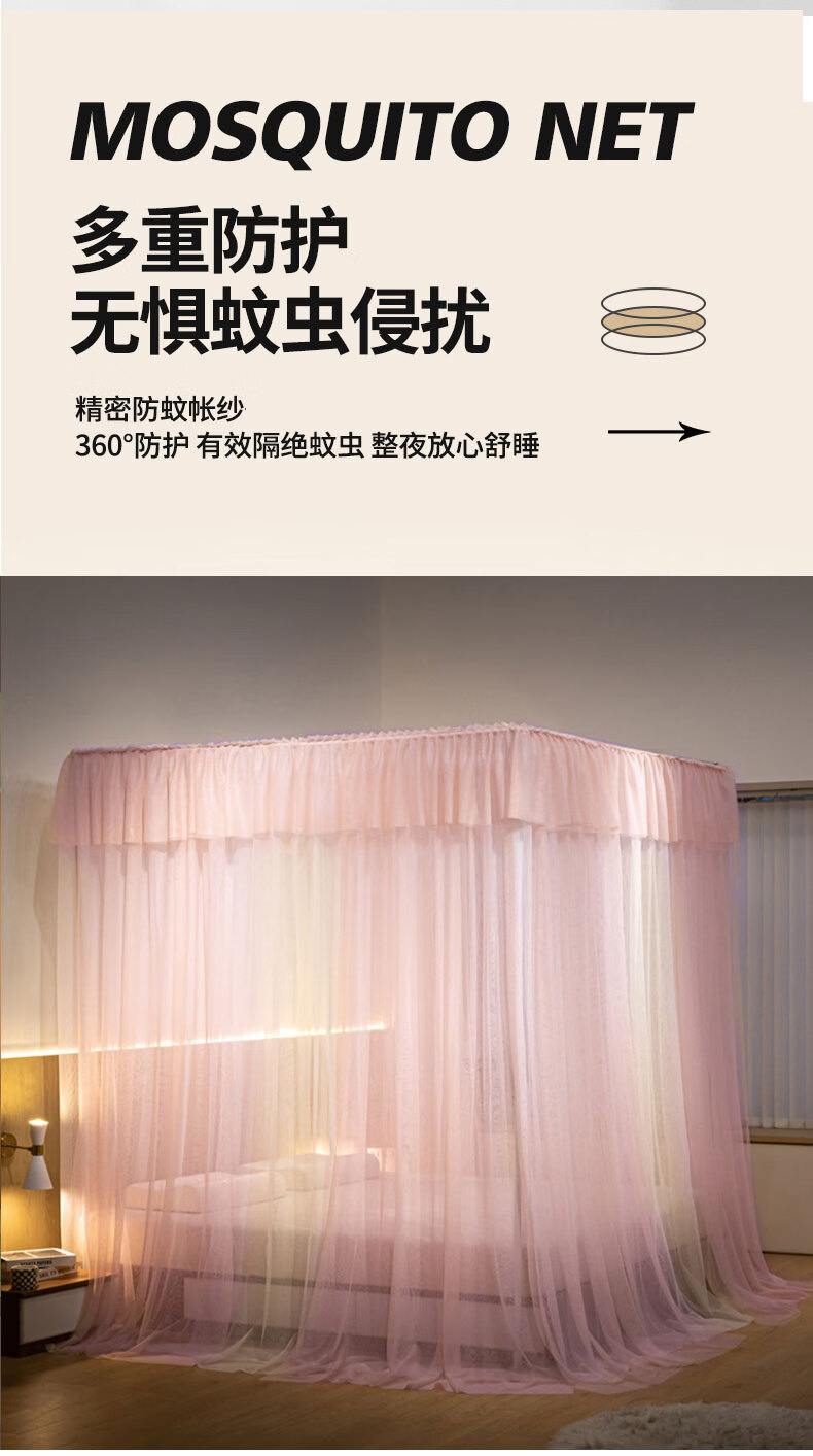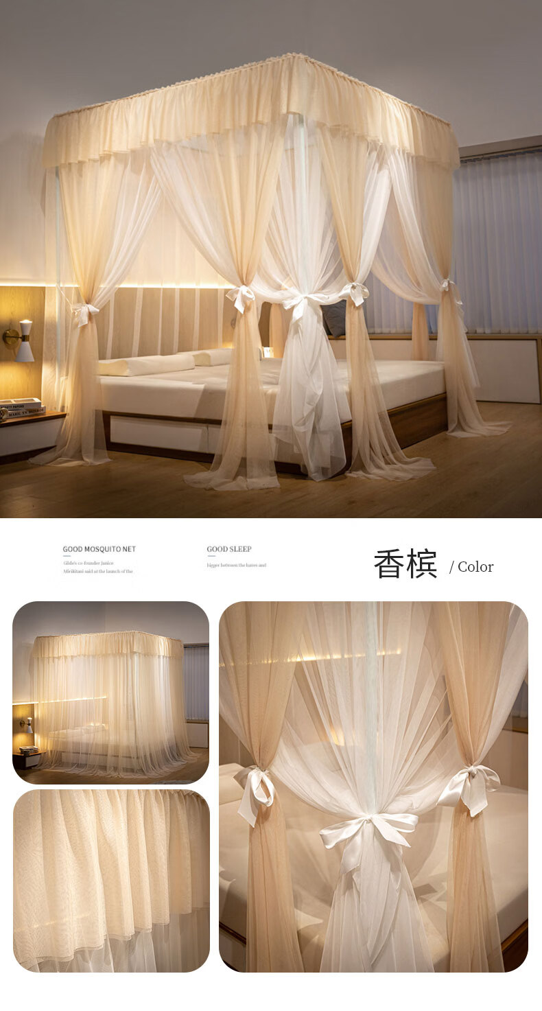无印良品宫廷风落地蚊帐1.8x2米家用卧室加粗支架三开门双层防蚊帐纱床幔 香槟【母婴级双层帐纱】 120cm*200cm*210cm 加高加粗烤漆支架