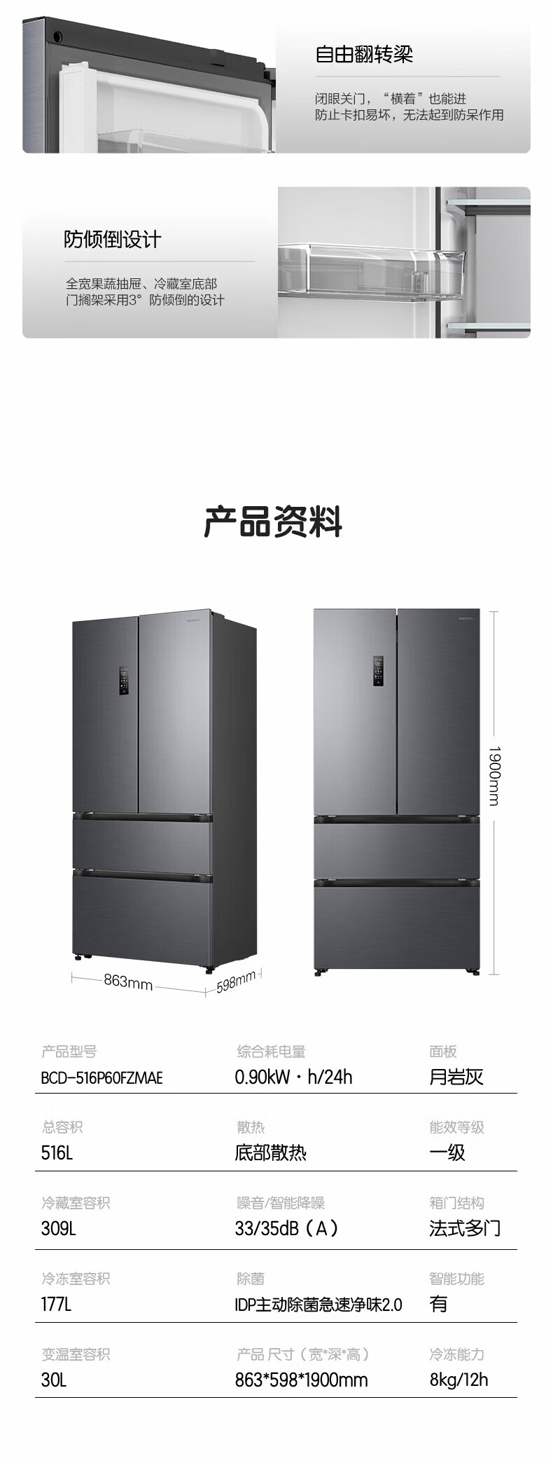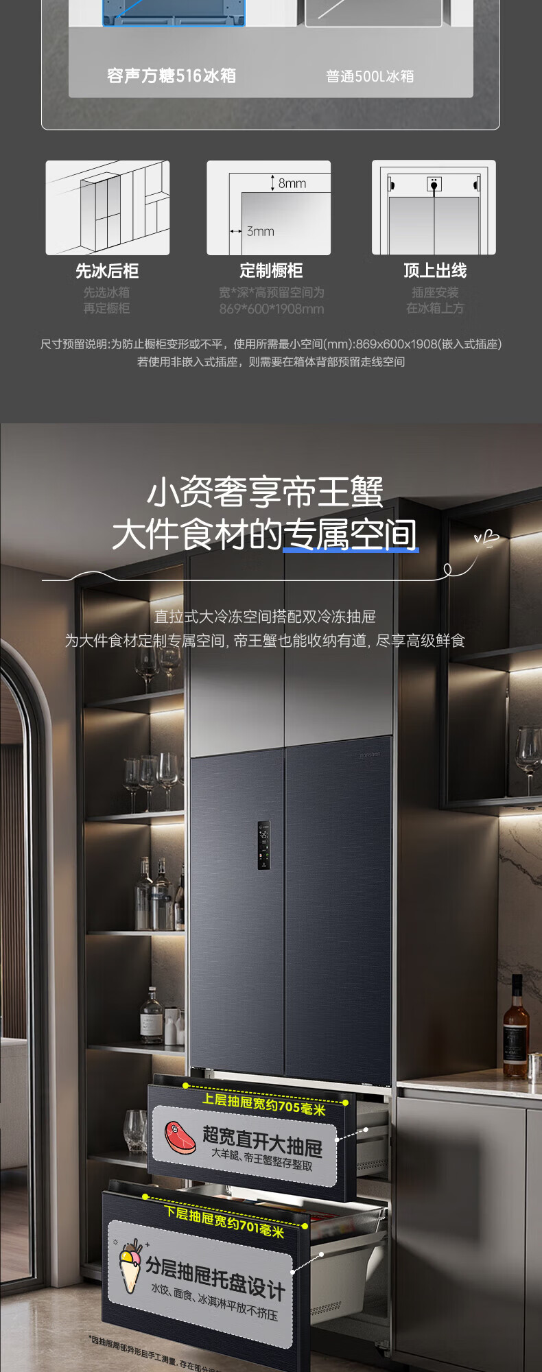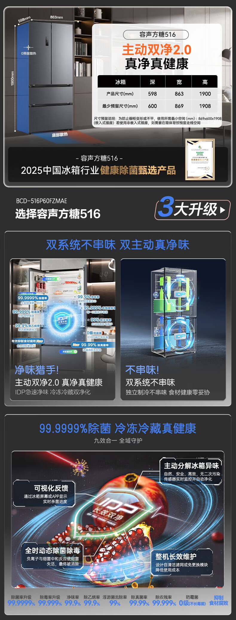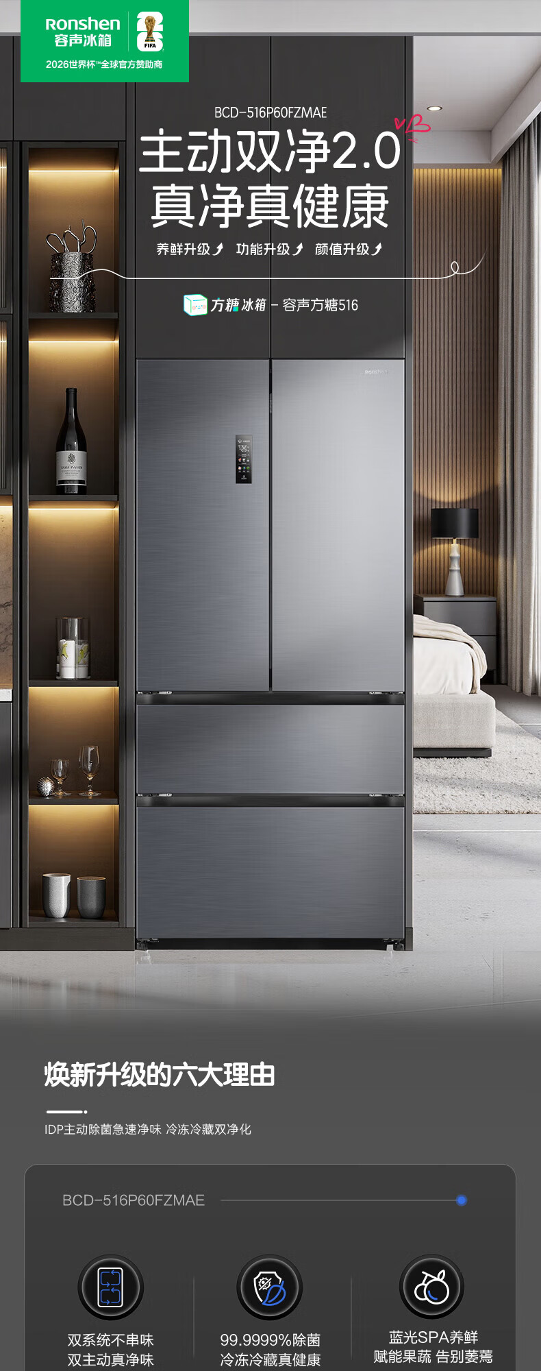 容声方糖516主动双净双系统法式多门四开门超薄零嵌入式电冰箱家用一级能效BCD-516P60FZMAE国家补贴 方糖516升双净双系统