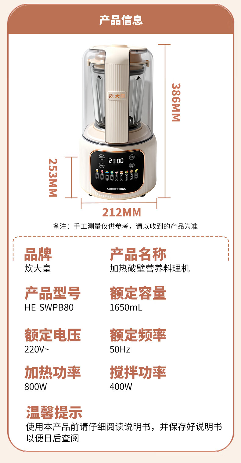 炊大皇(COOKER KING)加热破壁机营养料理机搅拌机家用多功能辅食营养五谷杂粮流食米糊机1.65L大容量豆浆机免煮静音 加热破壁营养料理机