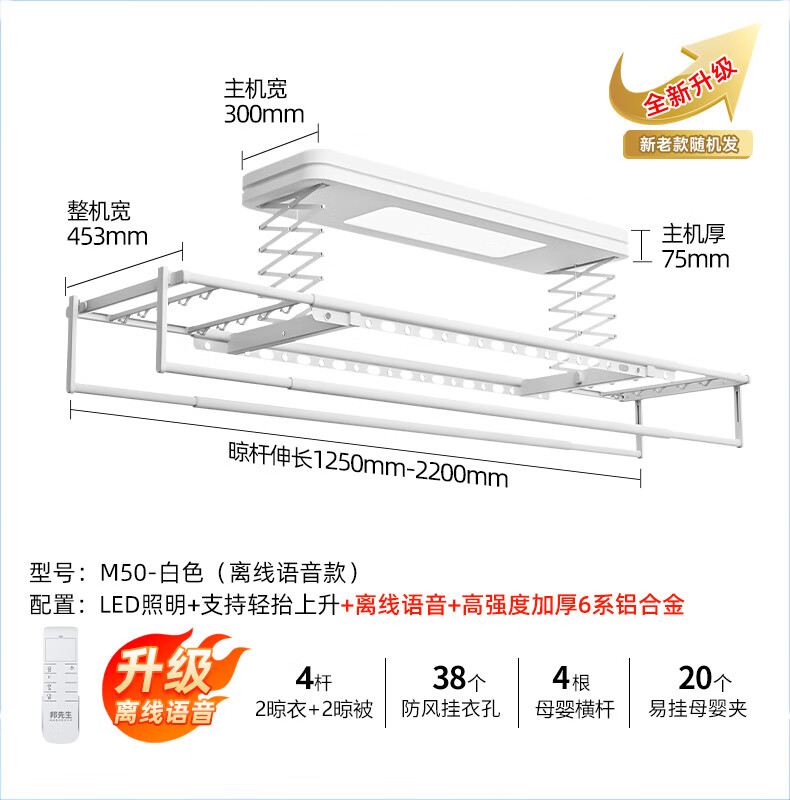 邦先生电动晾衣架智能小阳台全自动升降伸缩遥控家用晾晒衣杆机M50A白