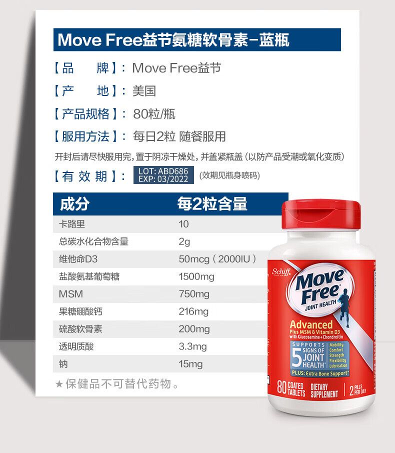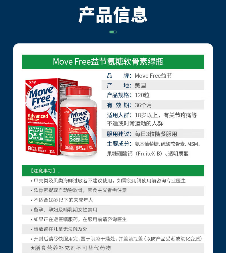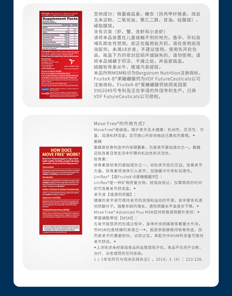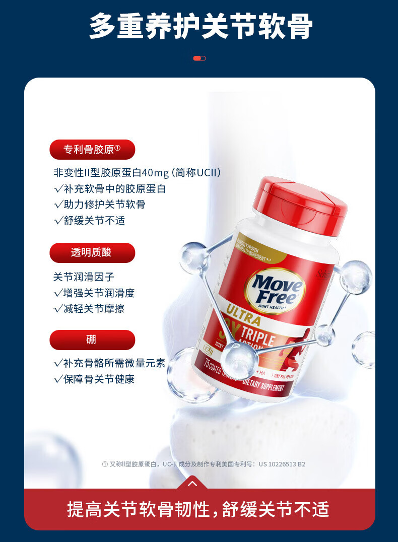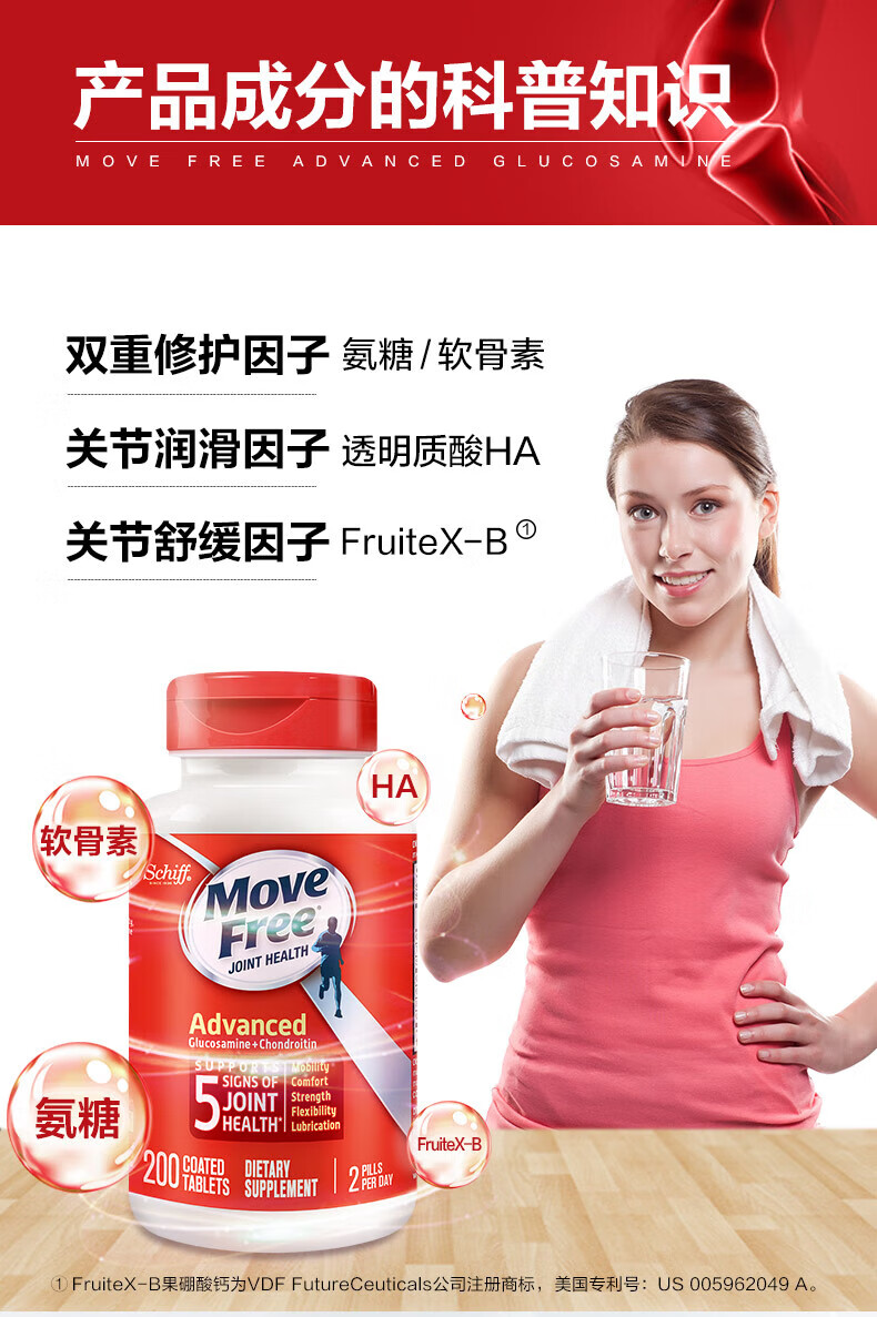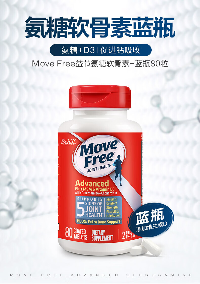 益节(Move Free)美国进口7合1氨糖软骨素钙片含MSM维骨力 中老年人养护关节健康 【红瓶加量装】日常养护 200粒*1瓶