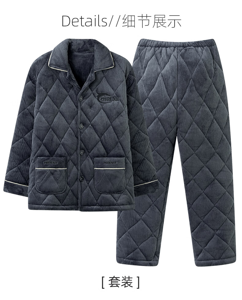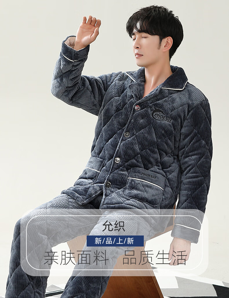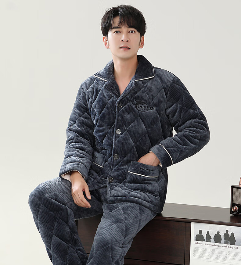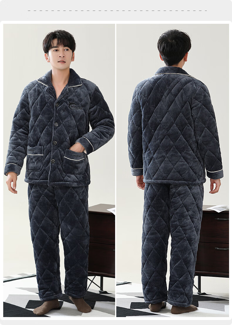 允织睡衣男冬季珊瑚绒三层夹棉加厚加绒棉袄冬天保暖套装男士家居服 6904-墨蓝 L (170) :建议100-120斤穿着
