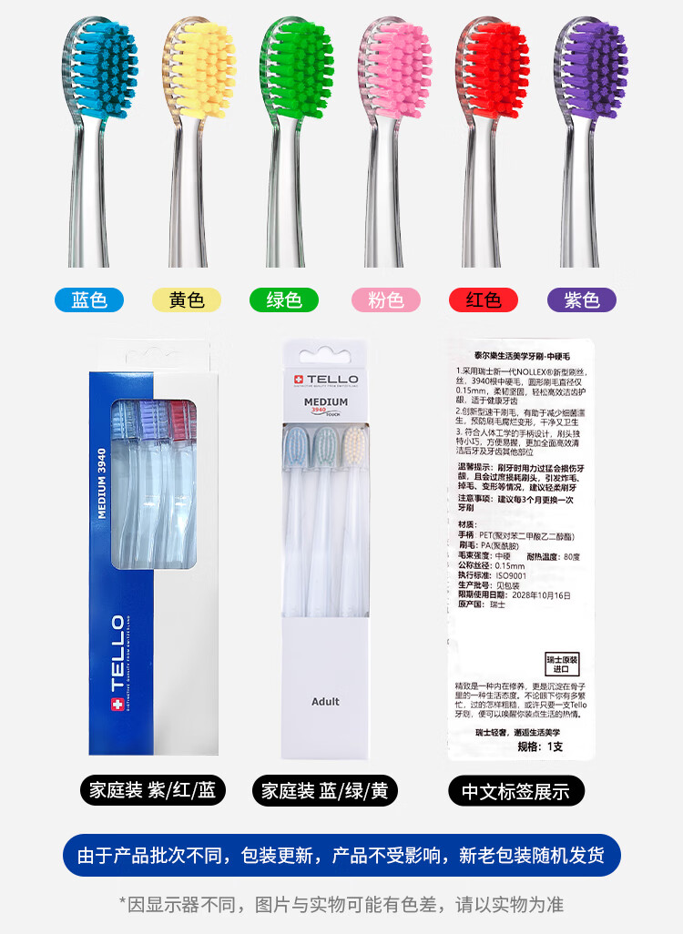 TELLO瑞士进口泰尔乐中硬毛去渍牙刷去烟渍茶渍牙渍黄牙牙垢男女士成人 【颜色可备注】 2支 组合