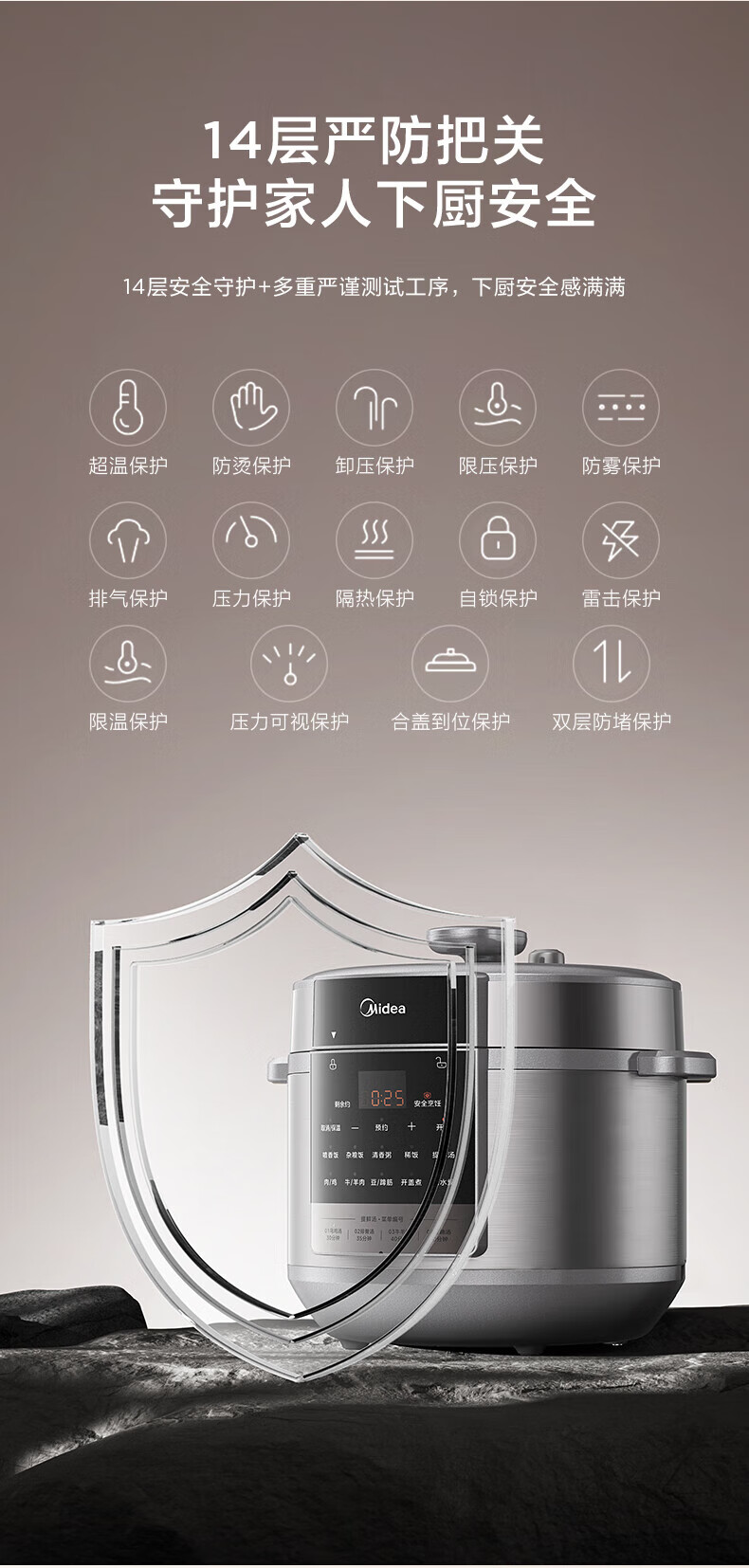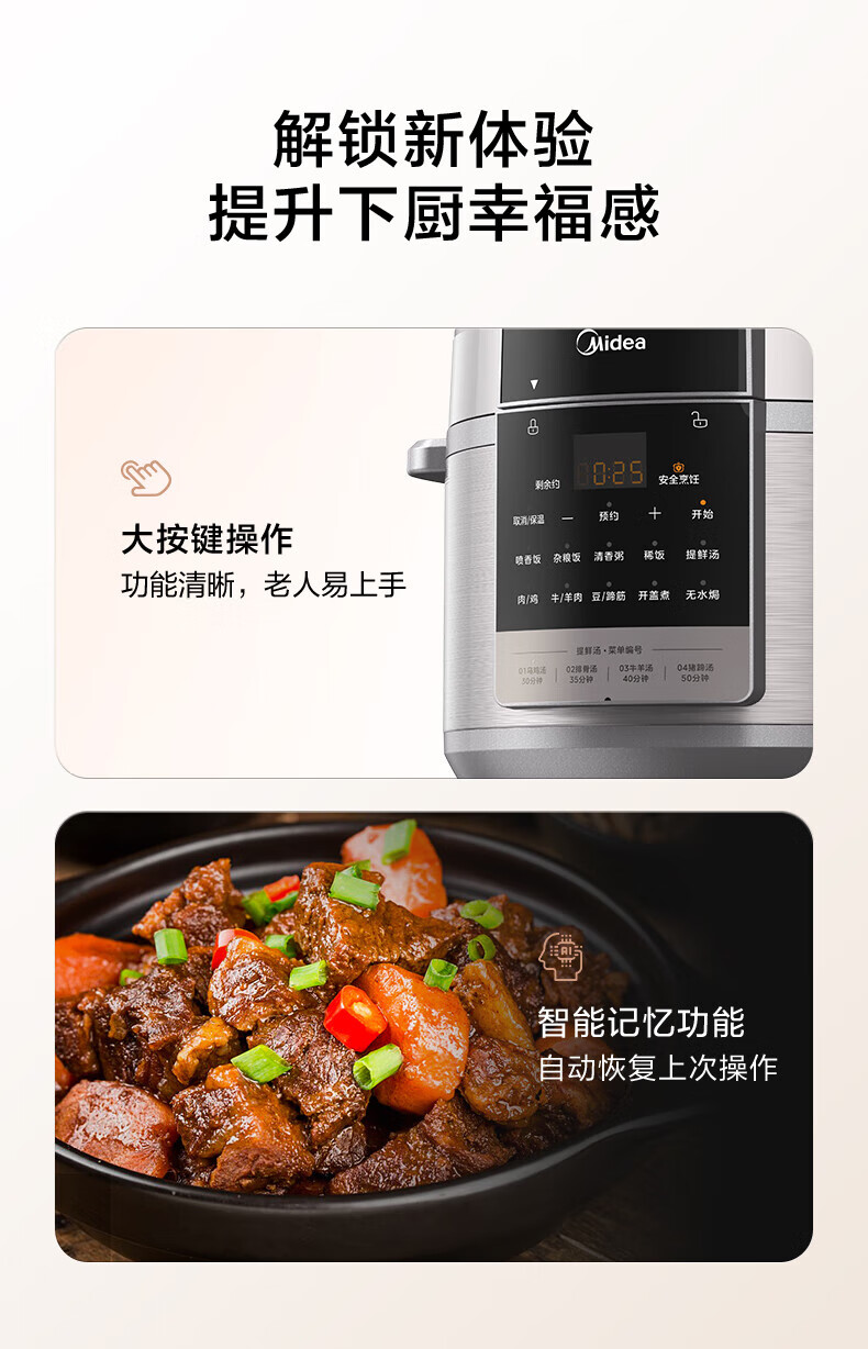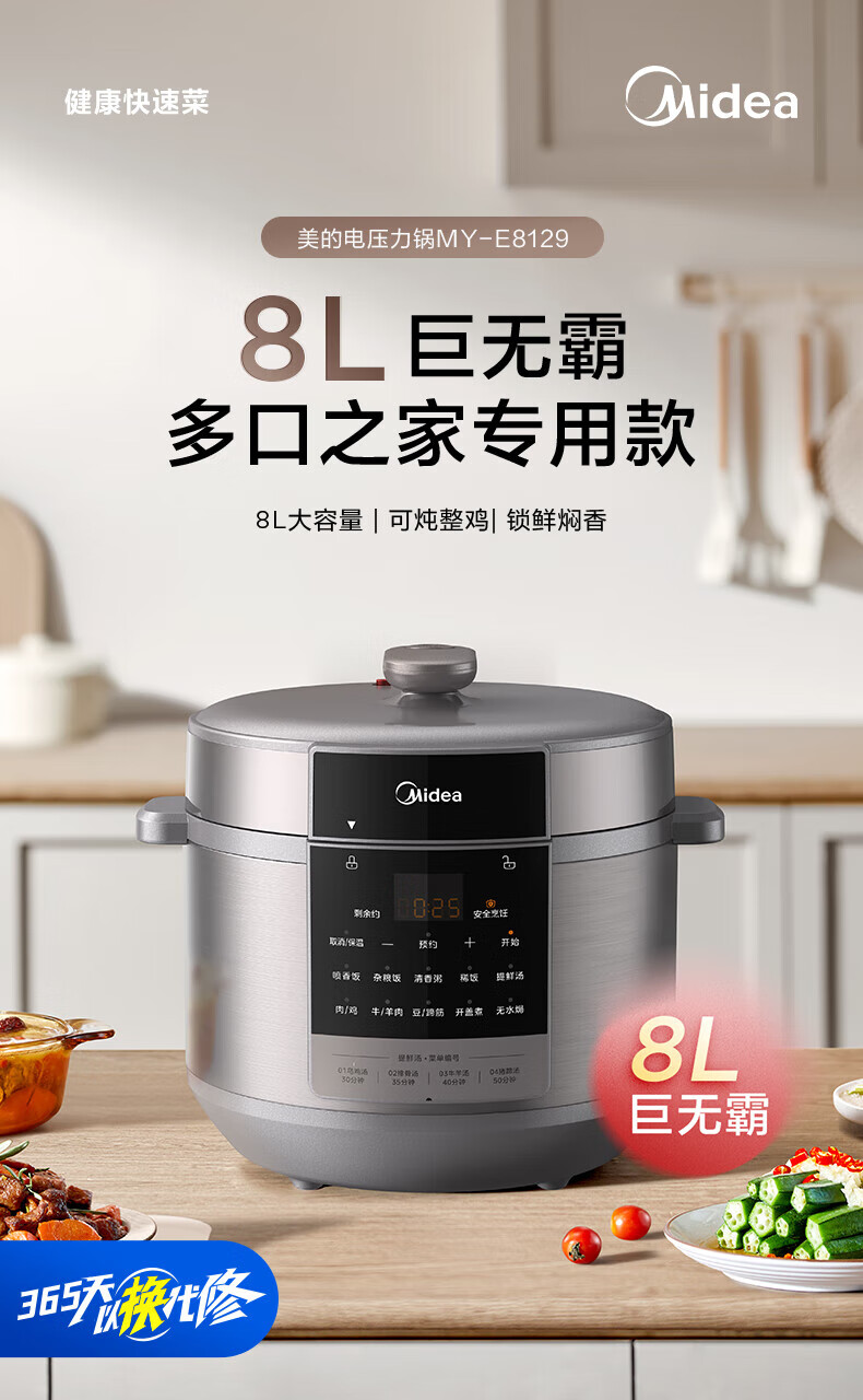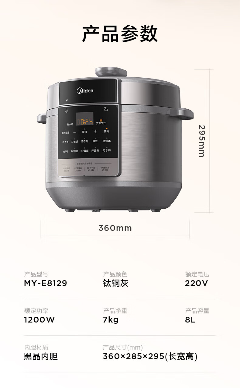 美的(Midea)电压力锅8L大容量8-14人家用电饭煲高压饭锅 全自动智能多功能预约开盖煮火锅煲汤炖煮 MY-E8129 大容量 8L