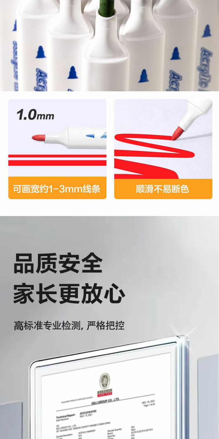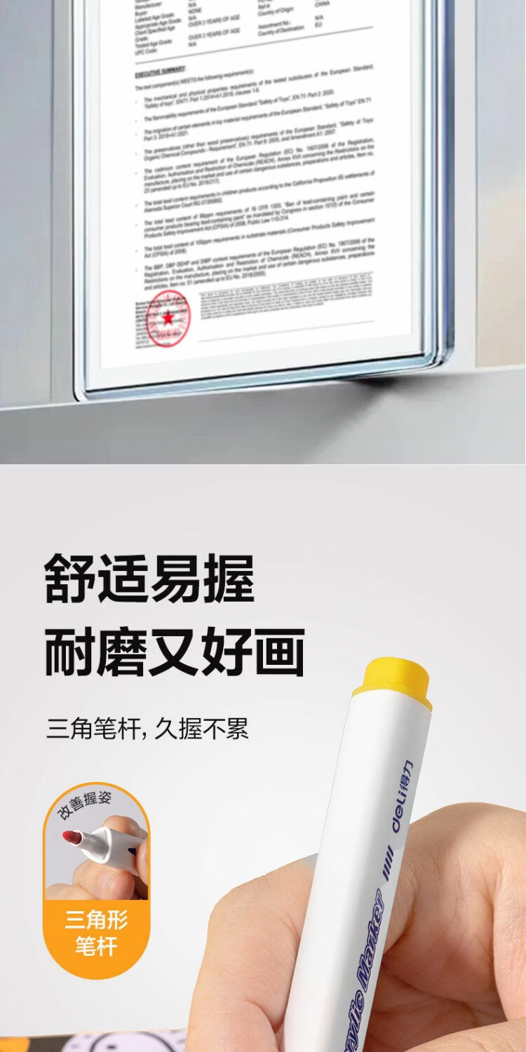 得力丙烯马克笔小学生专用不透色可叠色美术专用直液式软头水彩笔彩笔儿童无毒可水洗画画笔初中生 【桶装12色】三角正姿/加量300%