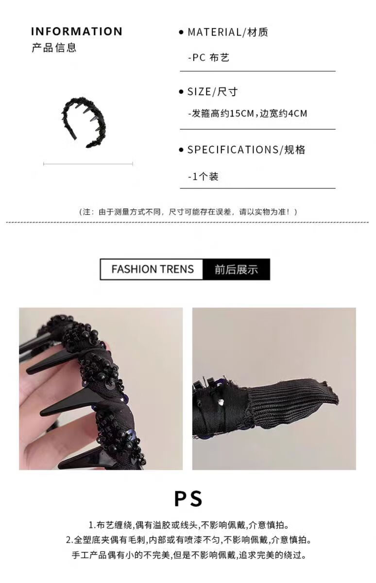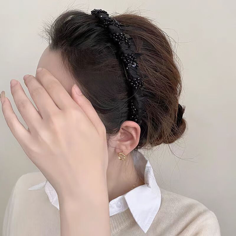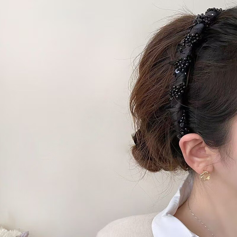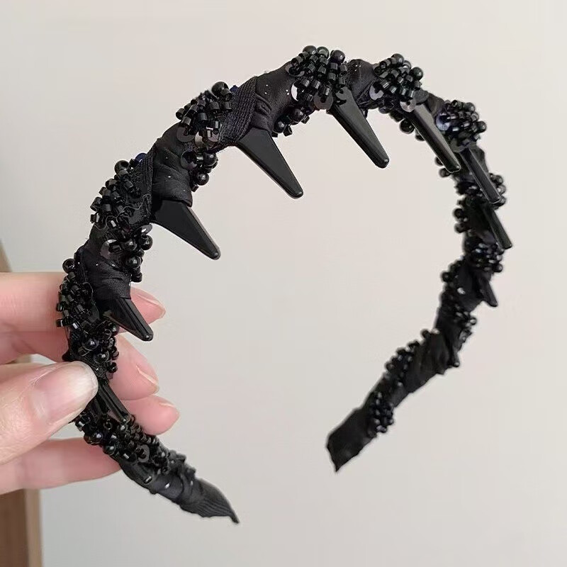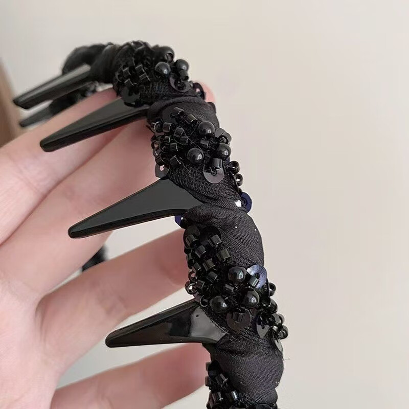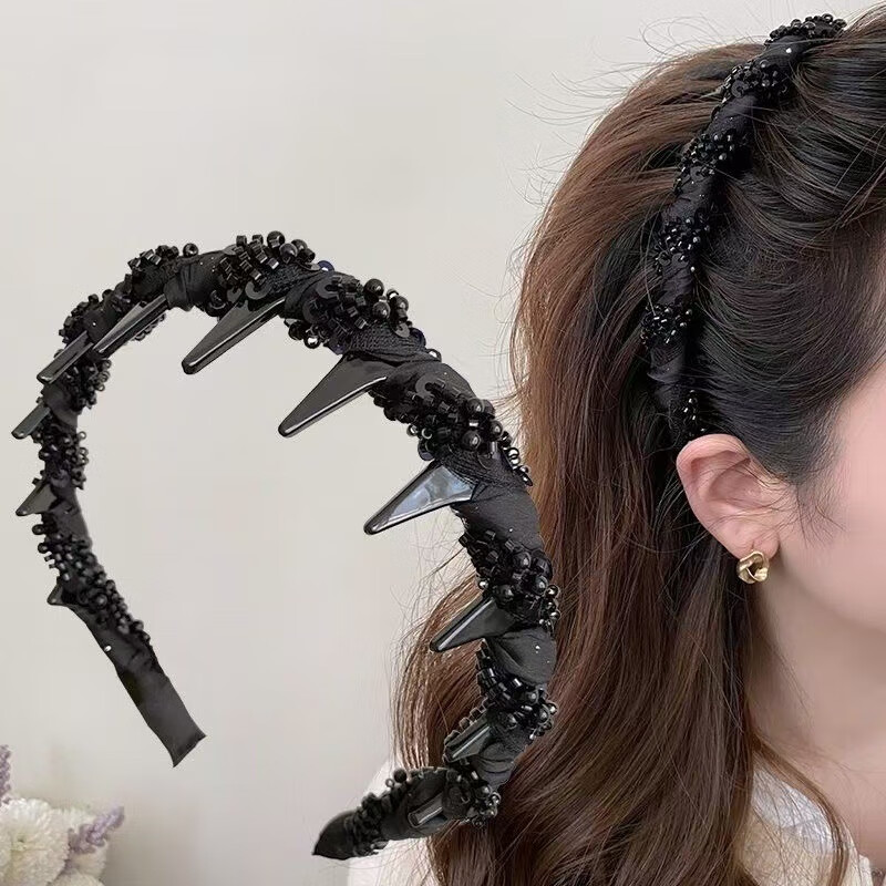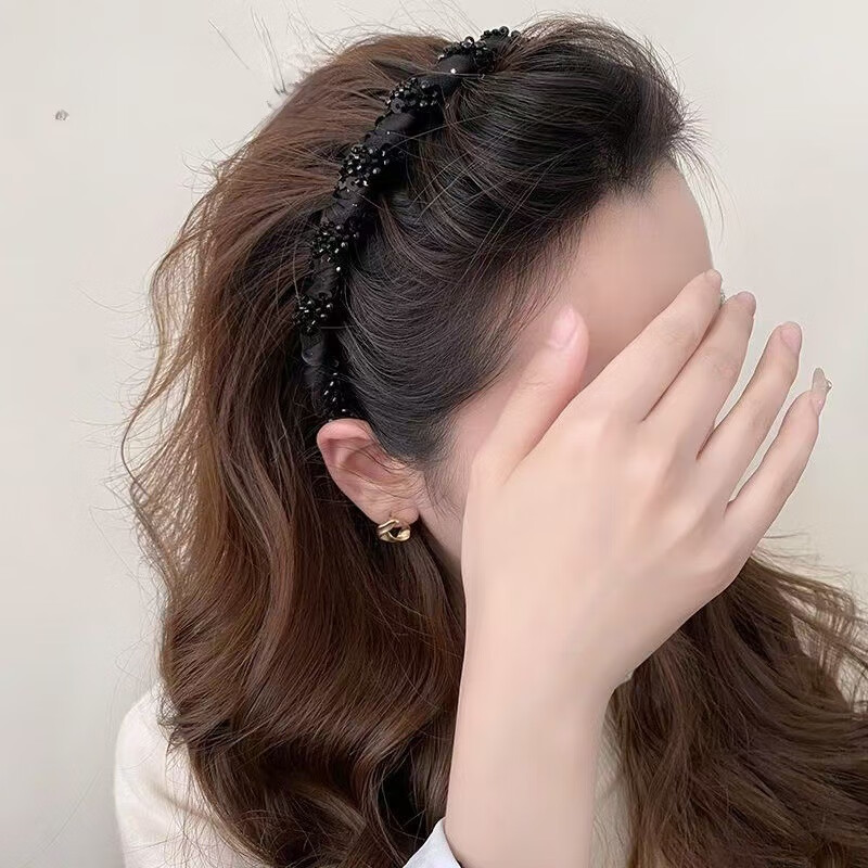 【厂家直供】小众新款手工串珠感轻奢波浪发箍专用颅顶头箍小香风 1 黑色绕珠发箍