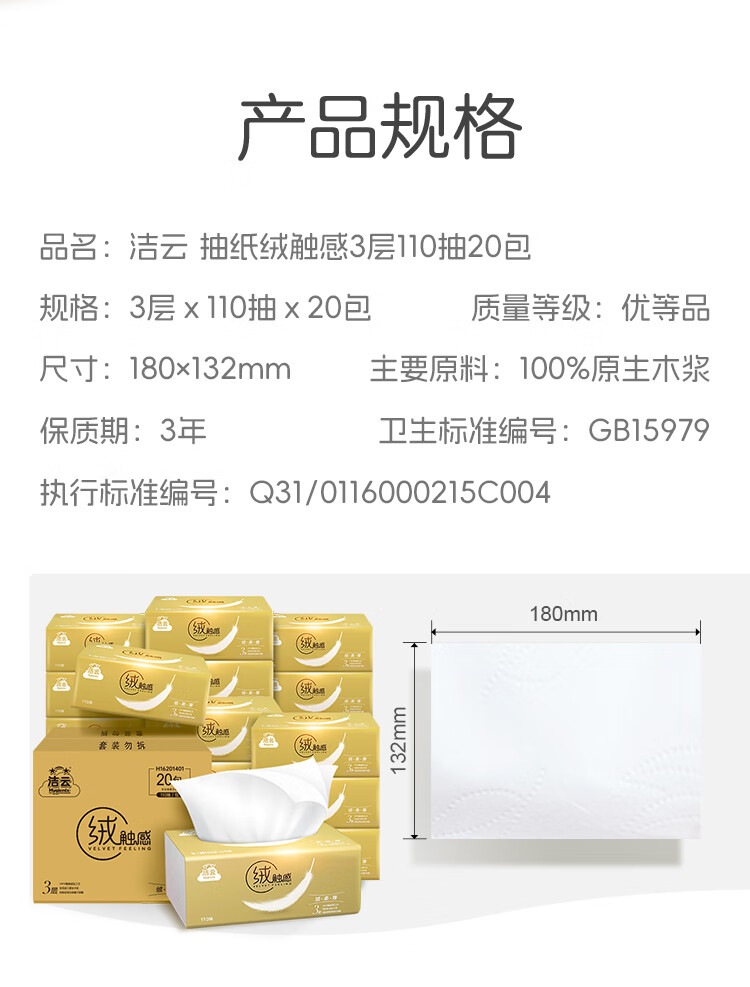 洁云抽纸 绒触感3层110抽*20包整箱 S码 纸巾餐巾纸 软抽面巾纸抽