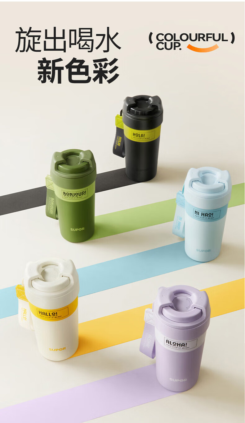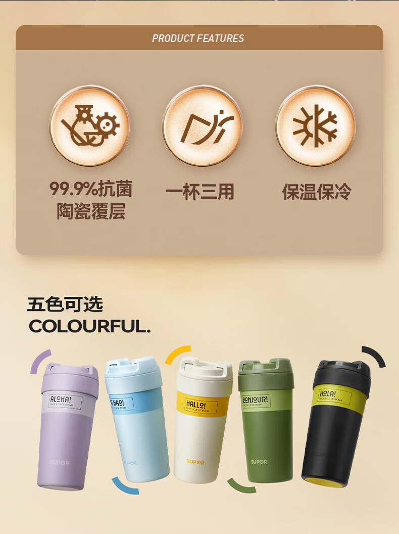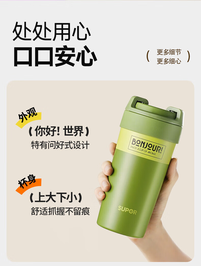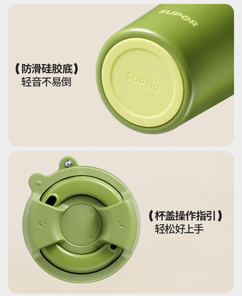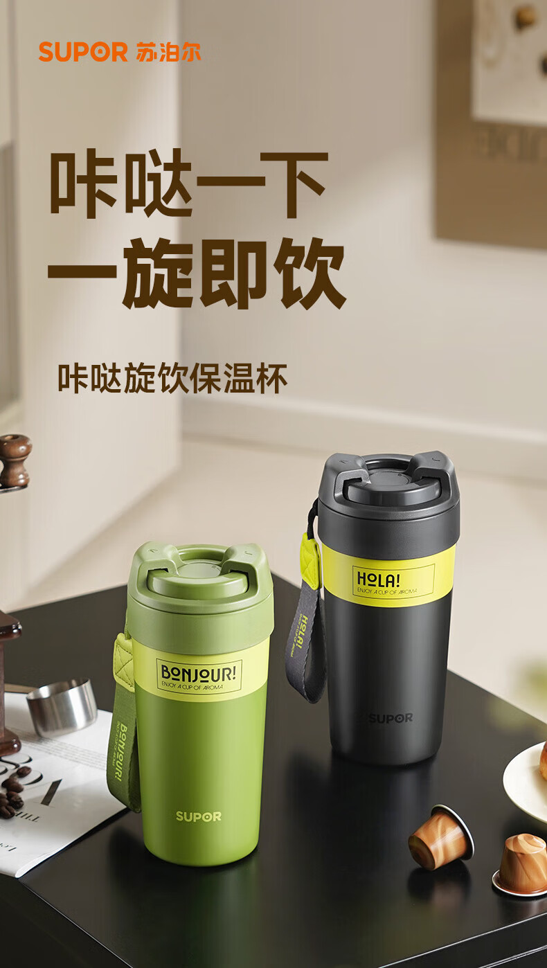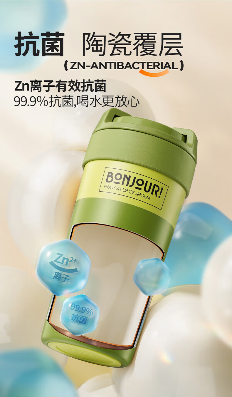 苏泊尔(SUPOR)保温杯咖啡杯男女款抗菌陶瓷覆层水杯大容量带吸管高颜值杯子 旷野绿500ml