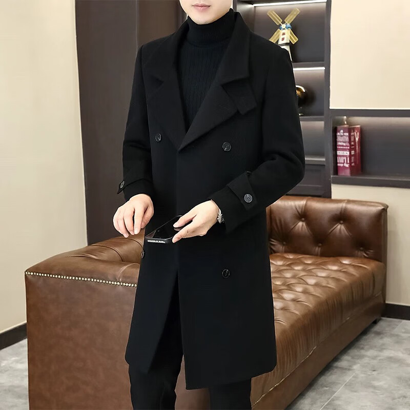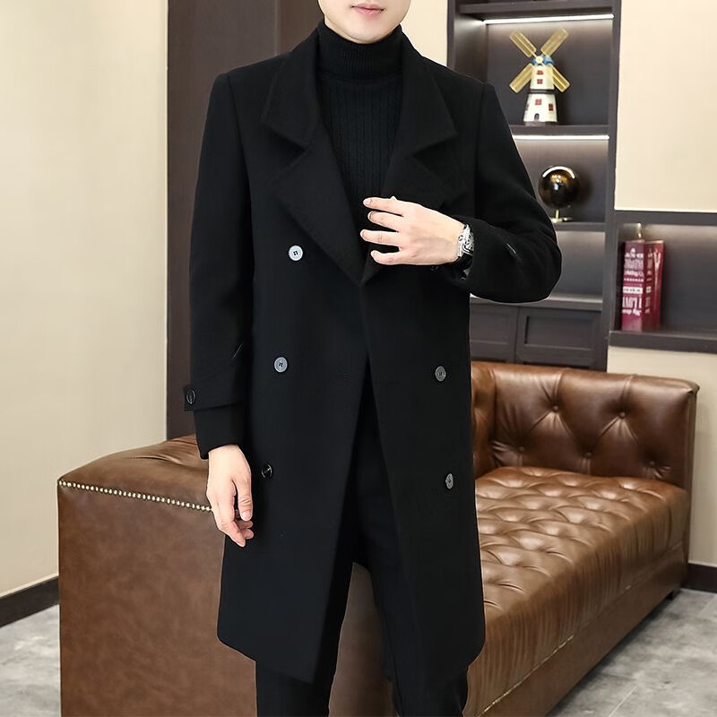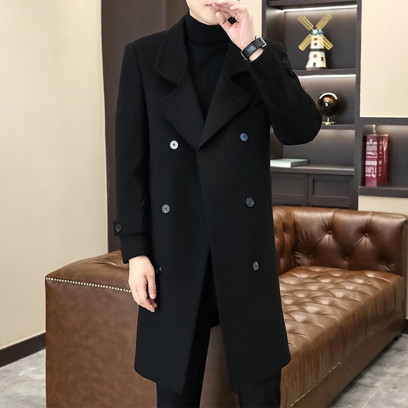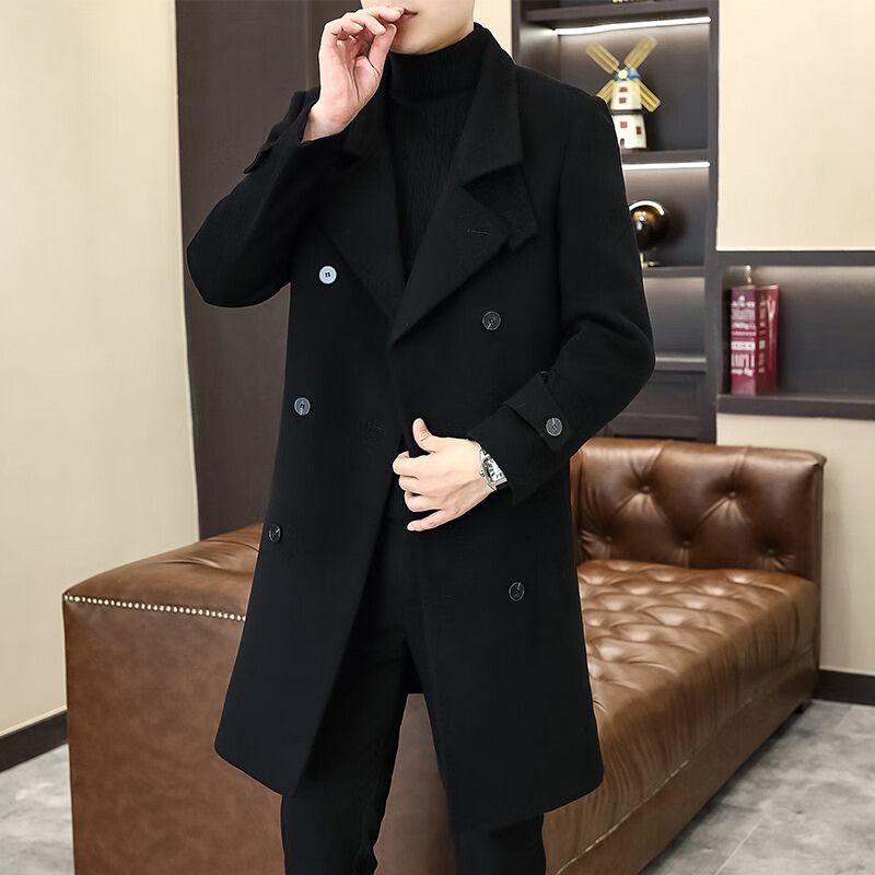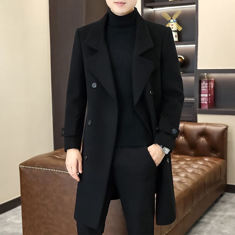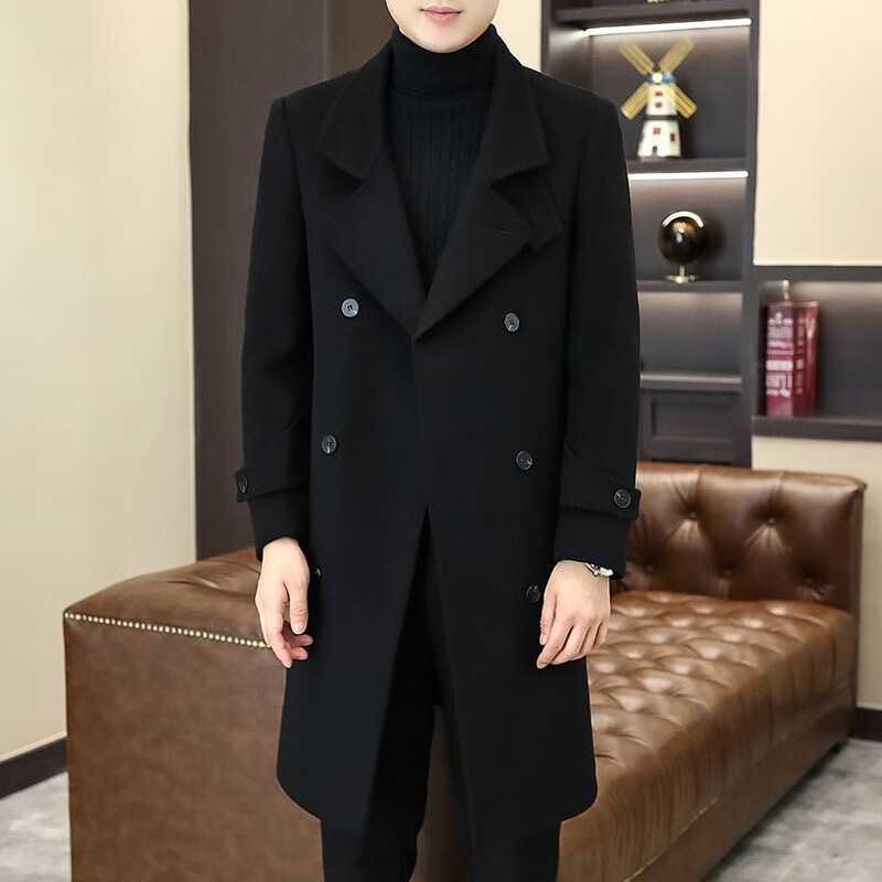 花花公子(PLAYBOY)毛呢大衣男士秋冬季韩版修身中长款呢子风衣感时尚双排扣外套 黑色 4XL 180-200