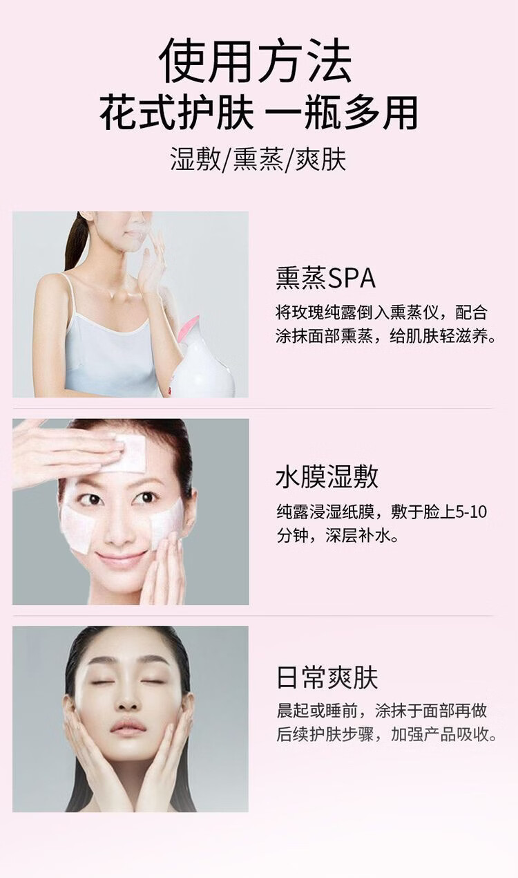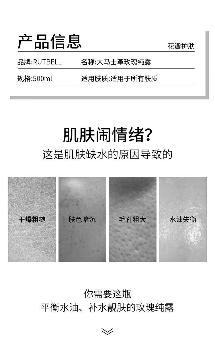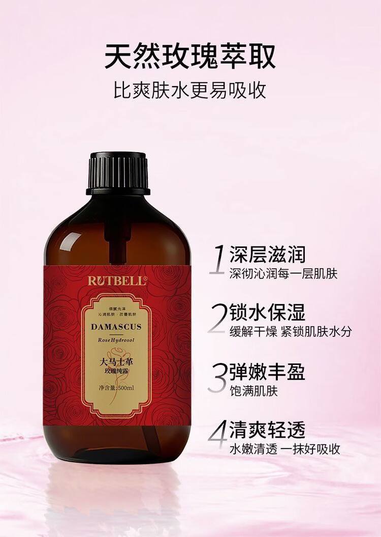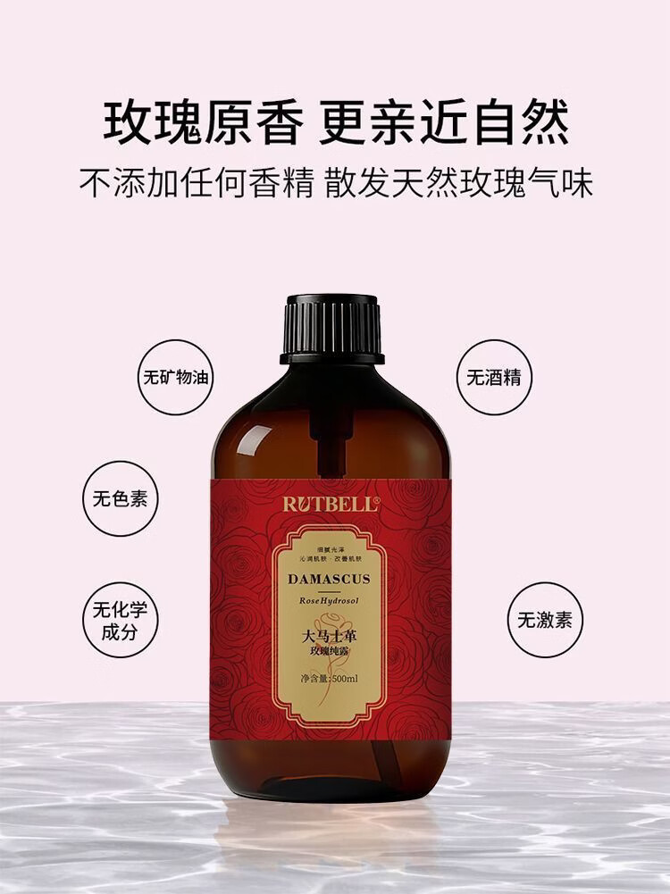 RUTBELL大马士革玫瑰纯露补水保湿沁润肌肤改善干燥暗沉清爽不粘腻易吸收 玫瑰纯露500ml