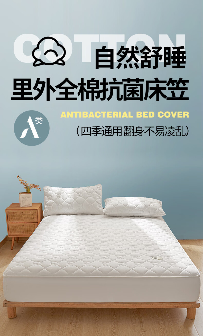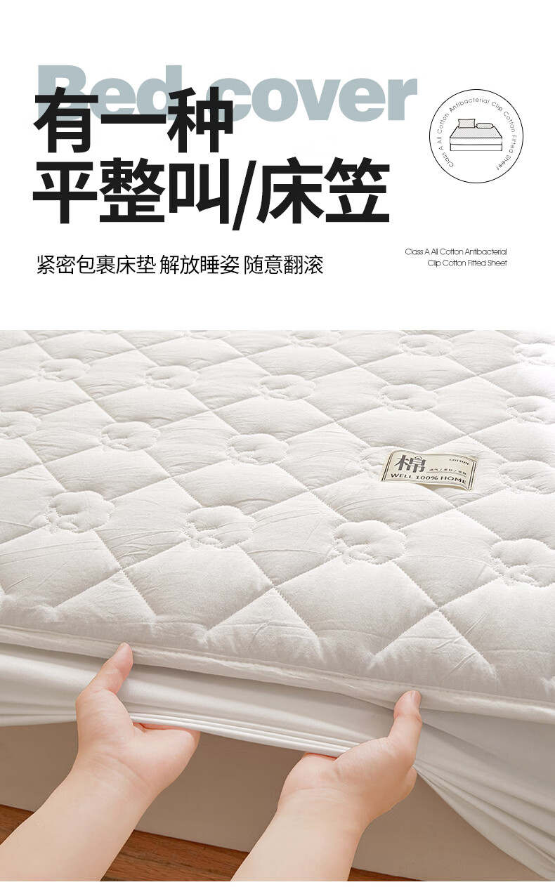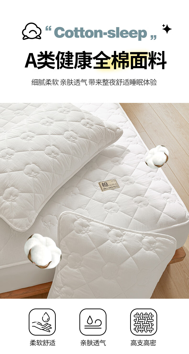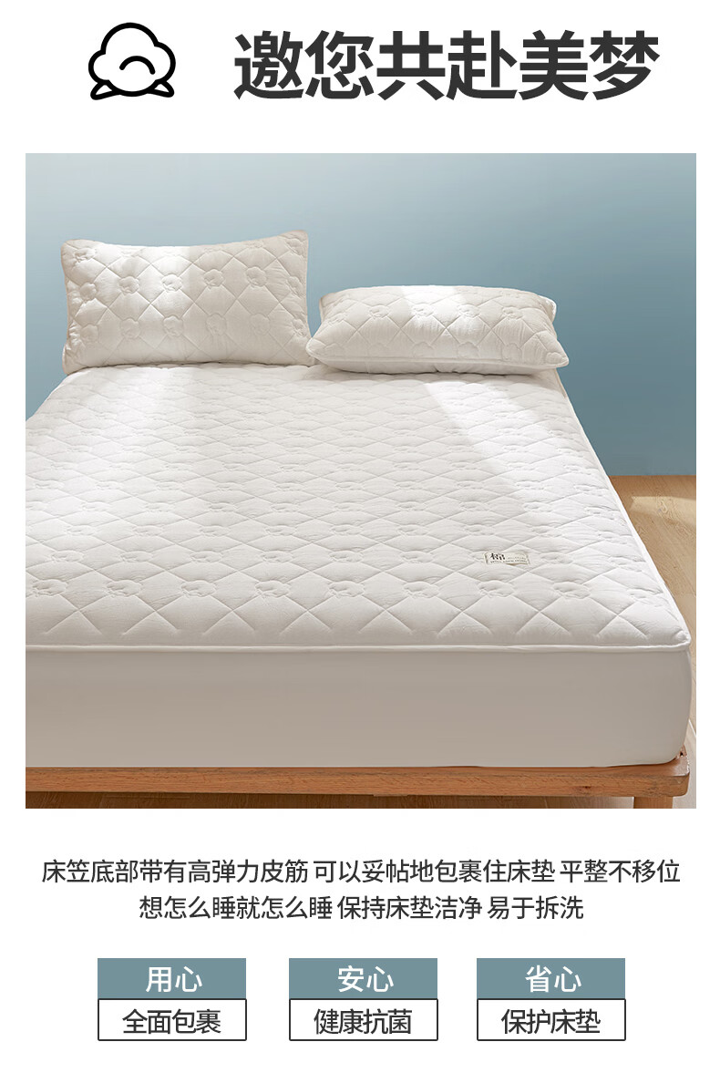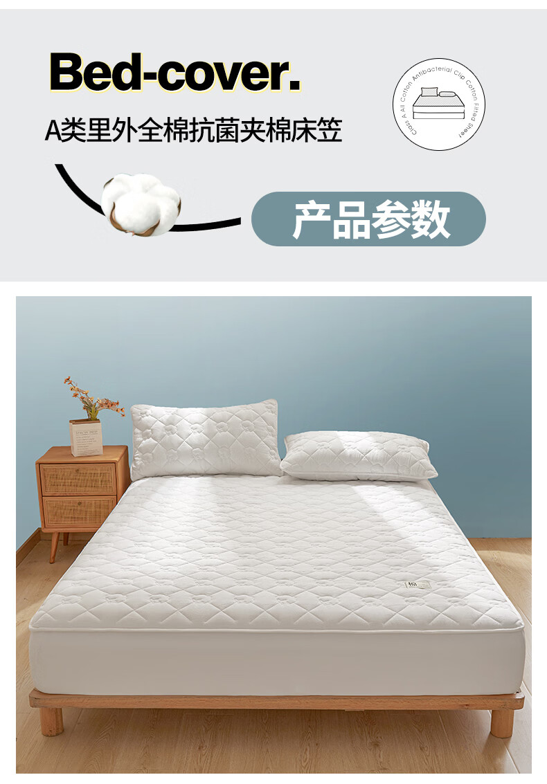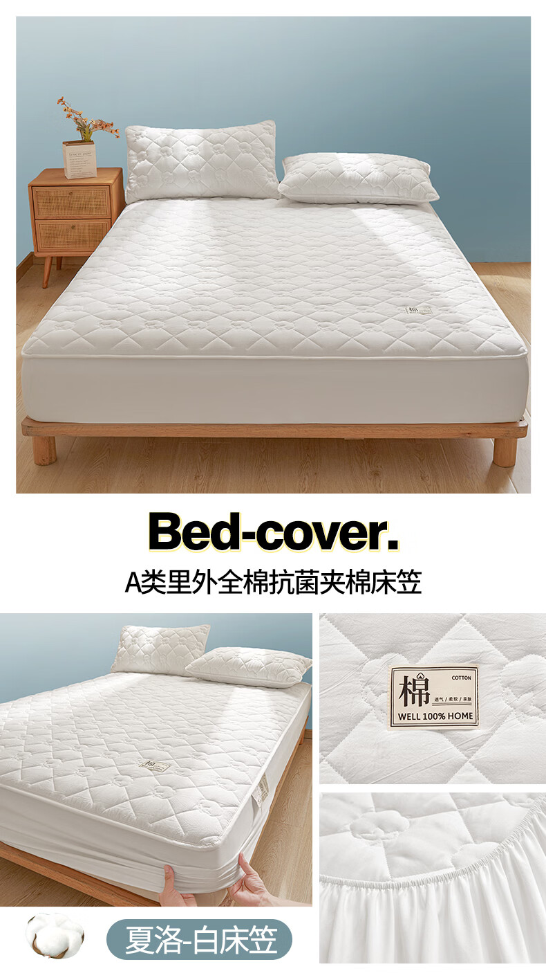 无印良品A类抗菌纯棉床笠1.5x2米100%全棉新疆棉花夹棉床罩防滑床垫保护套 夏洛-白 【A类抗菌 100%纯棉】 150cm*200cm 【单床笠】