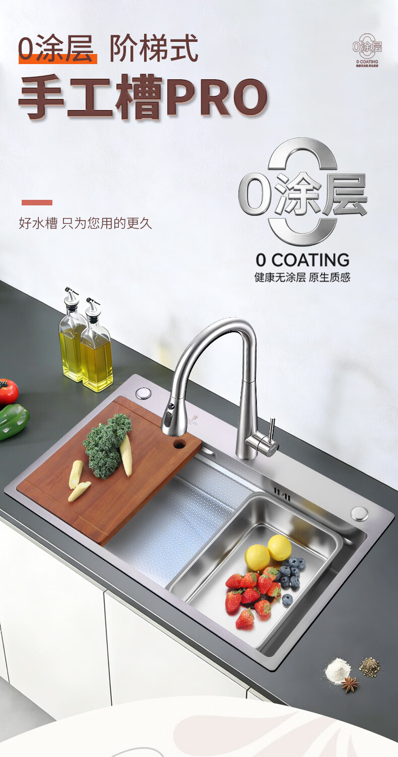 欧琳(OULIN)水槽米粒纹大单槽304不锈钢厨房洗菜盆阶梯水槽加厚面板洗碗槽 9165配小蛮腰三出水铜抽拉龙头 侧下水带菜板【9158H米粒压纹款】