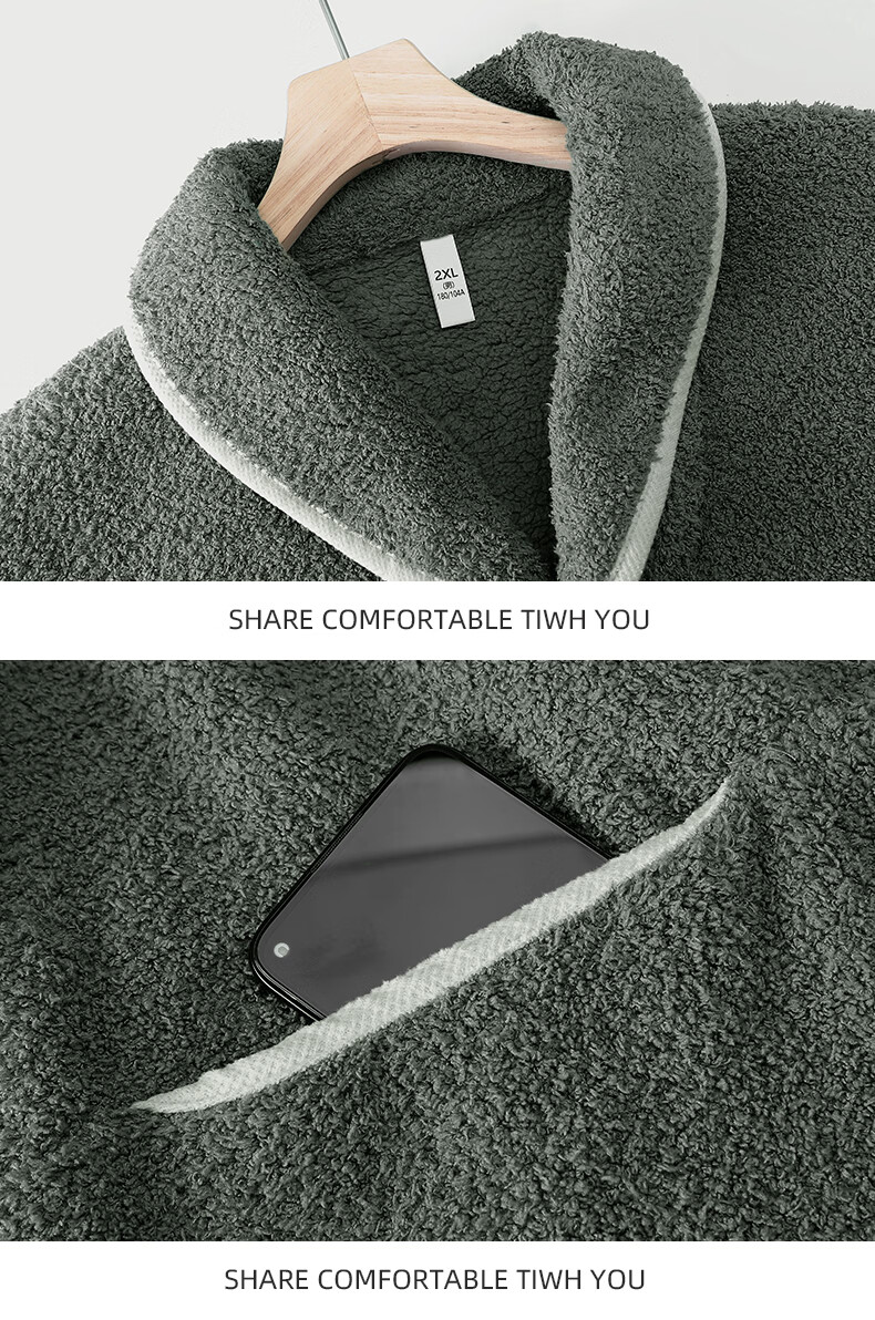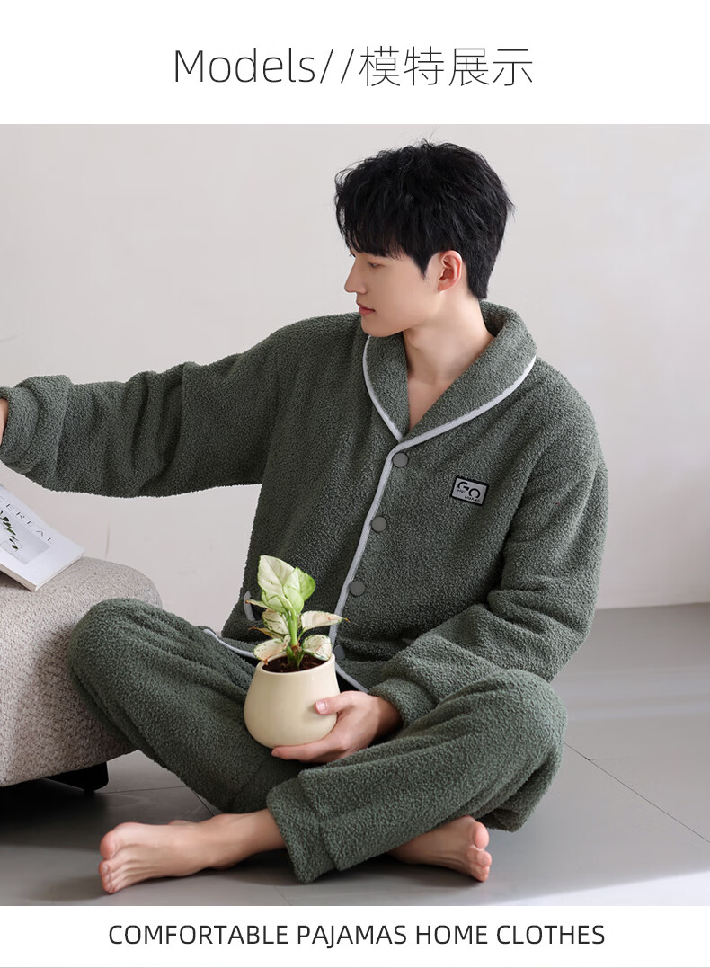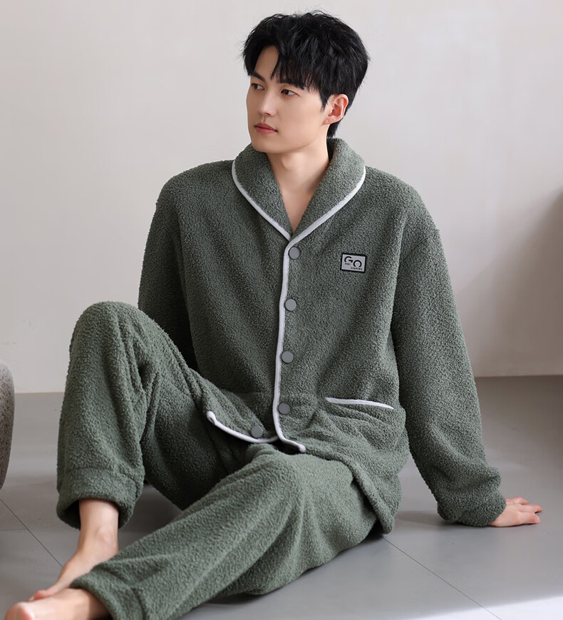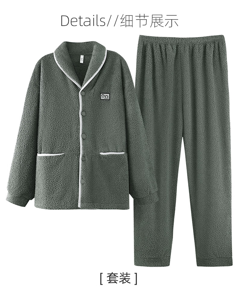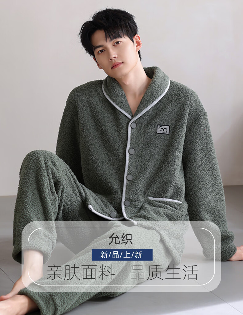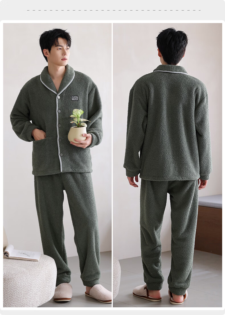 允织半边绒睡衣男士冬季加厚加绒秋冬款开衫高级感冬天家居服保暖套装 9060-锰绿 M (165) :建议100-120斤穿着