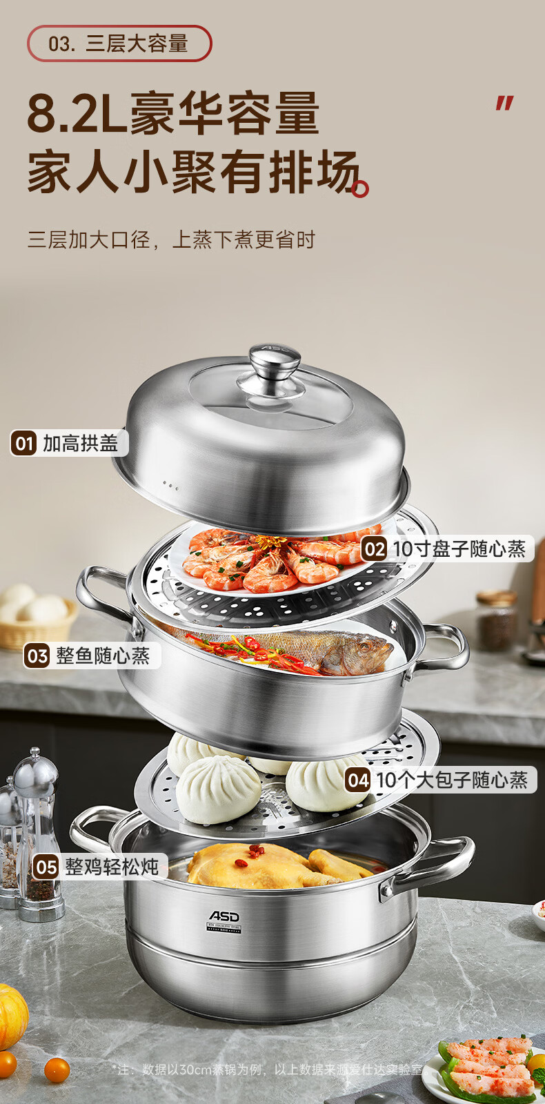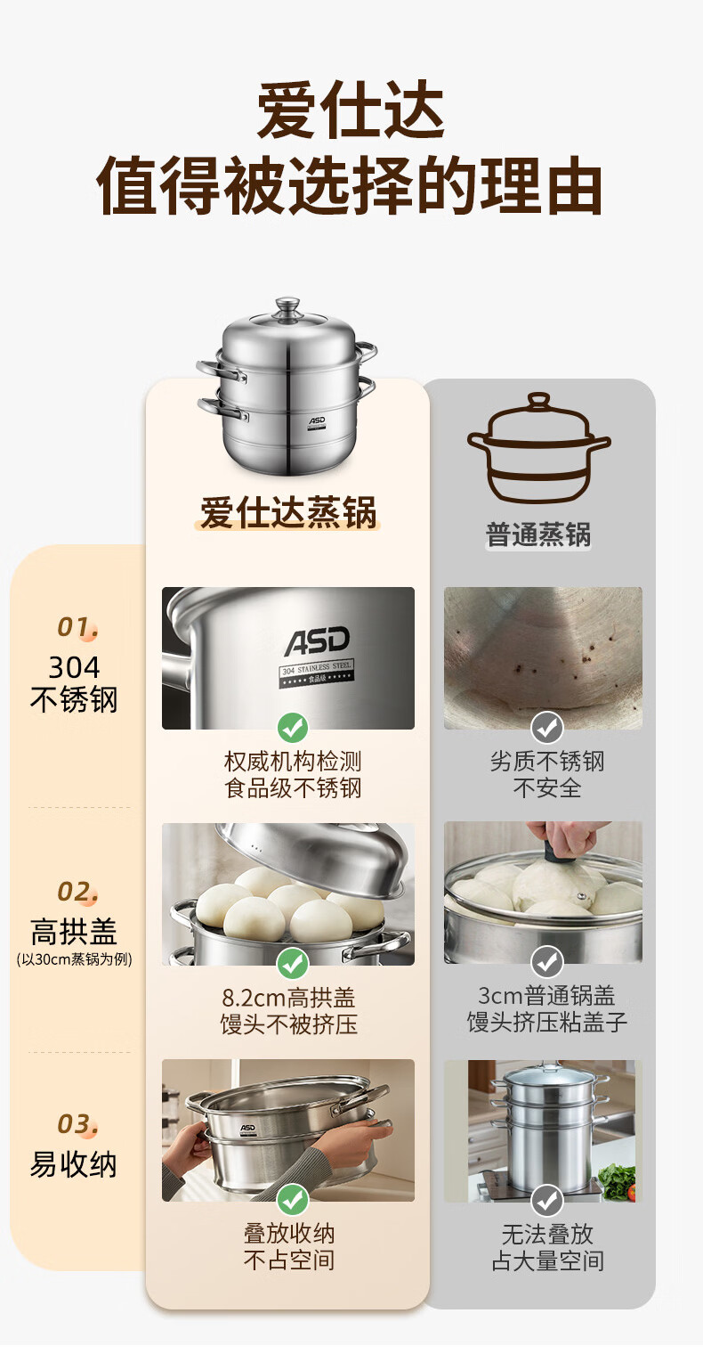 爱仕达(ASD)蒸锅304不锈钢三层家用蒸煮炖汤锅 大容量30CM双层蒸笼燃气通用G3