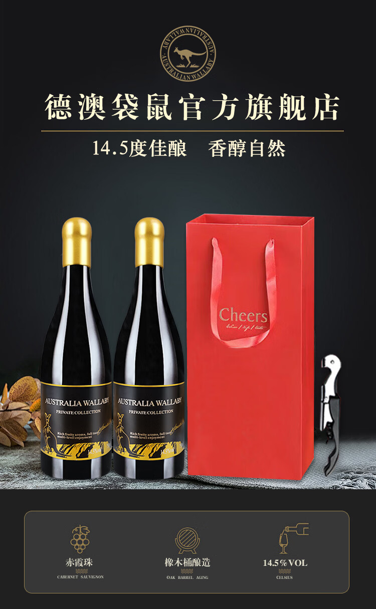 德澳袋鼠【旗舰店】澳大利亚进口红酒干红葡萄酒赤霞珠送礼袋团购750ml*2 经典14.5度双支礼袋(送海马刀)