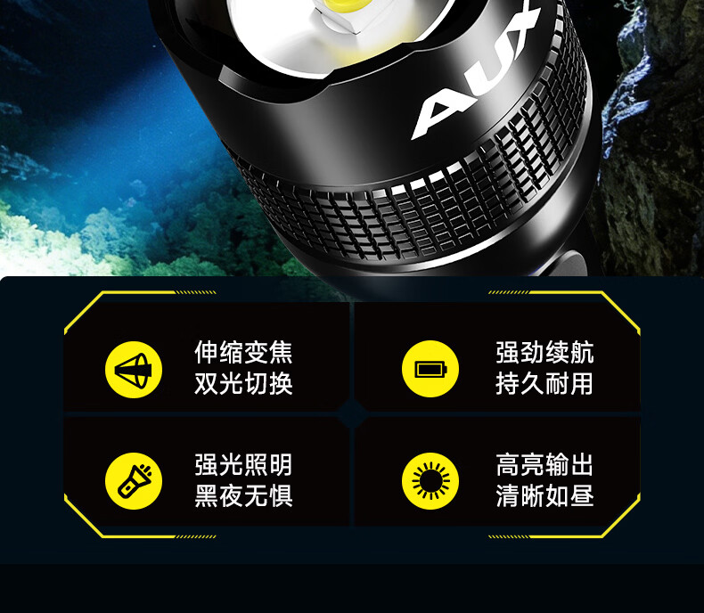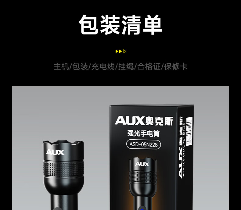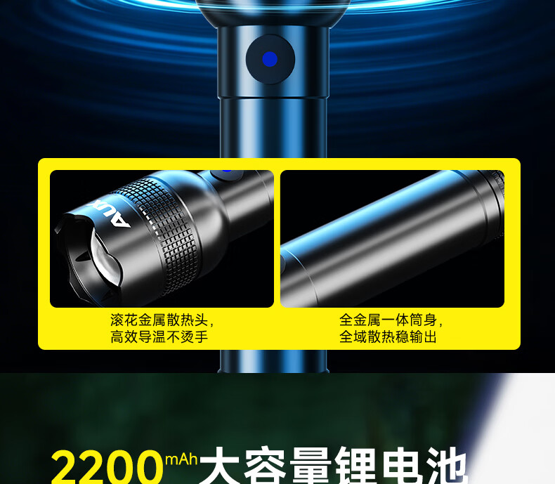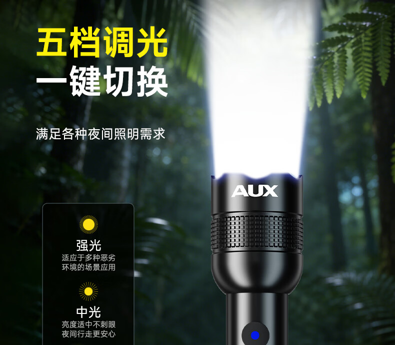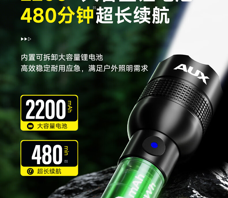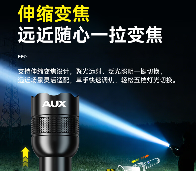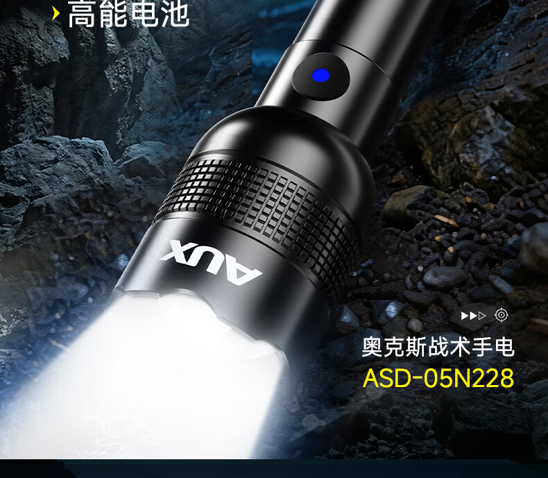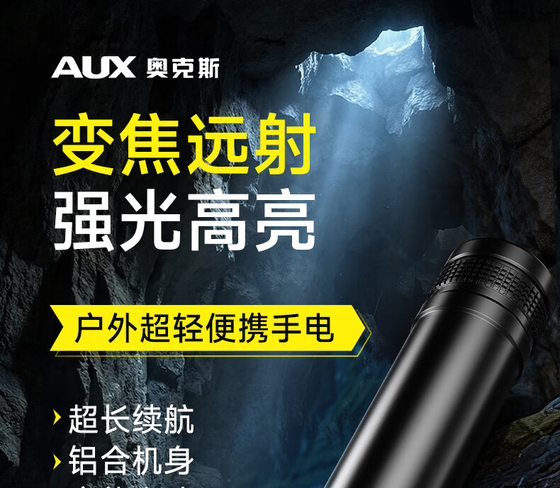 奥克斯(AUX)手电筒强光超亮长续航野外生存变焦军小型便携家专用穿天炮应急灯 【穿天炮】铝合金+变焦+2200毫安*2
