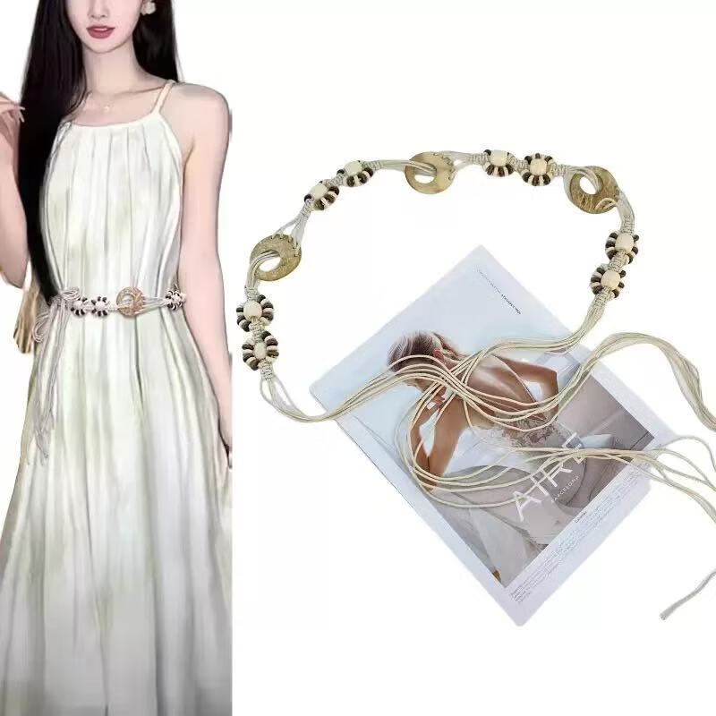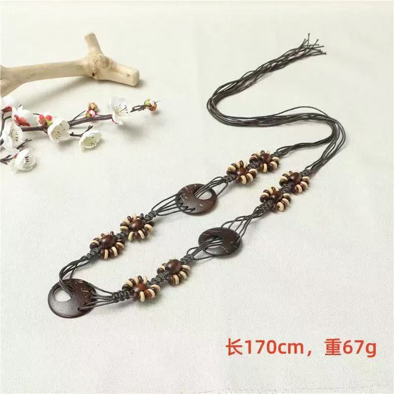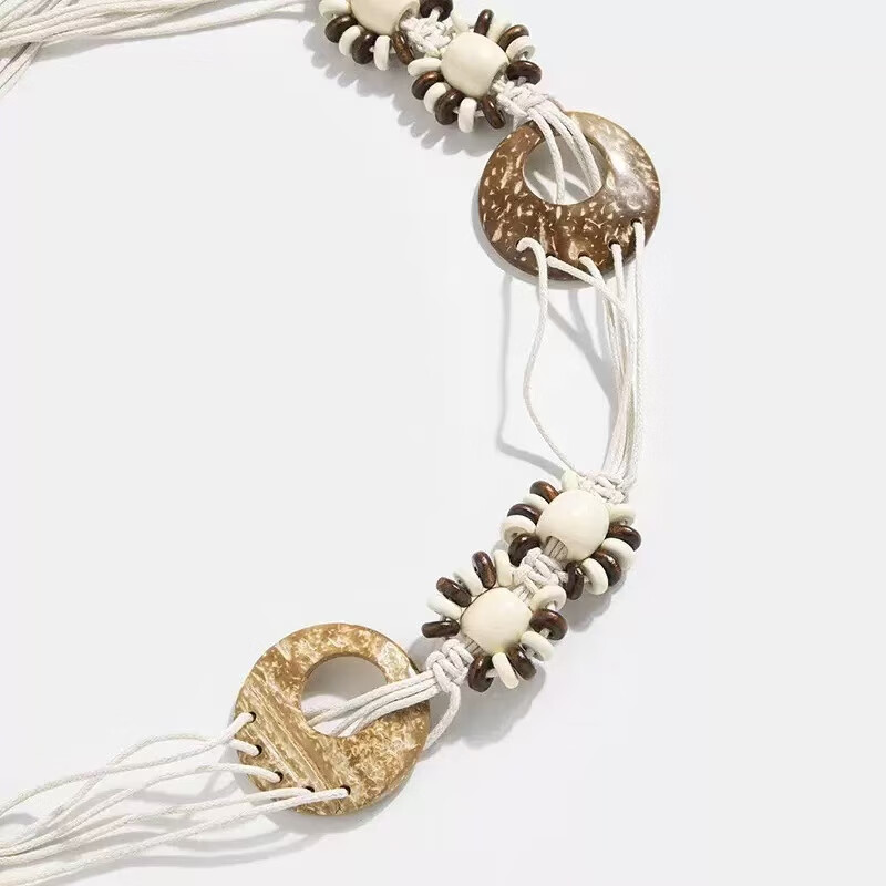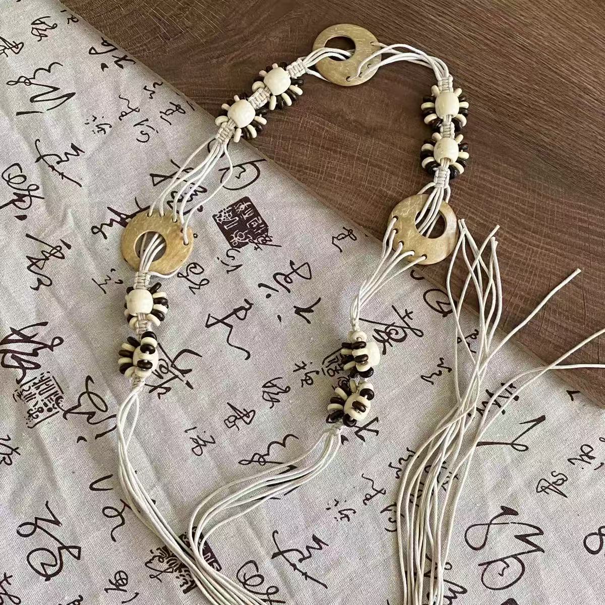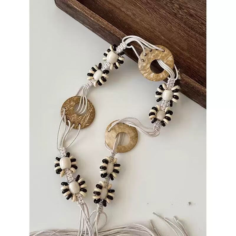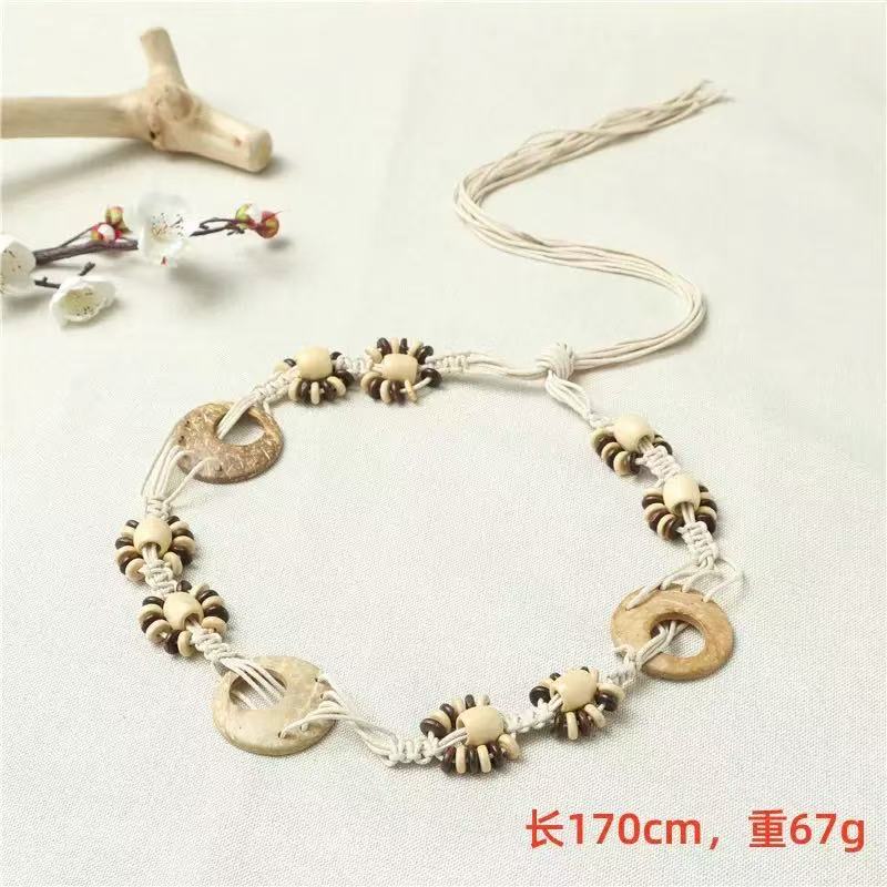 新款手工编织腰链女民族风铃铛腰带女装饰配饰汉服腰绳 黑色椰壳腰链 170cm