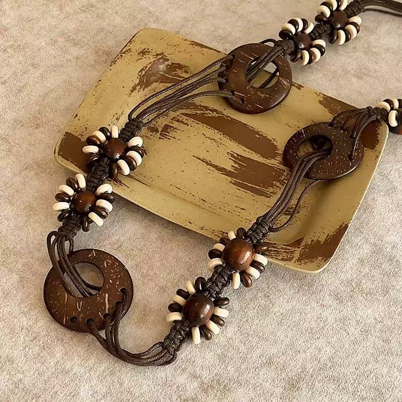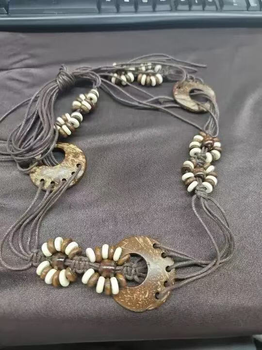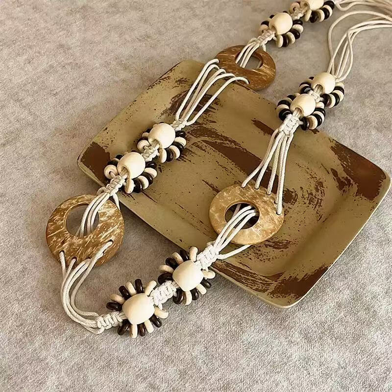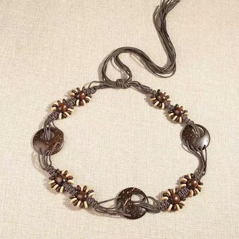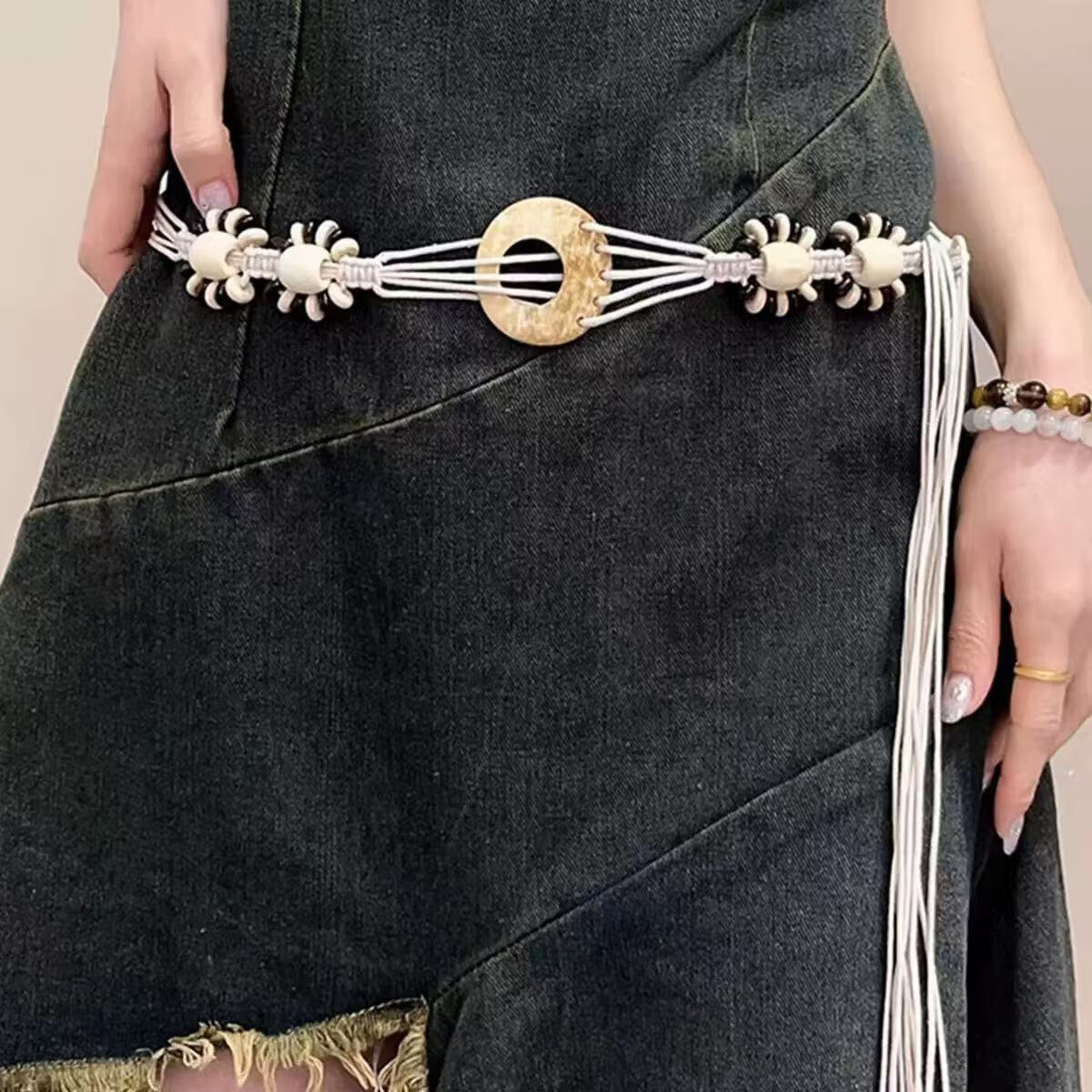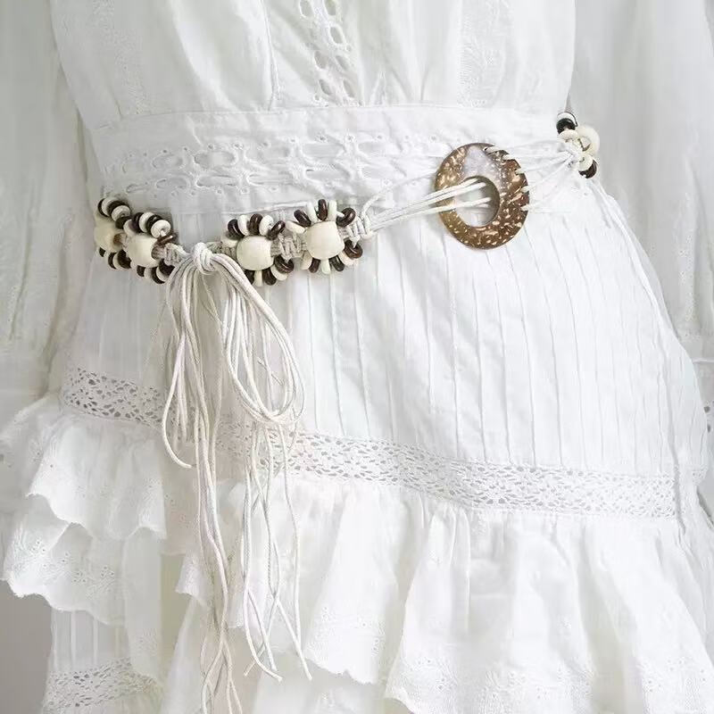 新款手工编织腰链女民族风铃铛腰带女装饰配饰汉服腰绳 黑色椰壳腰链 170cm