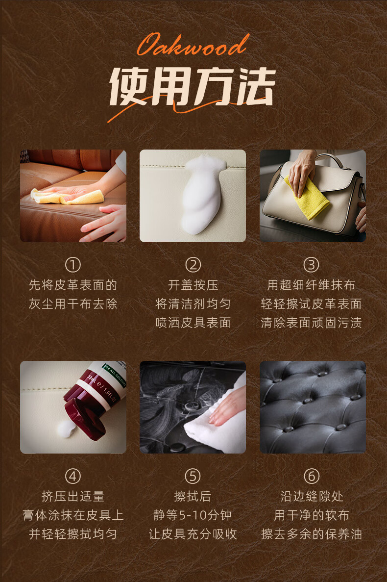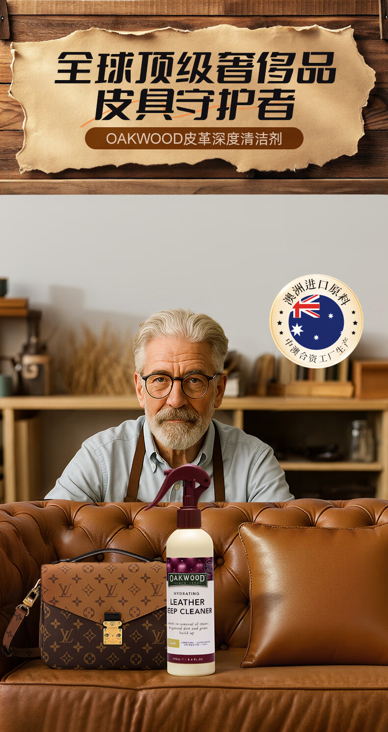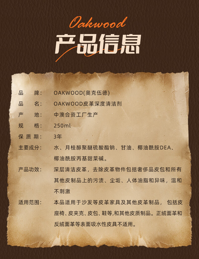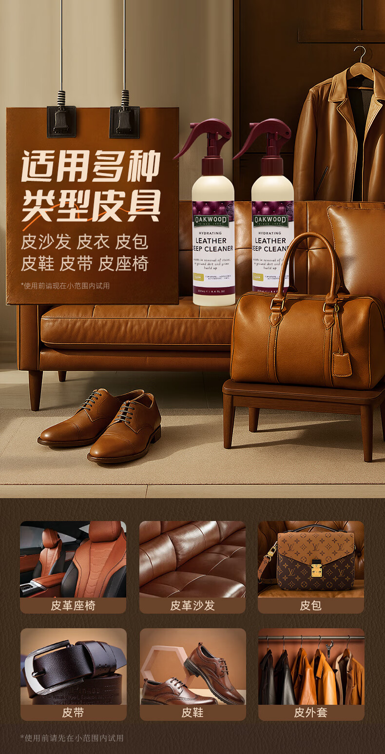 OAKWOOD奥克伍德皮革清洁剂250ml 真皮沙发座椅轻奢皮具皮衣皮包除霉清洁