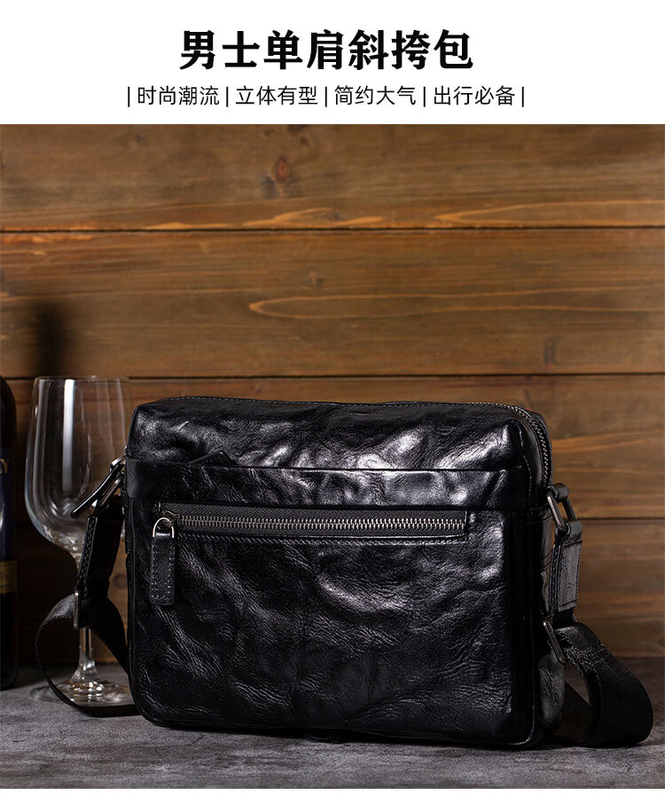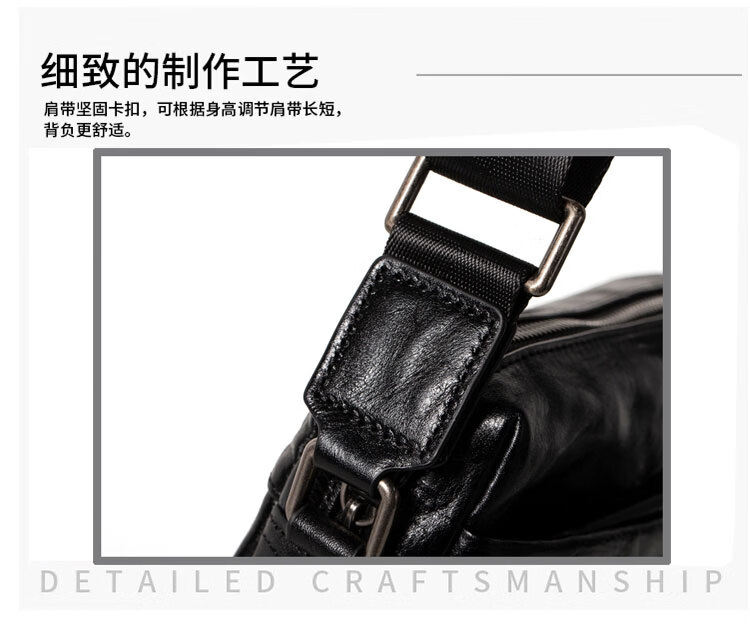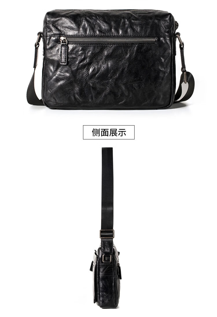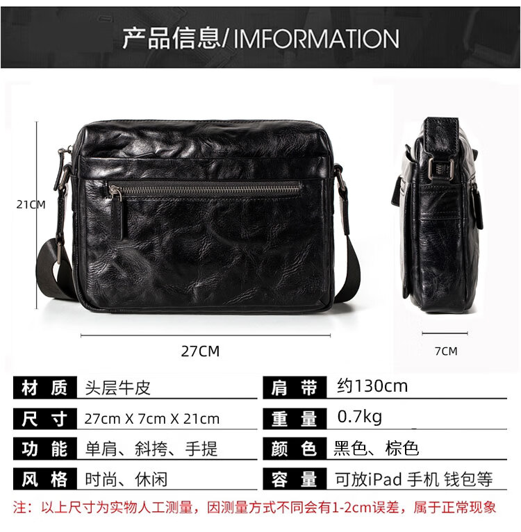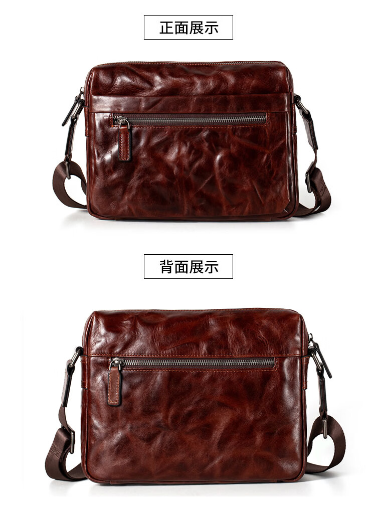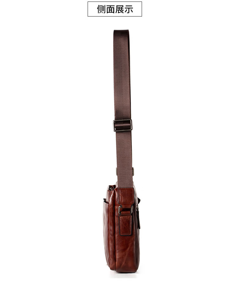 巴利迪亚男士真皮单肩包新款植鞣头层牛皮斜挎包横款高端时尚大容量男包 咖啡色