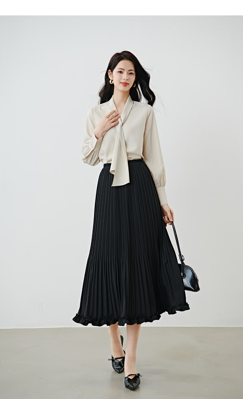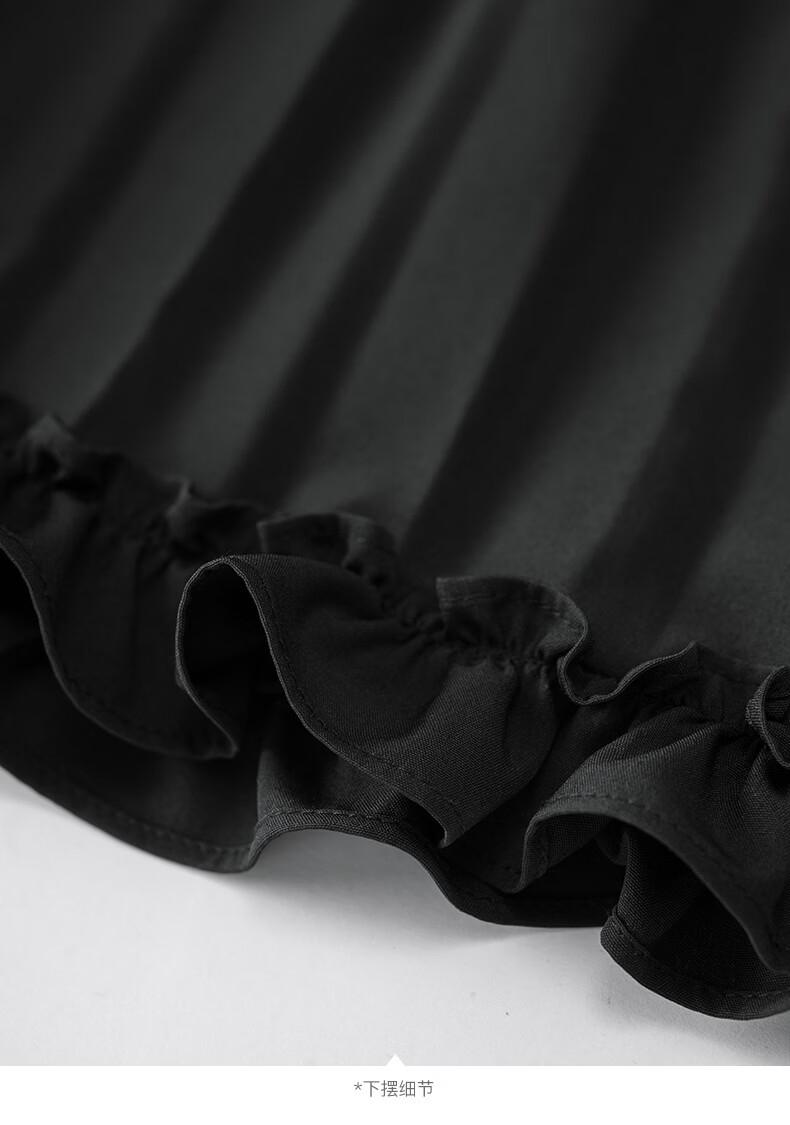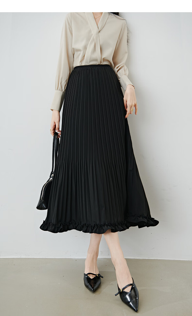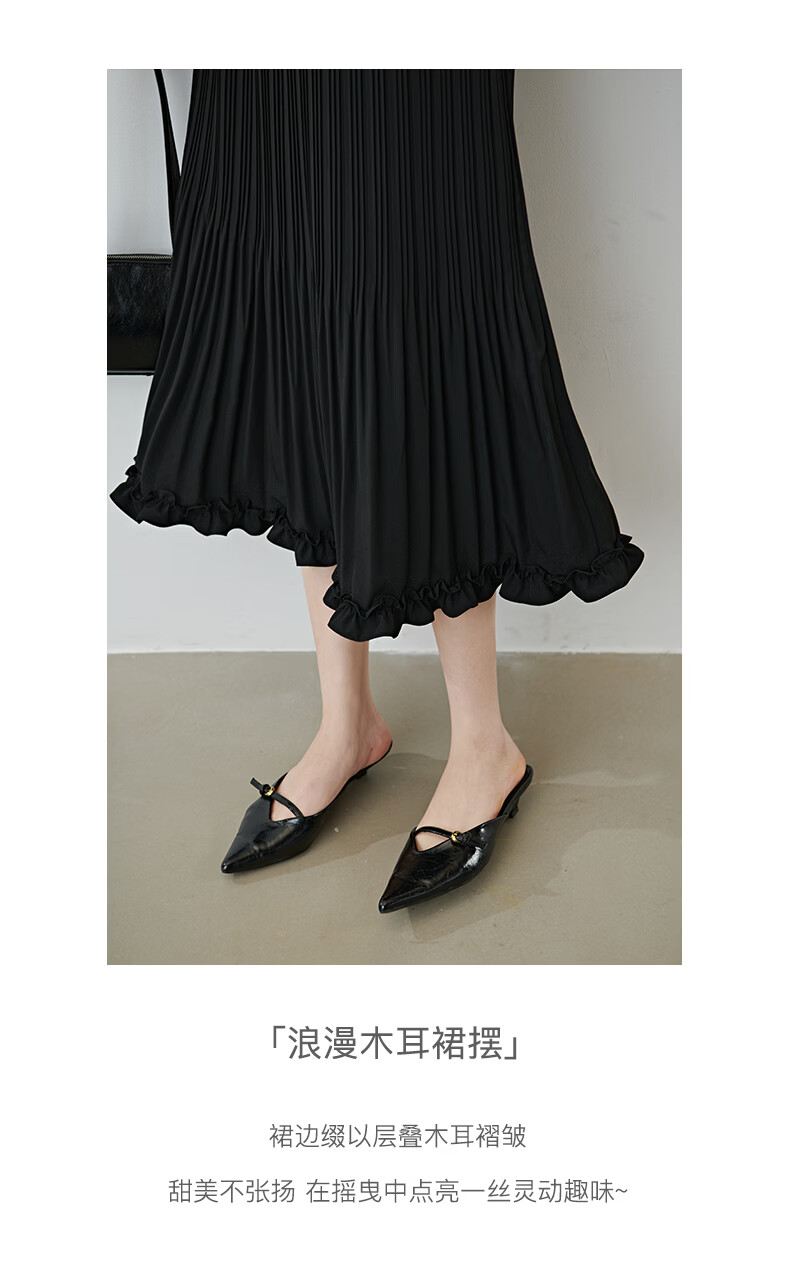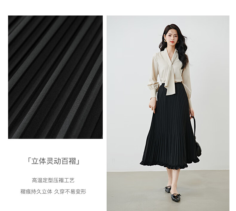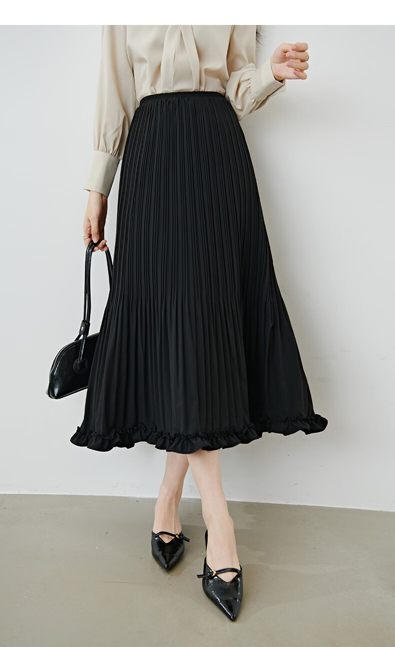 晚白【新品】2026年春款弹力松紧腰半裙显瘦垂顺重工花瓣木耳边百褶裙 黑色 XL