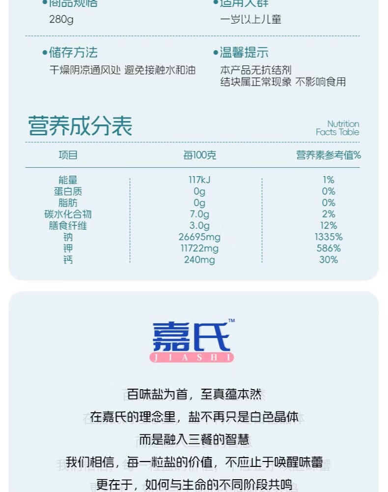 嘉氏高钙低钠铁锌儿童专用食盐辅食婴儿宝宝盐不加碘零添加抗结剂 【尝鲜款不划算】1袋*280g