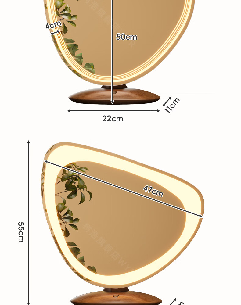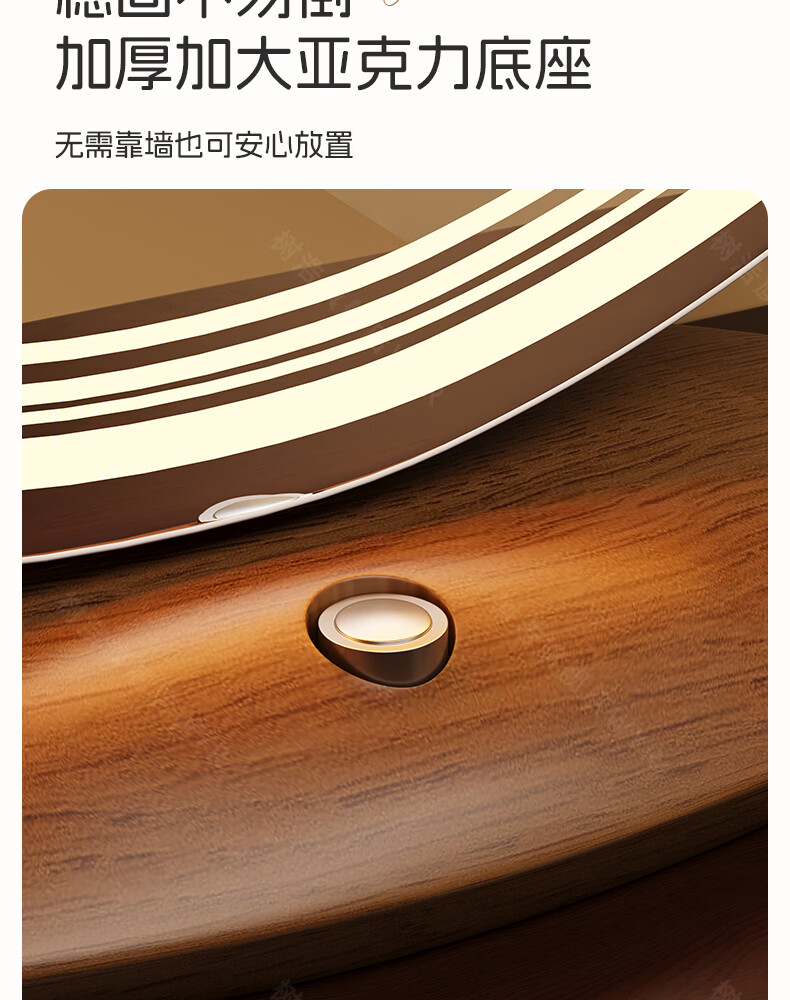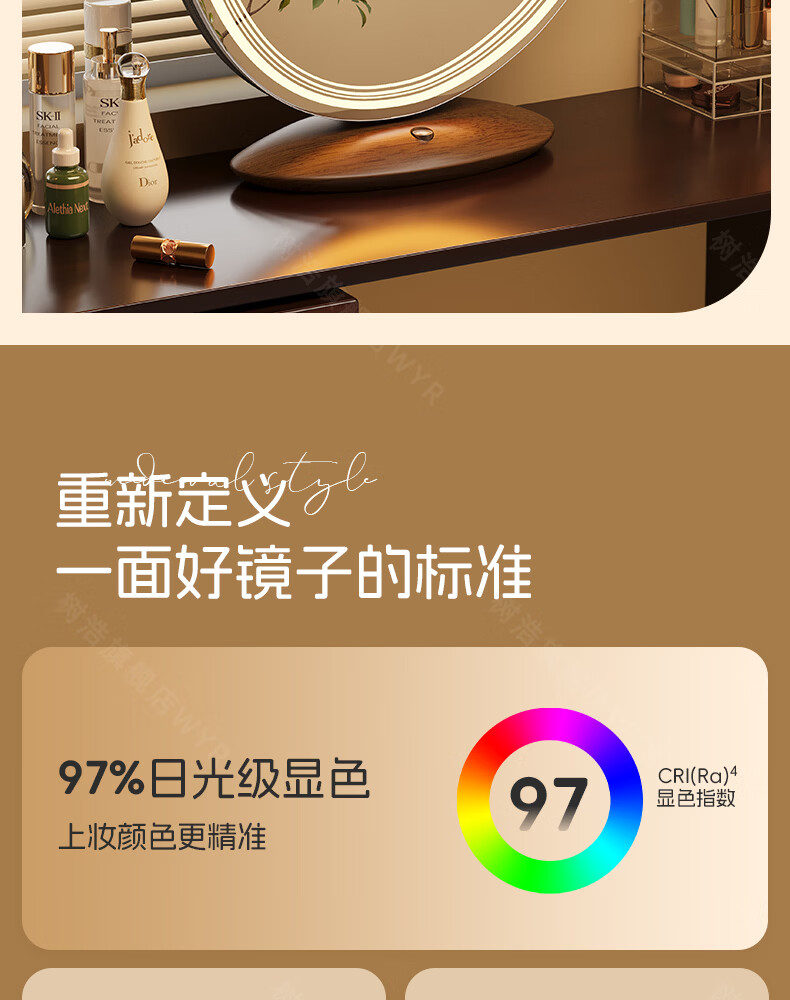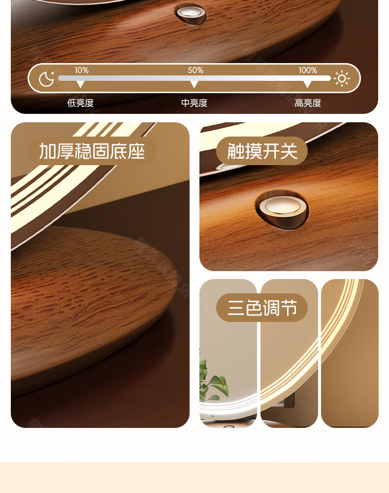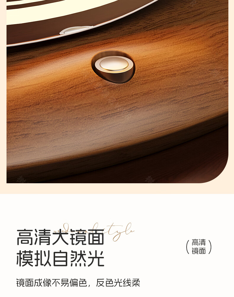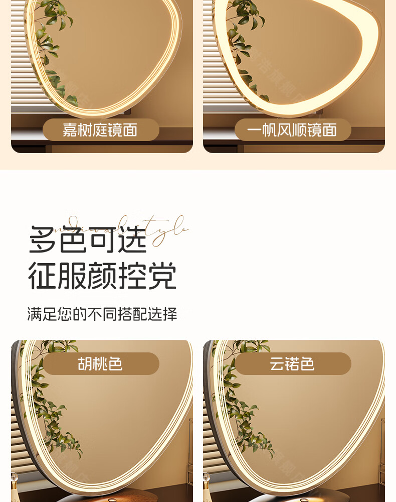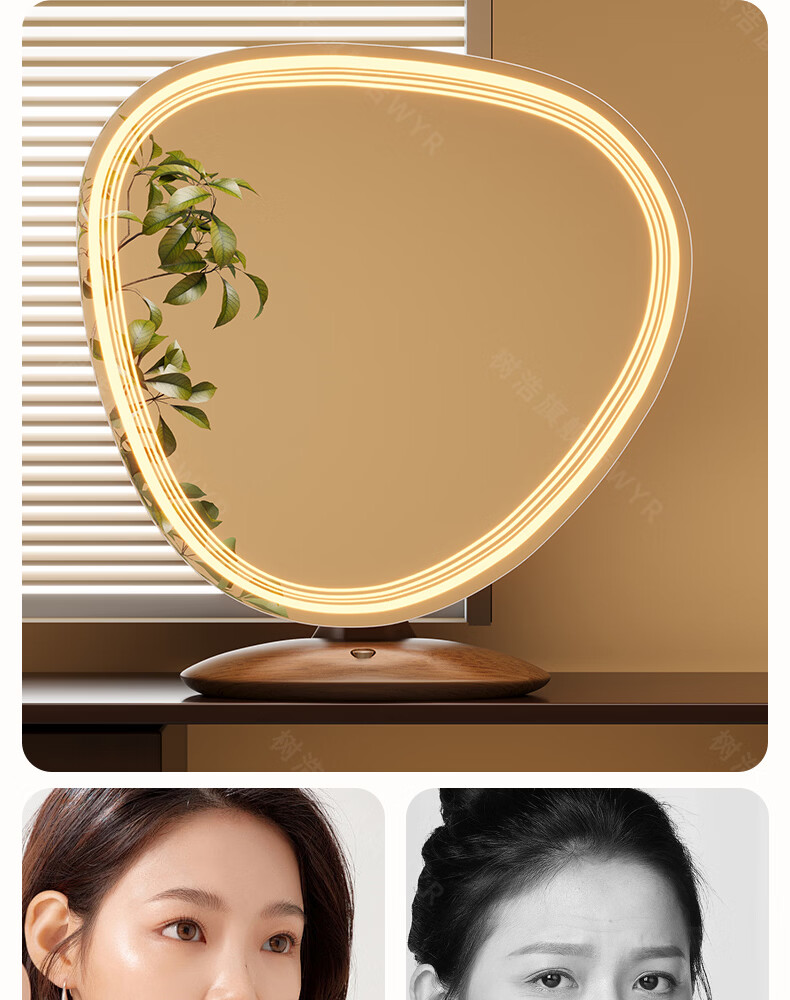 树浩智能化妆镜台式桌面美妆镜卧室led带灯梳妆镜家用高清调光小镜子 【嘉树庭】胡桃底座 皮革包边48*50cm-智能三色调节
