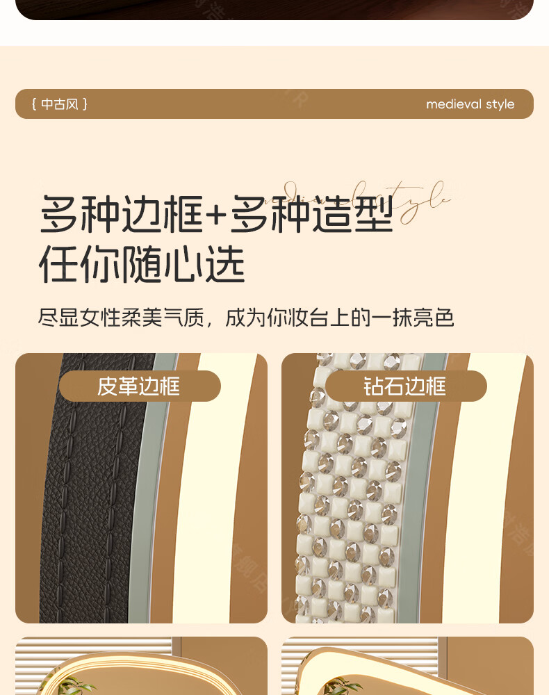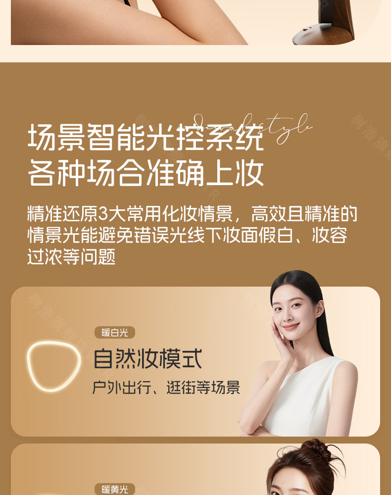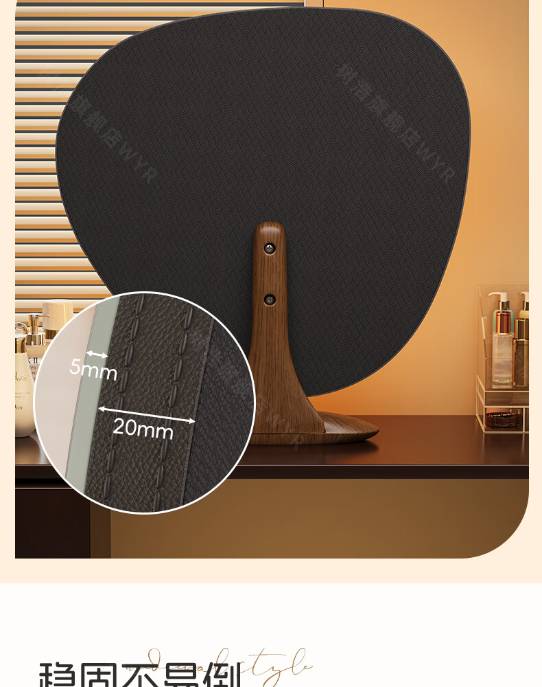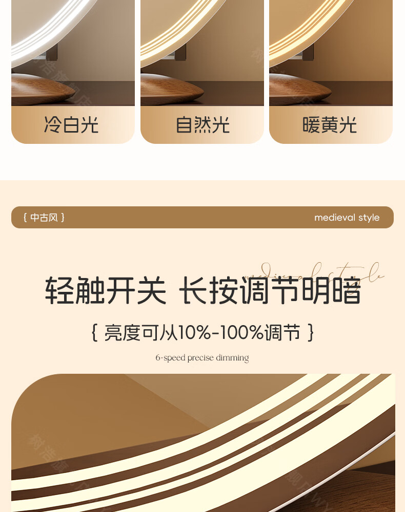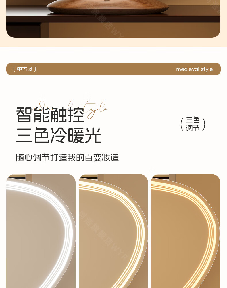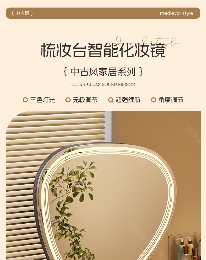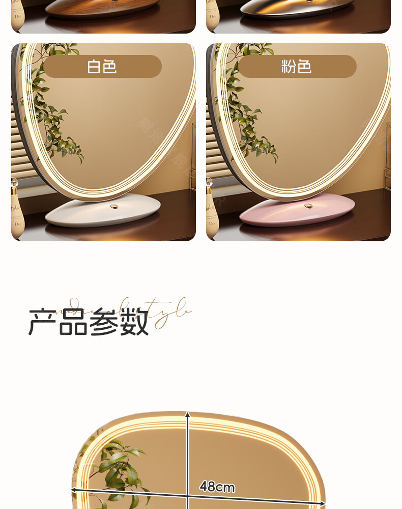 树浩智能化妆镜台式桌面美妆镜卧室led带灯梳妆镜家用高清调光小镜子 【嘉树庭】胡桃底座 皮革包边48*50cm-智能三色调节