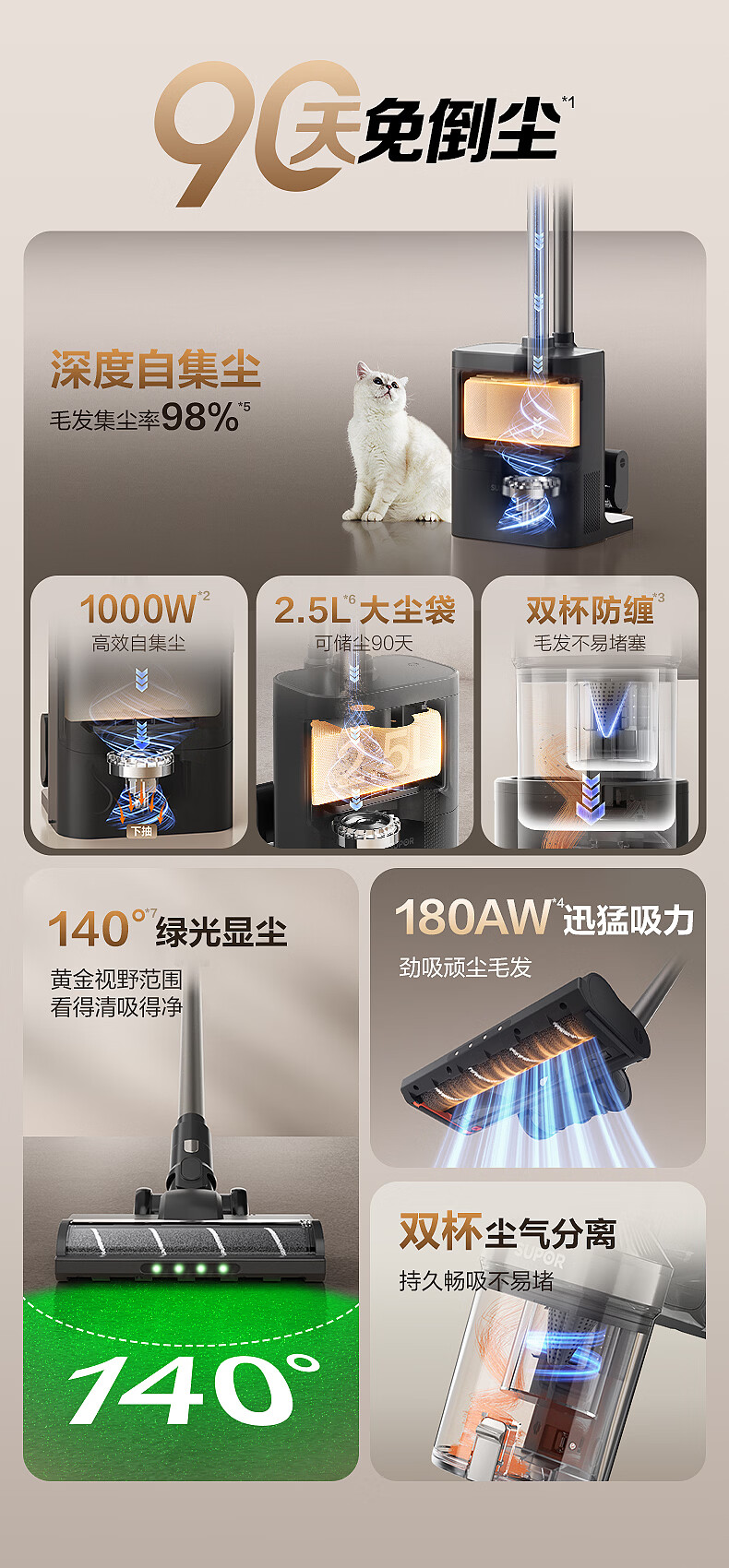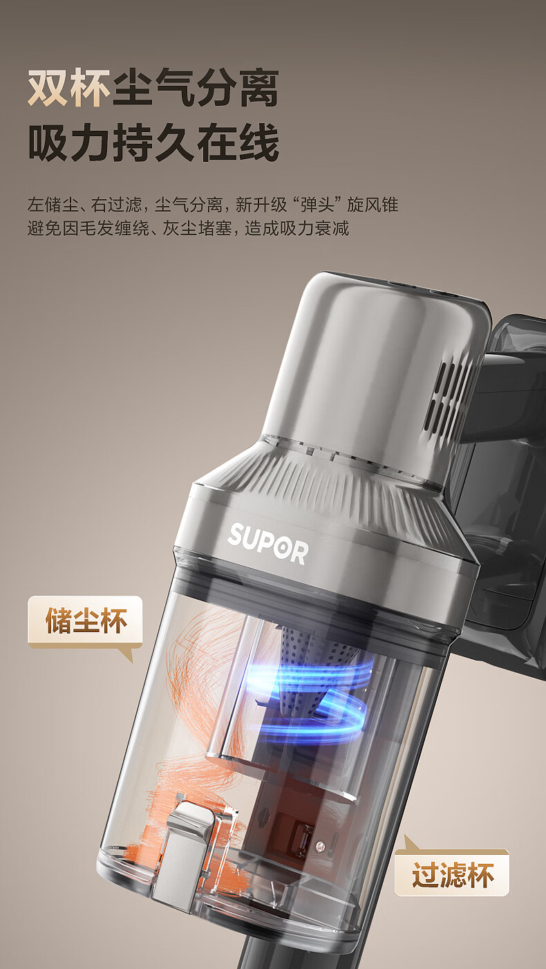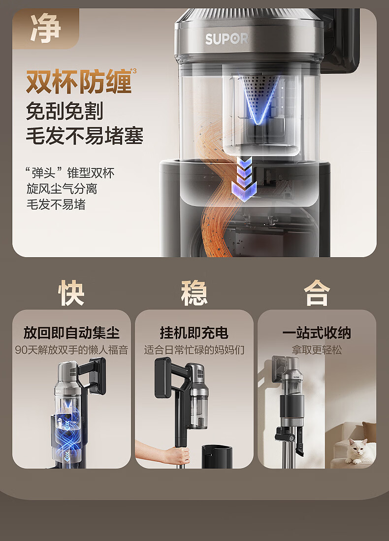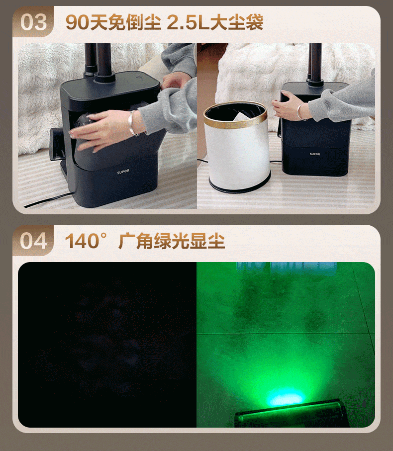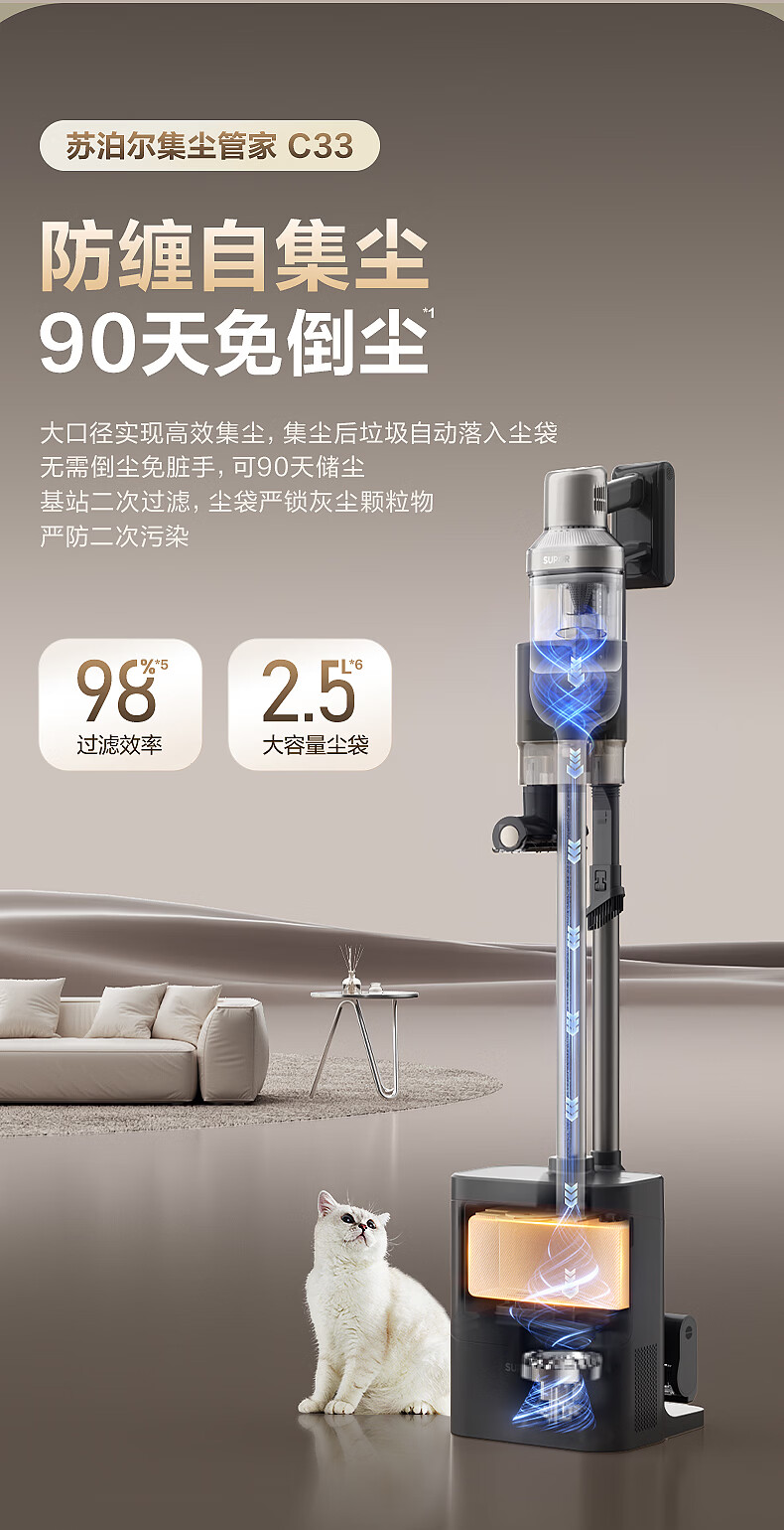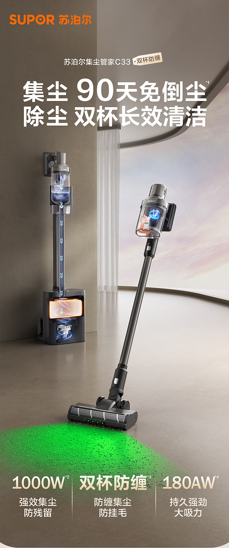 苏泊尔吸尘器自集尘基站【双杯防缠】家用手持无线大吸力集尘管家绿光除螨毛发防缠新年礼物EVS-C33-SL