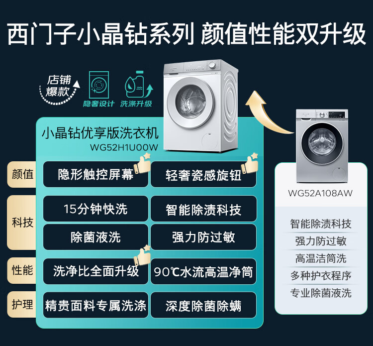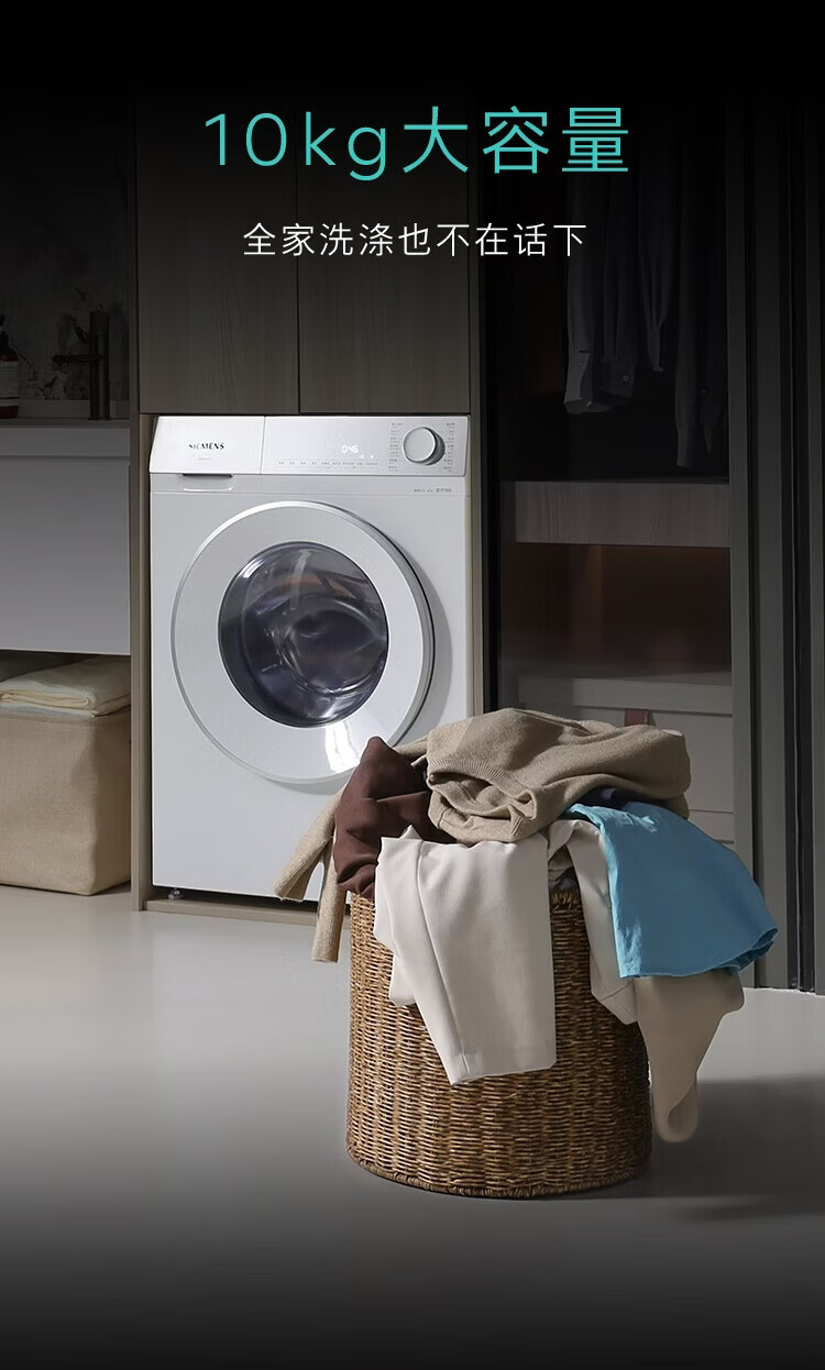 西门子(SIEMENS)【108A升级】小晶钻优享 10KG大容量全自动滚筒洗衣机 隐奢面板 智能除渍 羽绒服洗WG52H1U00W国补