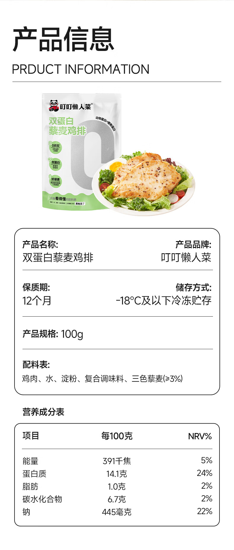 叮叮懒人菜双蛋白藜麦鸡排100g 营养早餐 高蛋白升级健身儿童早餐 双蛋白藜麦鸡排*3袋