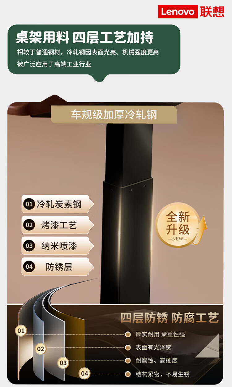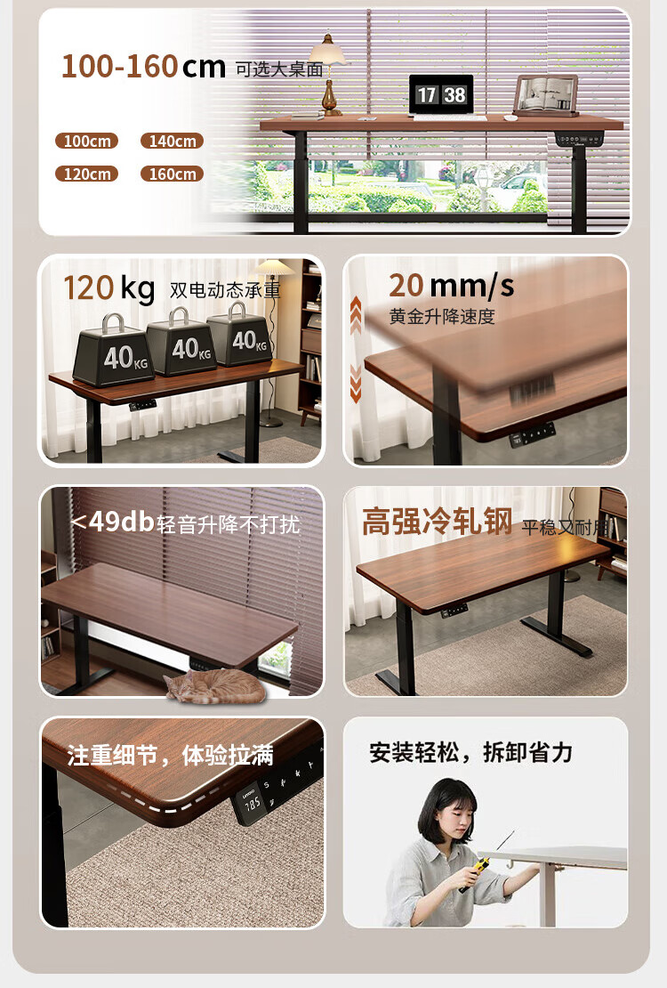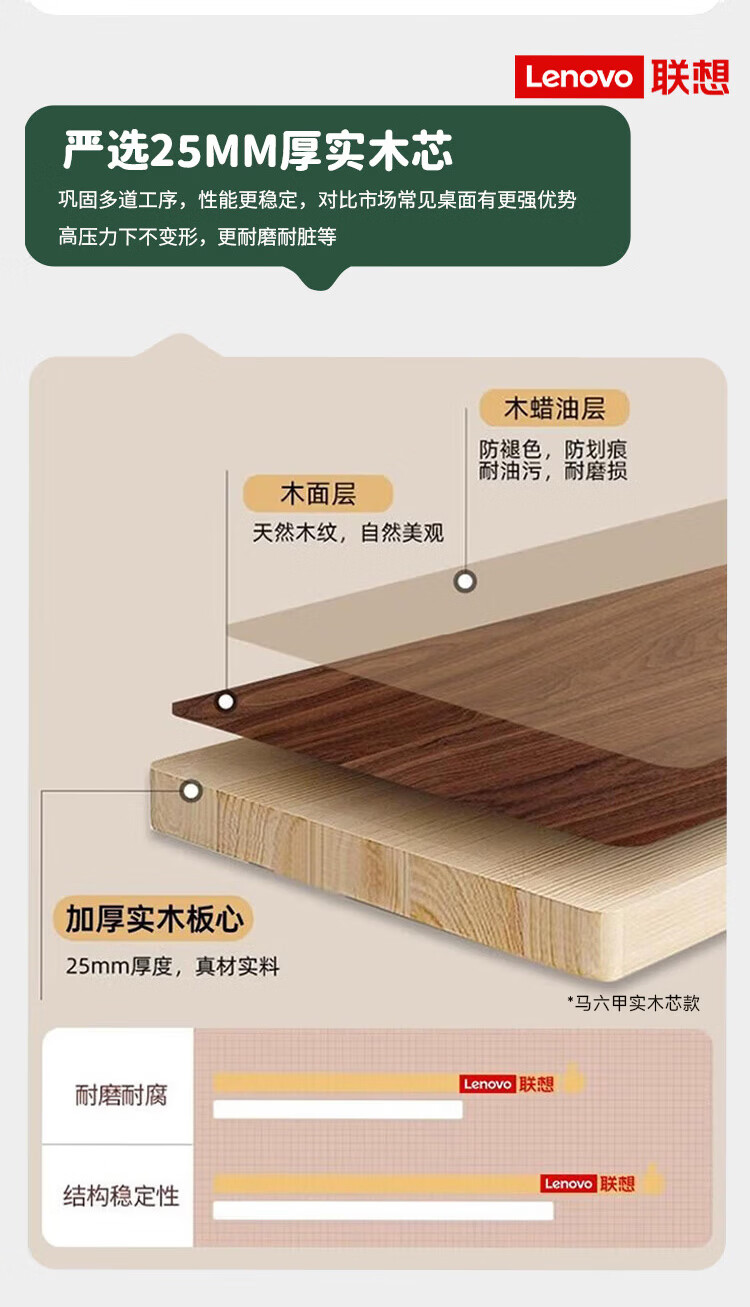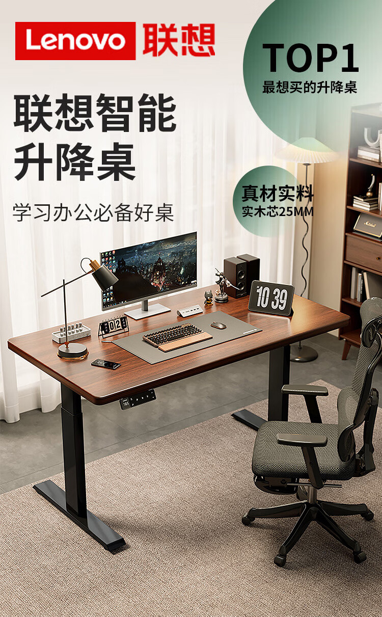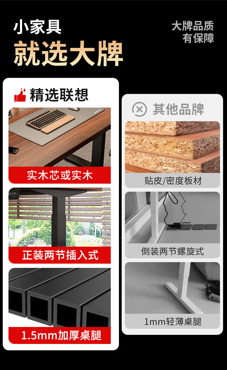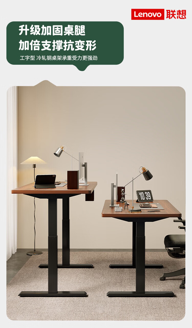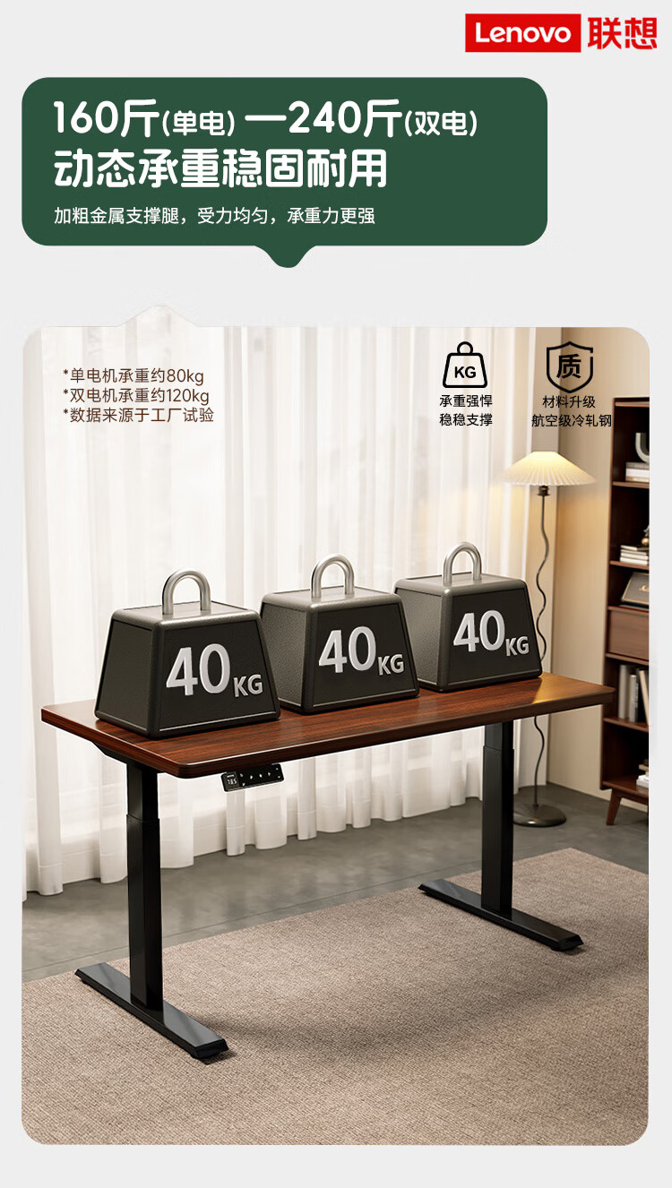 联想电动智能升降桌实木芯电脑桌站立办公家用学习书桌办公工作台桌子 【智能升降H2 承重120kg】双电机实木芯碳纤维黑-白架 160*70cm【25mm实木芯桌面 正装2节】