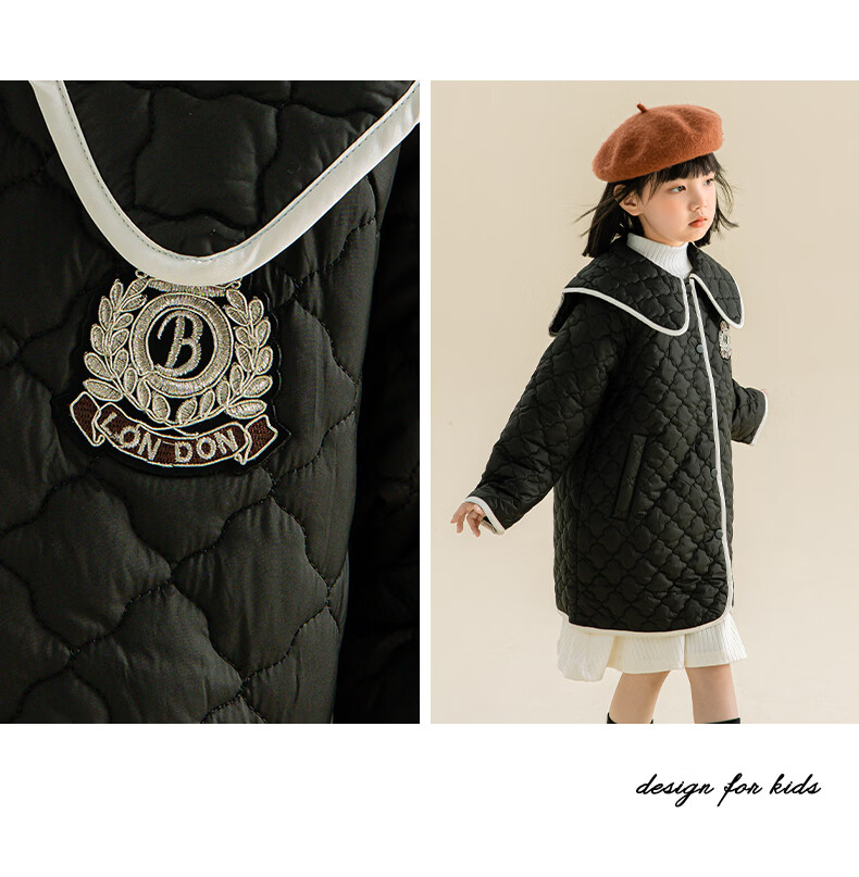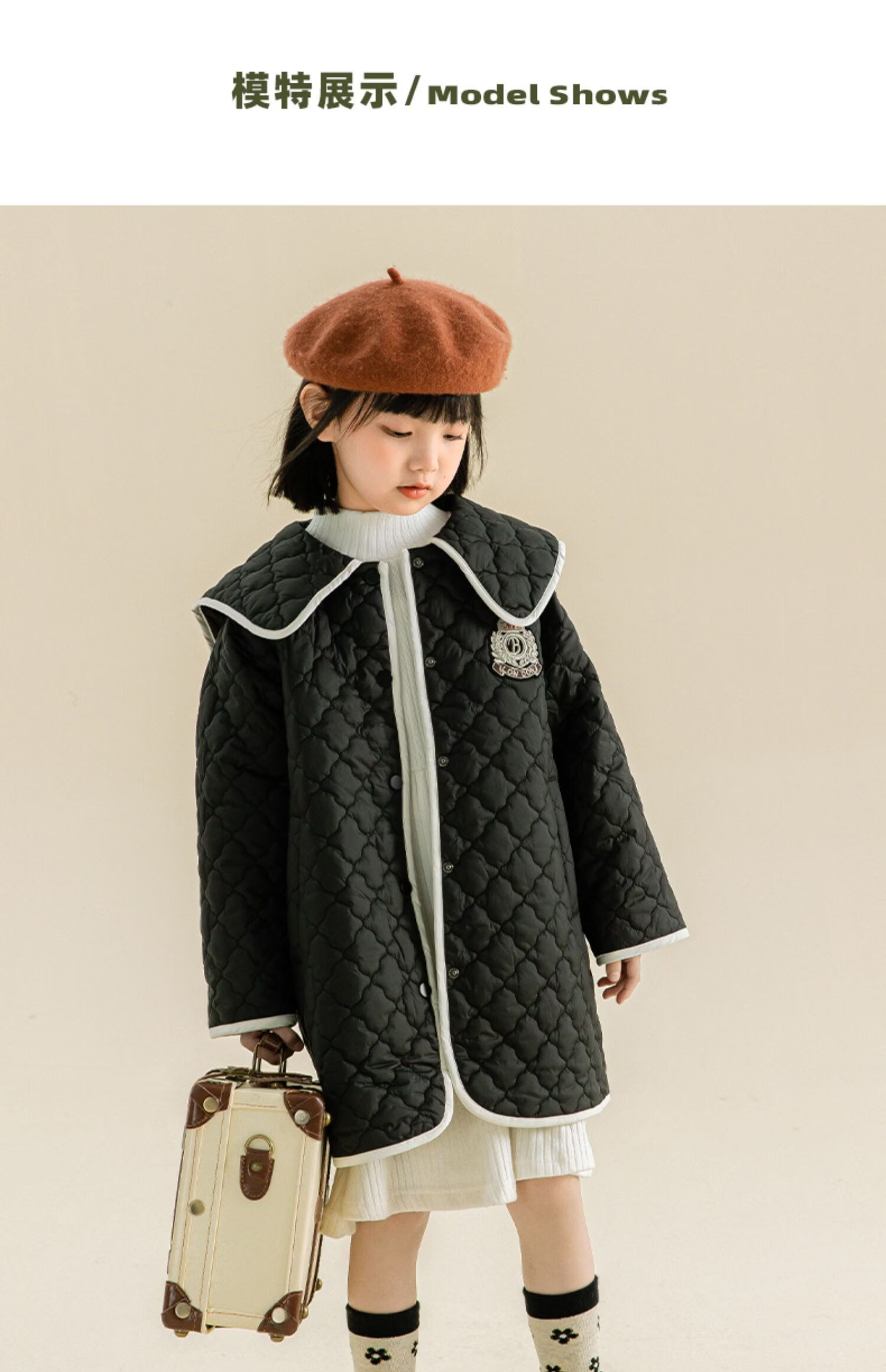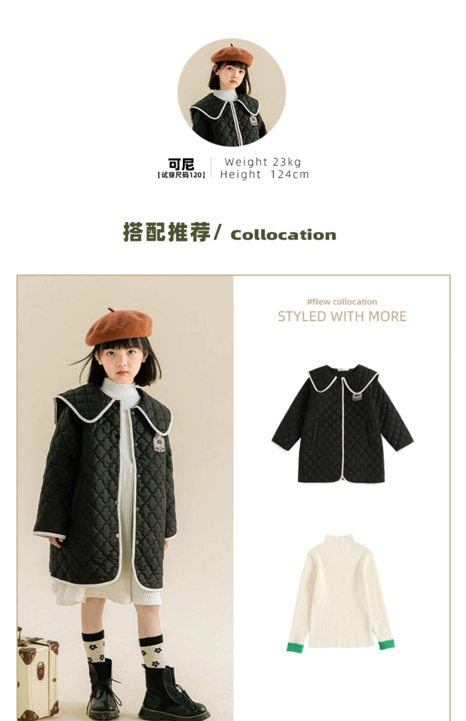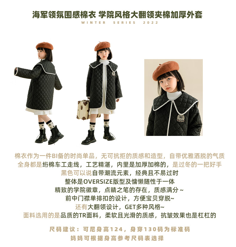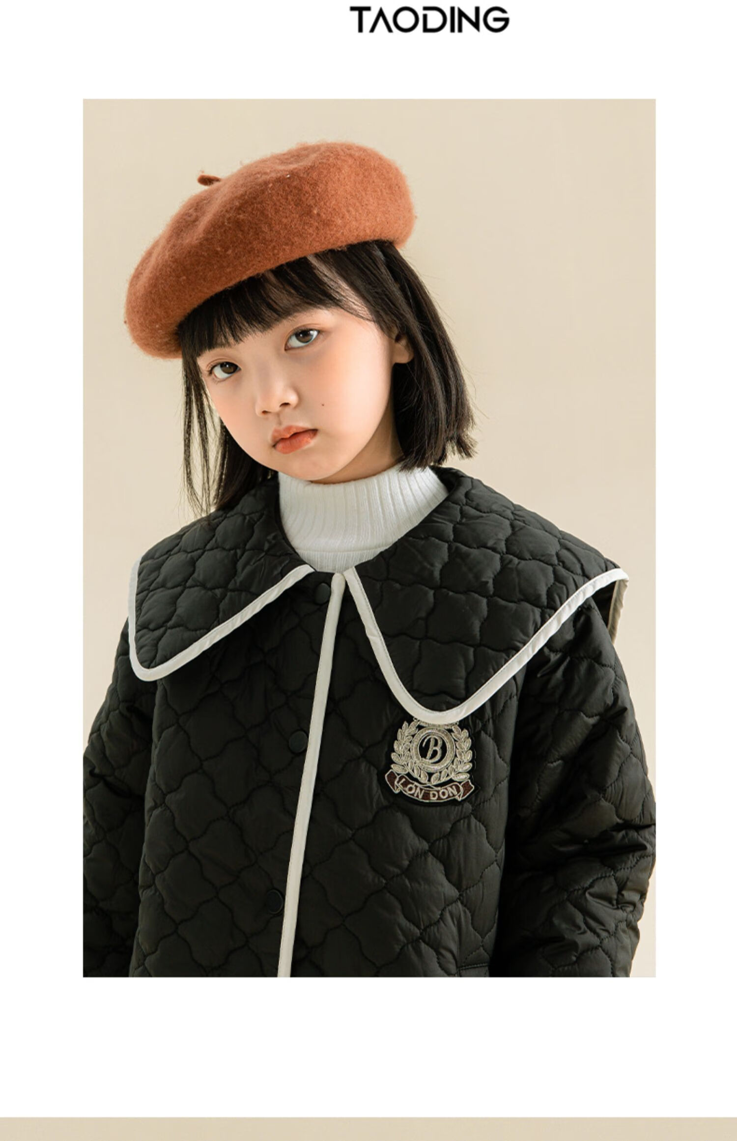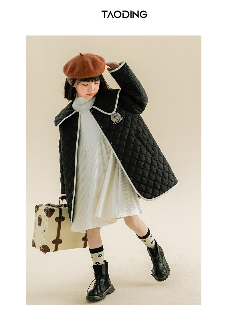 淘町女童冬季棉衣新款保暖中长款娃娃领棉袄休闲洋气时髦冬装外套 黑色 150