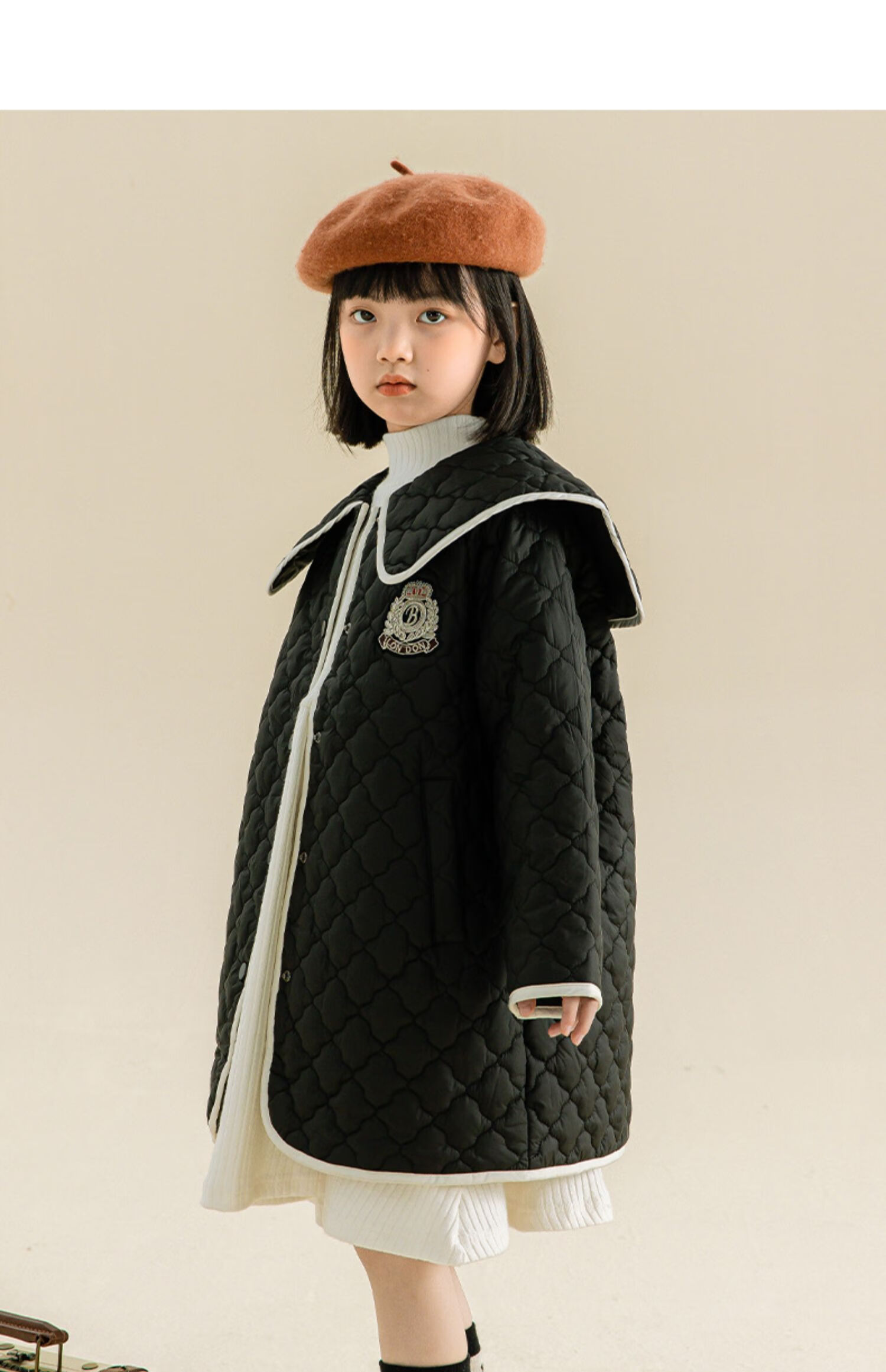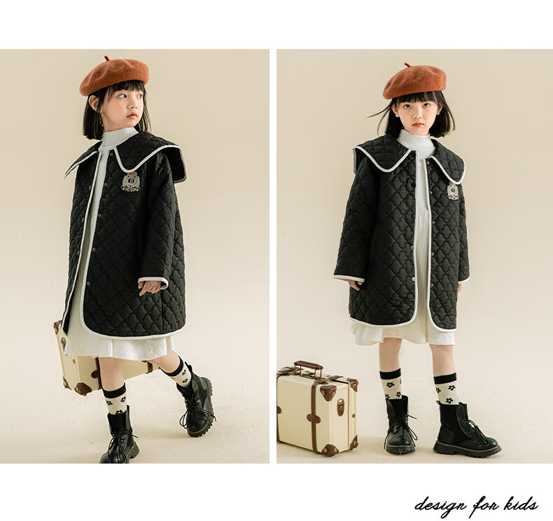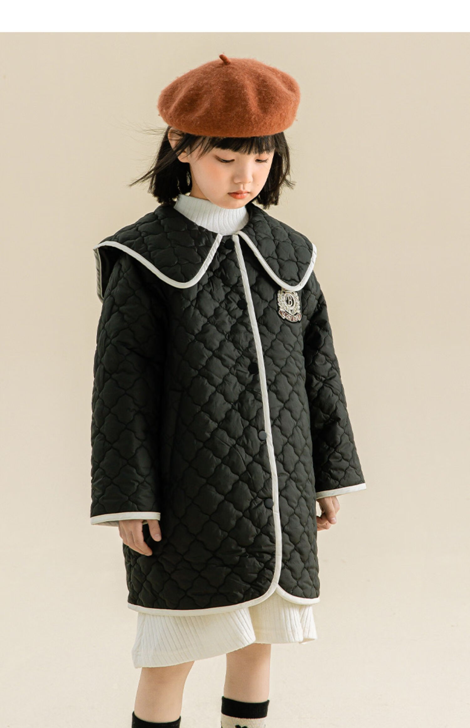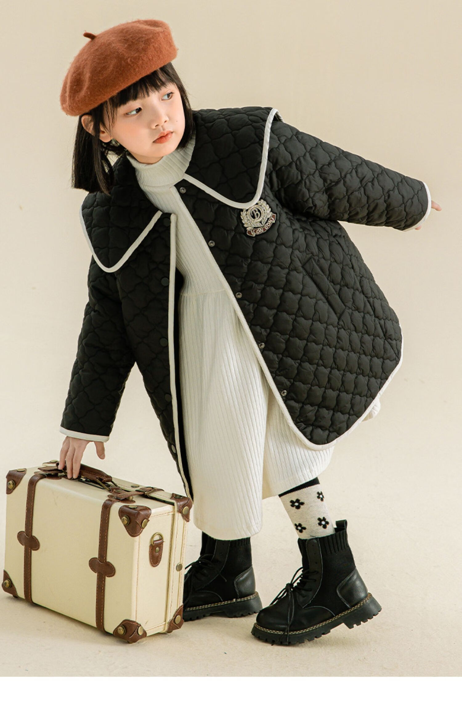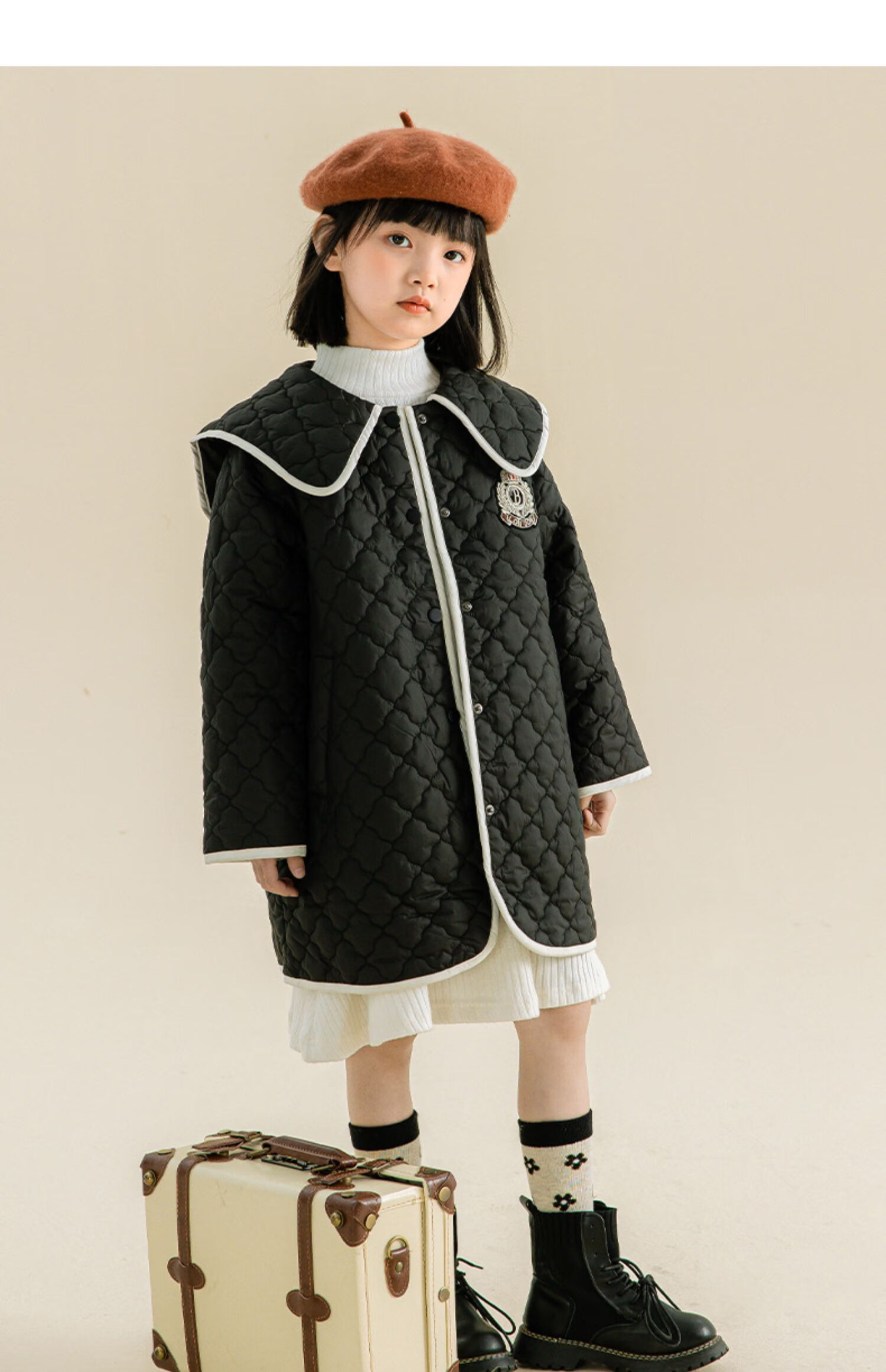 淘町女童冬季棉衣新款保暖中长款娃娃领棉袄休闲洋气时髦冬装外套 黑色 150