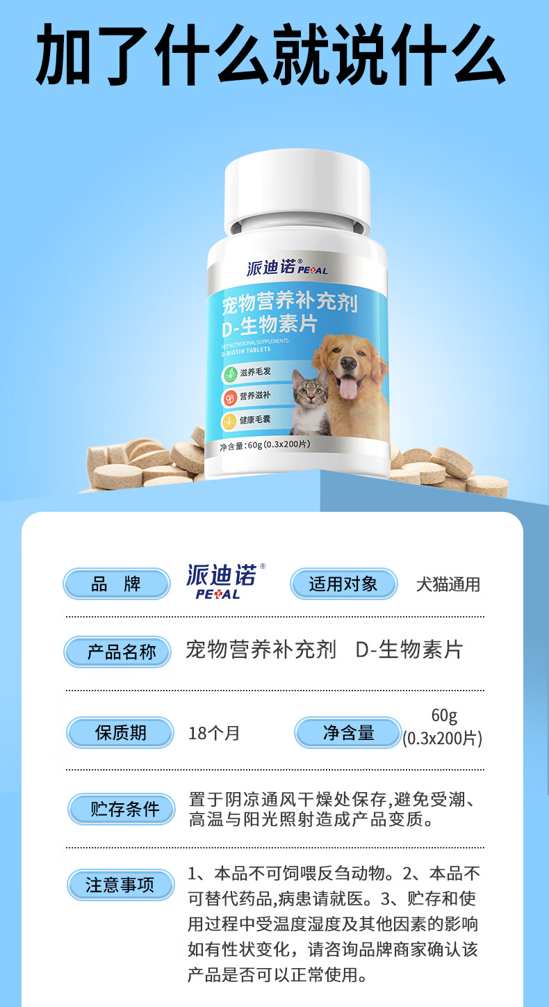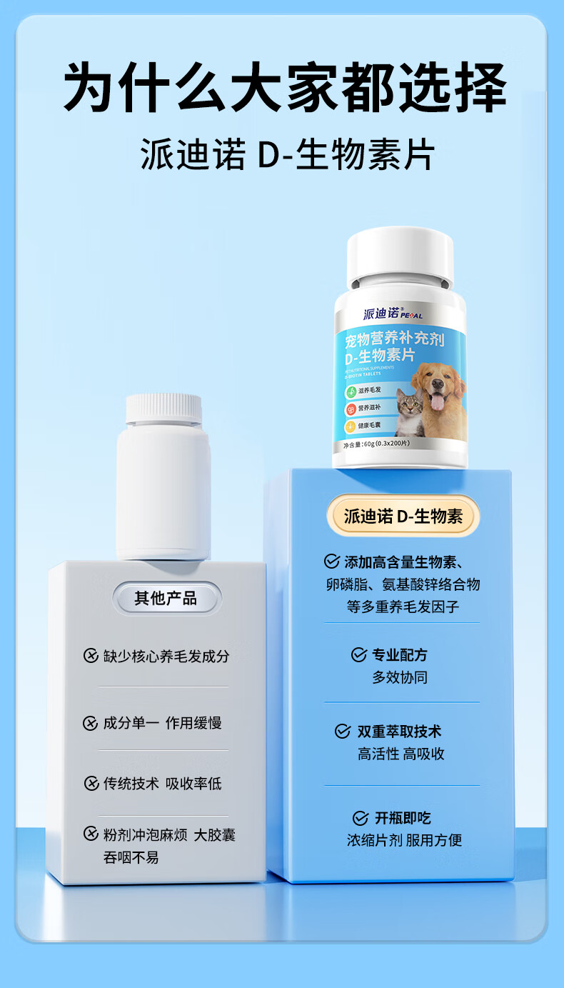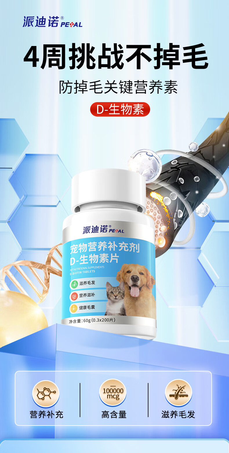 派迪诺宠物D-生物素片猫咪美毛防掉毛狗狗鱼油卵磷脂犬猫专用多维营养