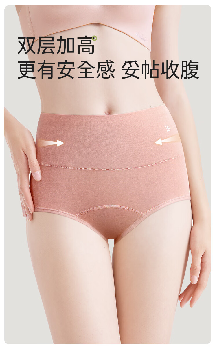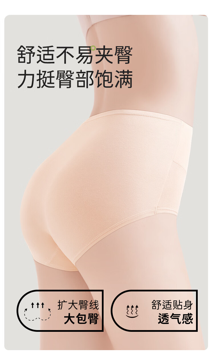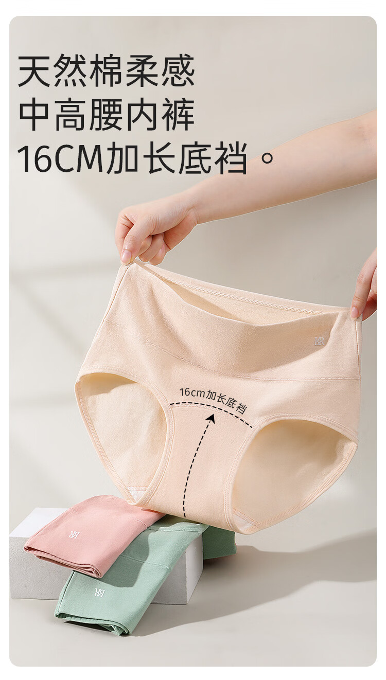 润微【100%纯棉加长裆】3条无痕高腰收腹提臀透气女士内裤薄款 粉肤/肤色/绿色 L