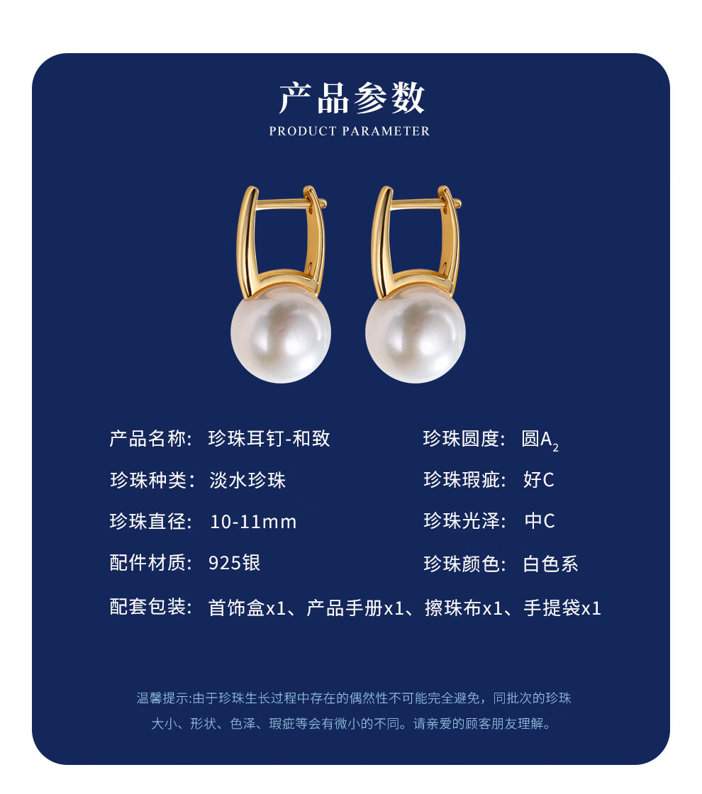 南珠宫和致925银淡水珍珠耳环强光泽圆形简约百搭新年礼物送长辈 金色款 10.0-11.0mm