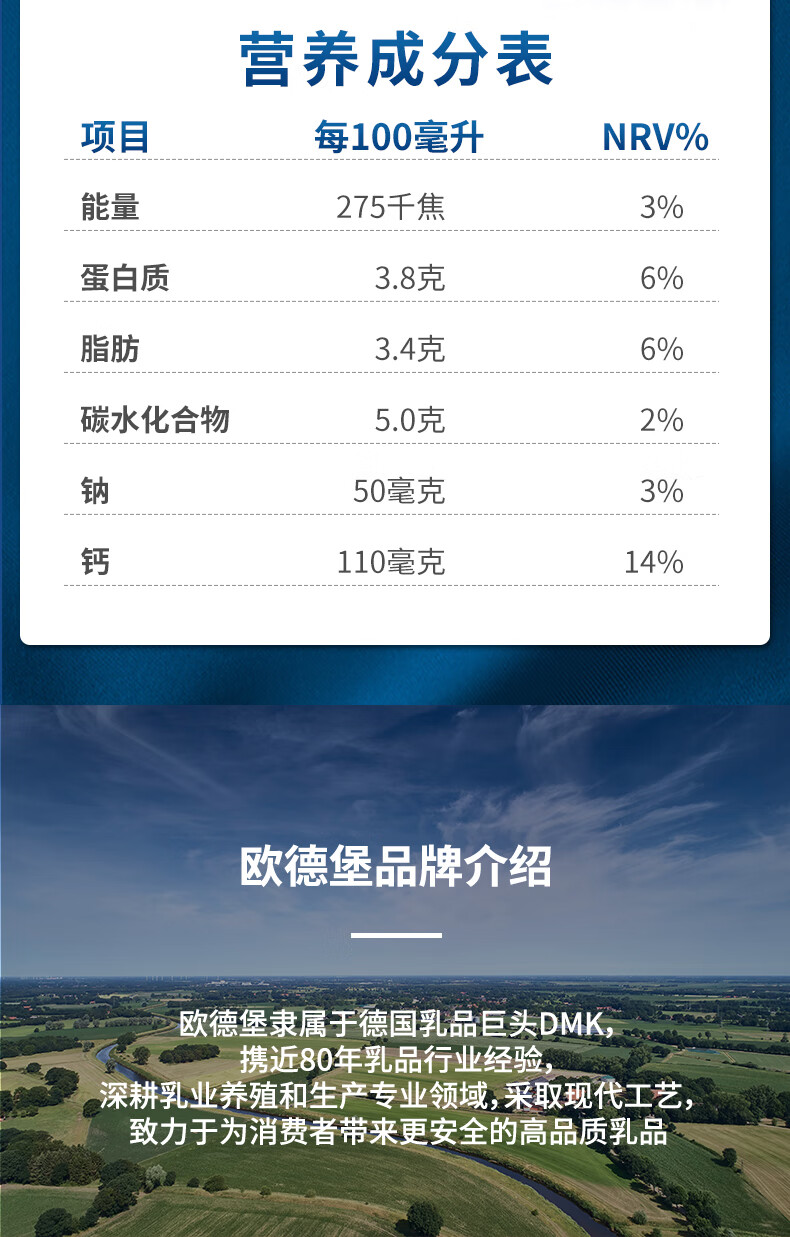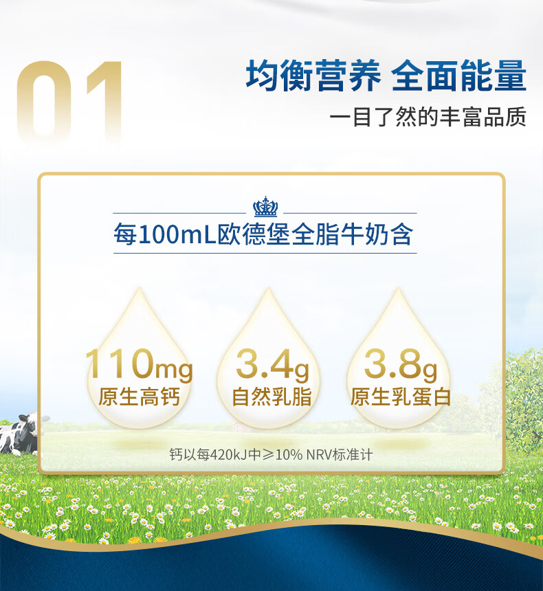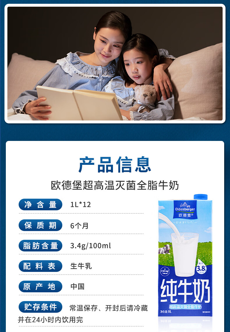 欧德堡(Oldenburger)3.8g蛋白原生钙全脂纯牛奶1L*12盒 家庭/学生/老人用奶 早餐奶
