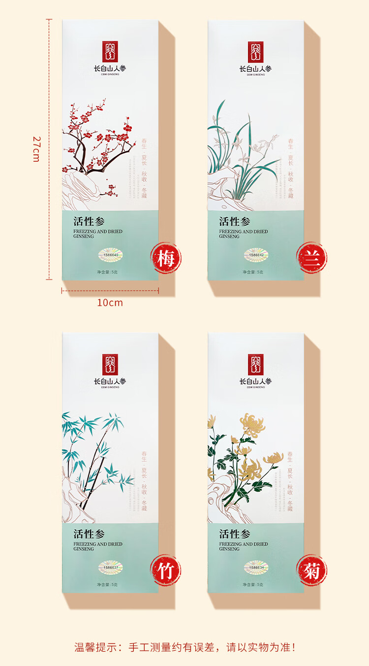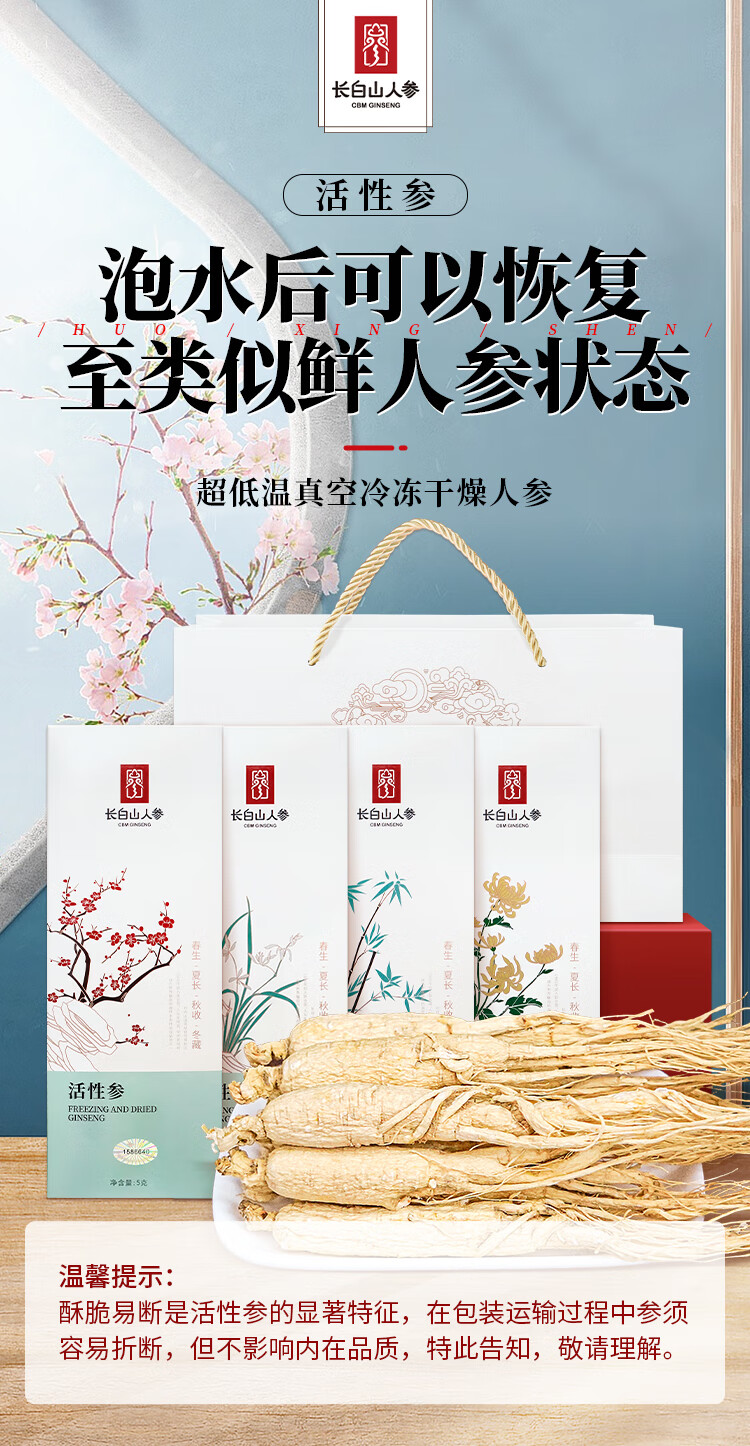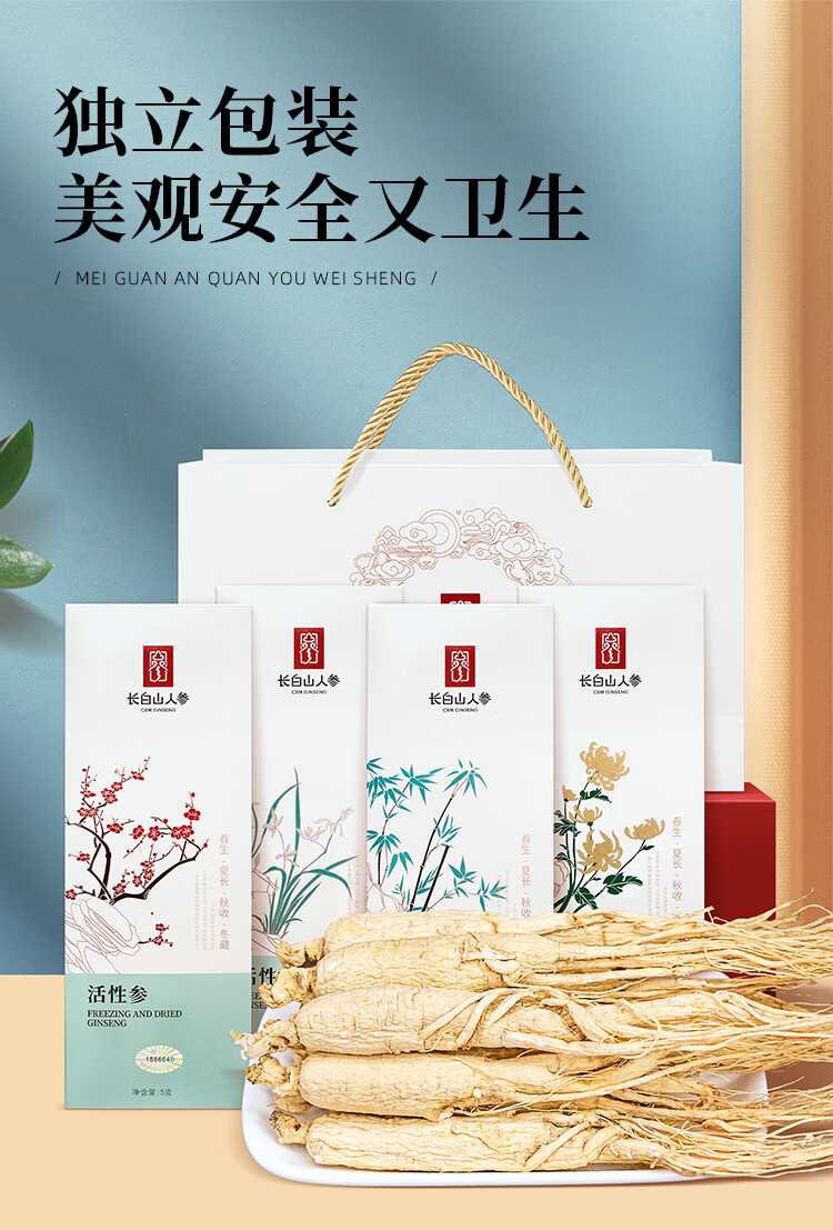 长白山人参活性冻干人参盒装送手袋梅兰竹菊套装煲汤泡水泡酒节日礼品盒 活性冻干人参4盒送2个礼袋