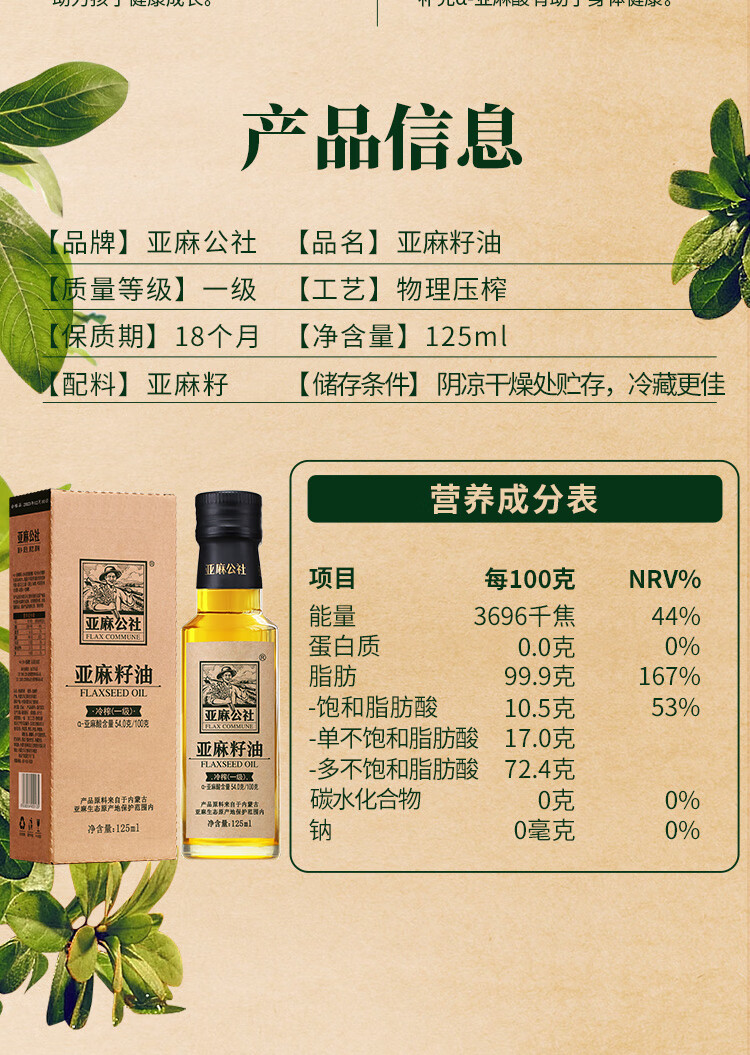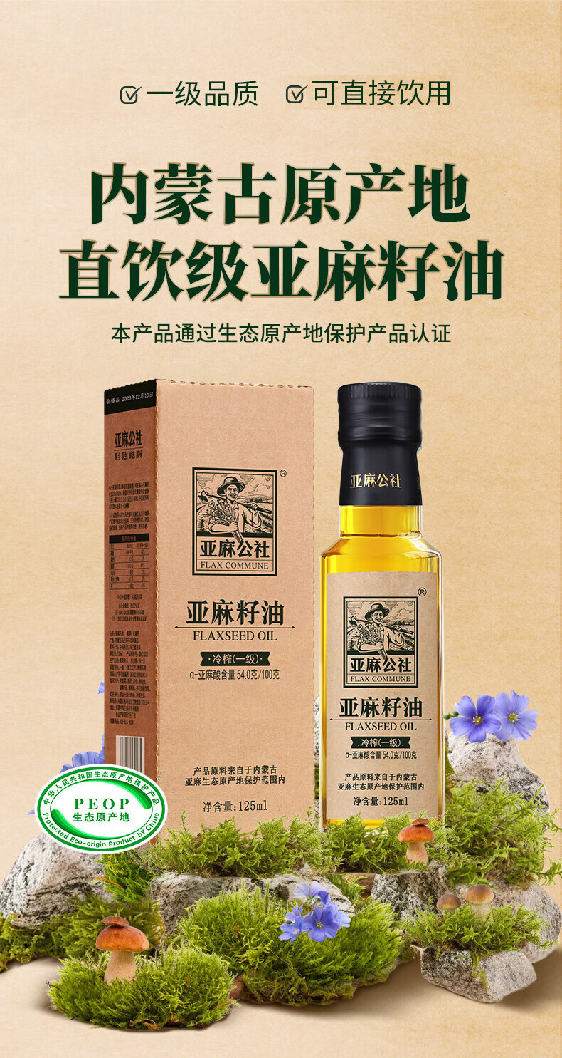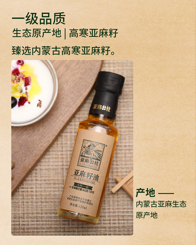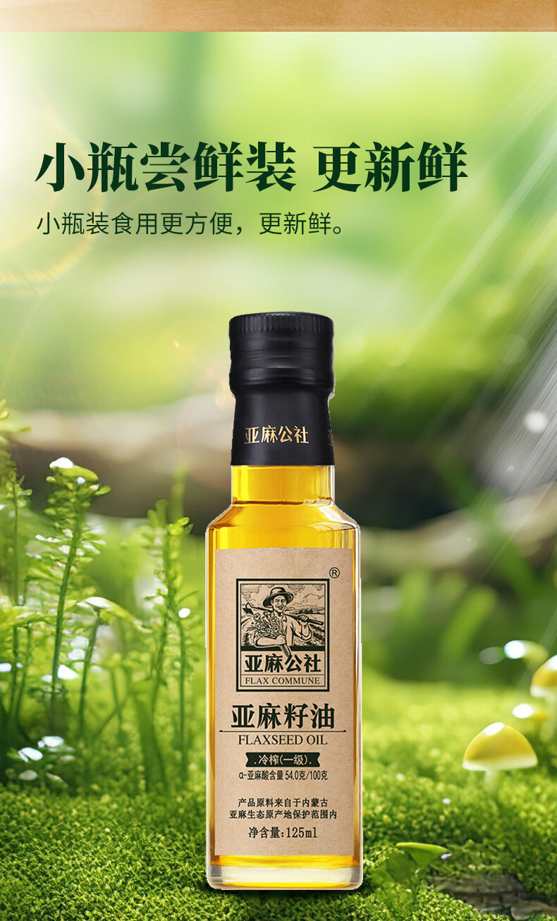 亚麻公社 【保真亚麻籽油】125ml 一级冷榨直接喝内蒙古胡麻油 宝宝omega3