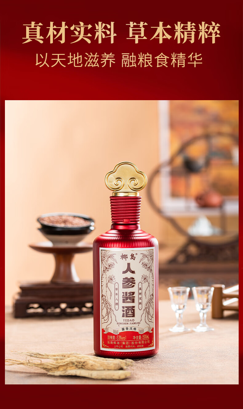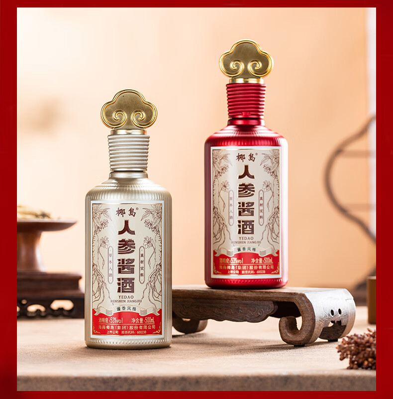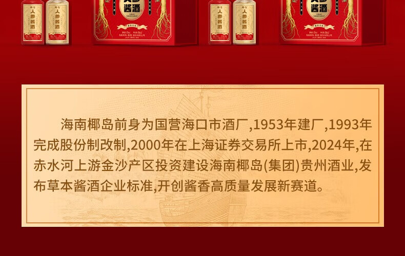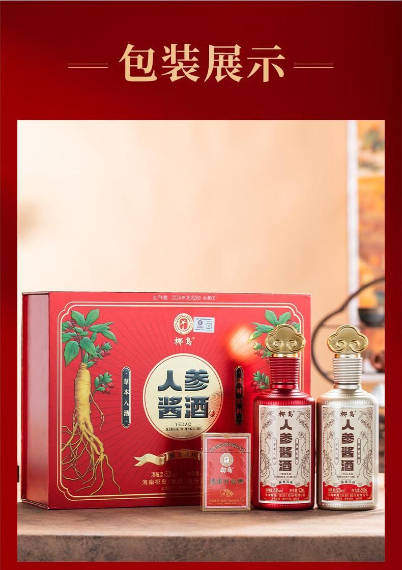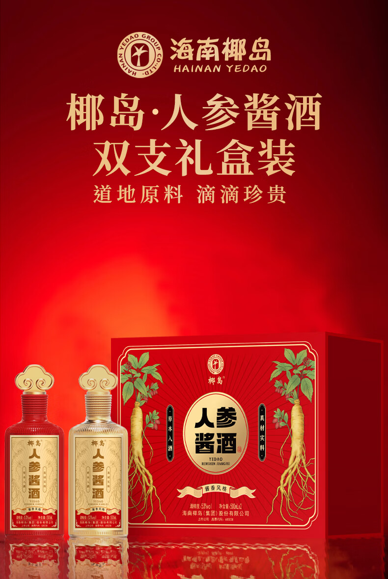 椰岛(YEDAO)人参酱酒礼盒装 酱香型白酒基酒 粮食酿造 草本养生酱酒年货送礼 53度 500mL 2瓶 双支礼盒装