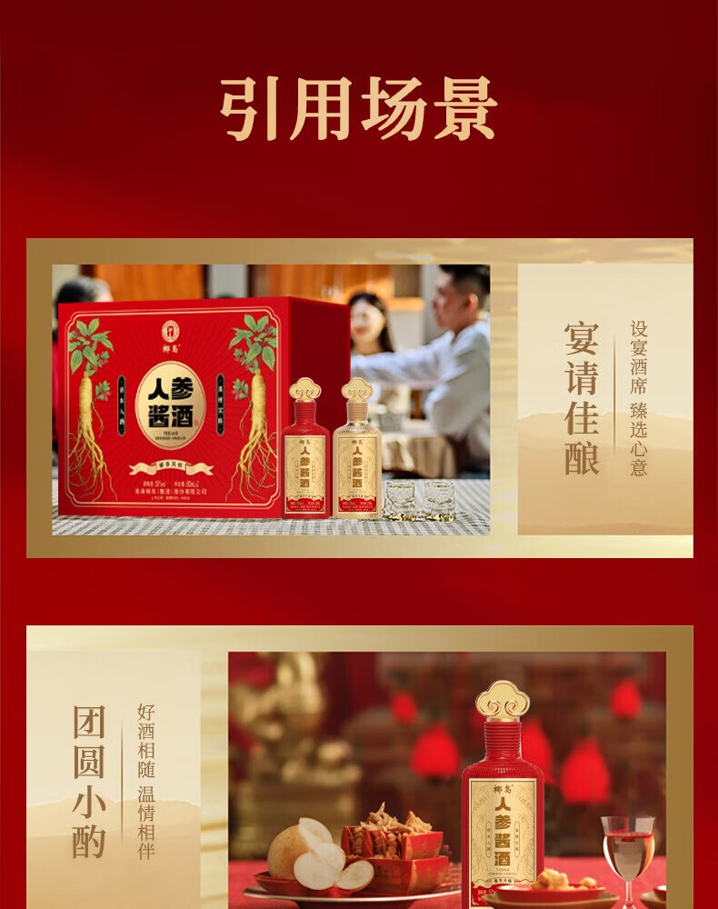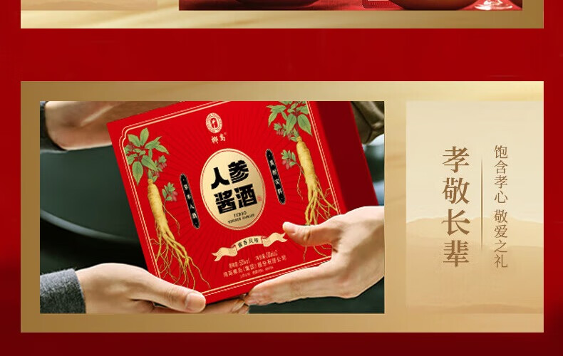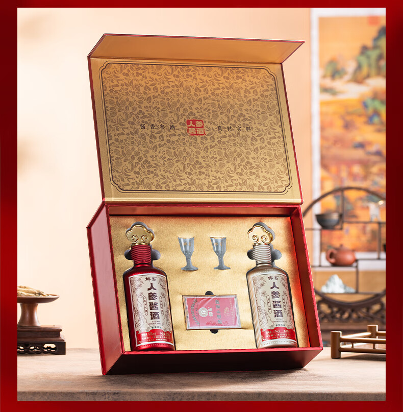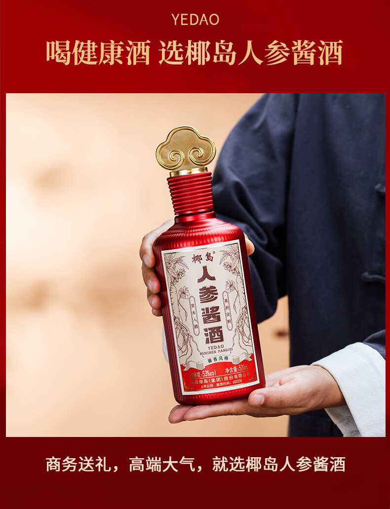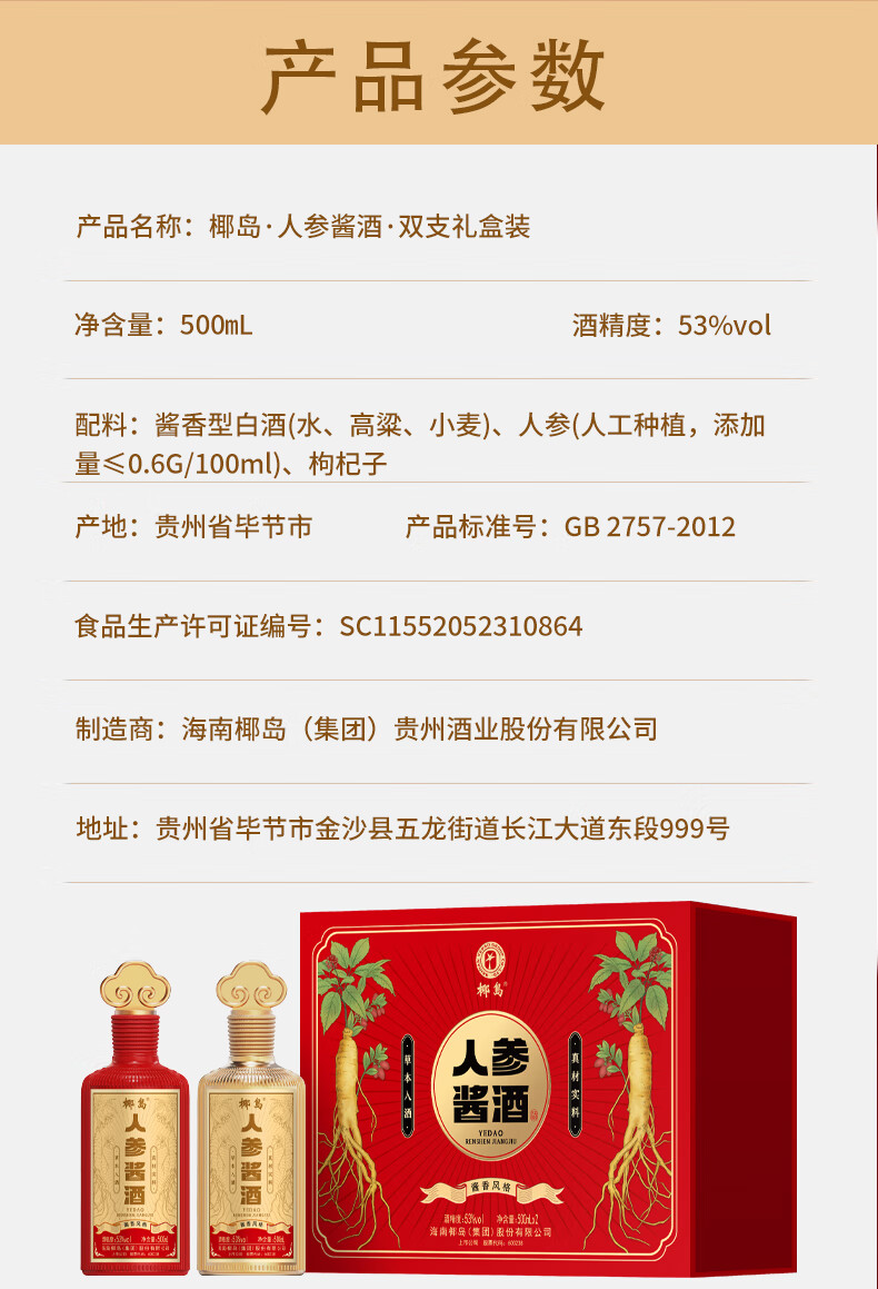 椰岛(YEDAO)人参酱酒礼盒装 酱香型白酒基酒 粮食酿造 草本养生酱酒年货送礼 53度 500mL 2瓶 双支礼盒装