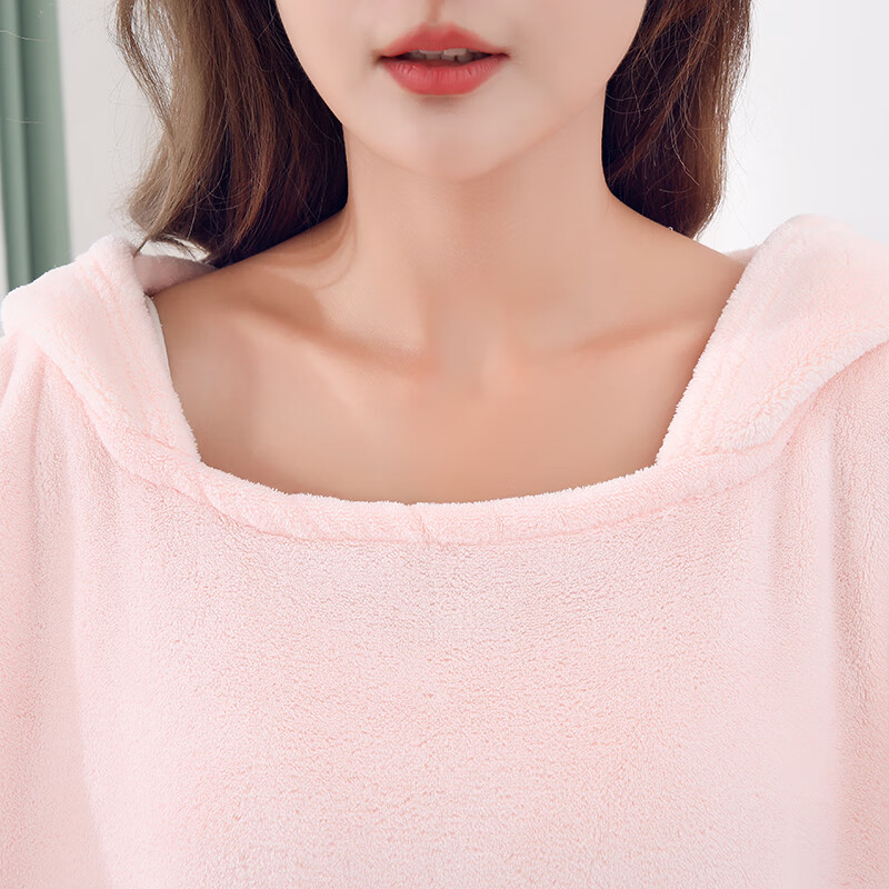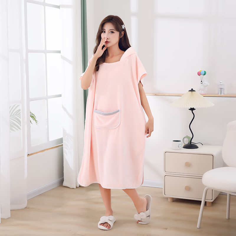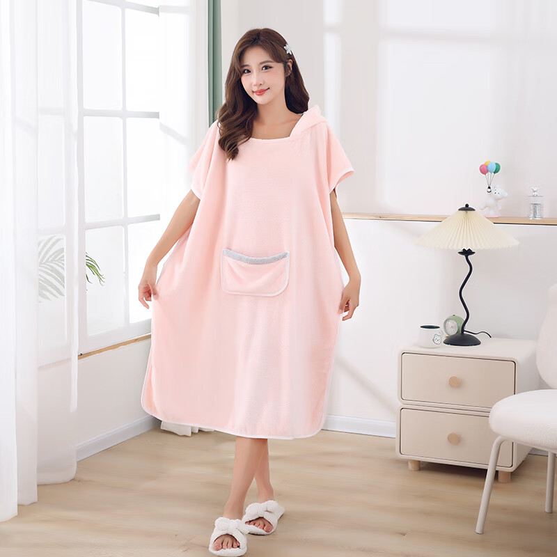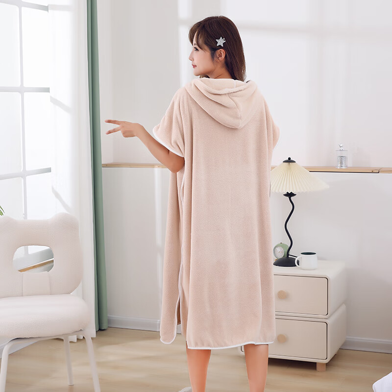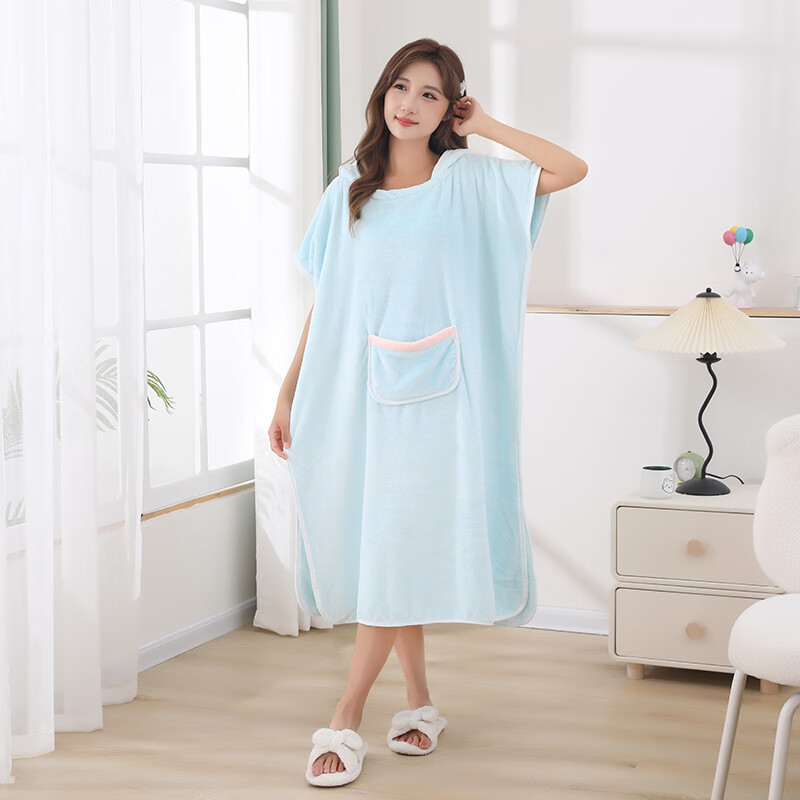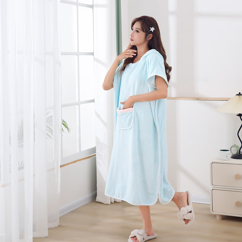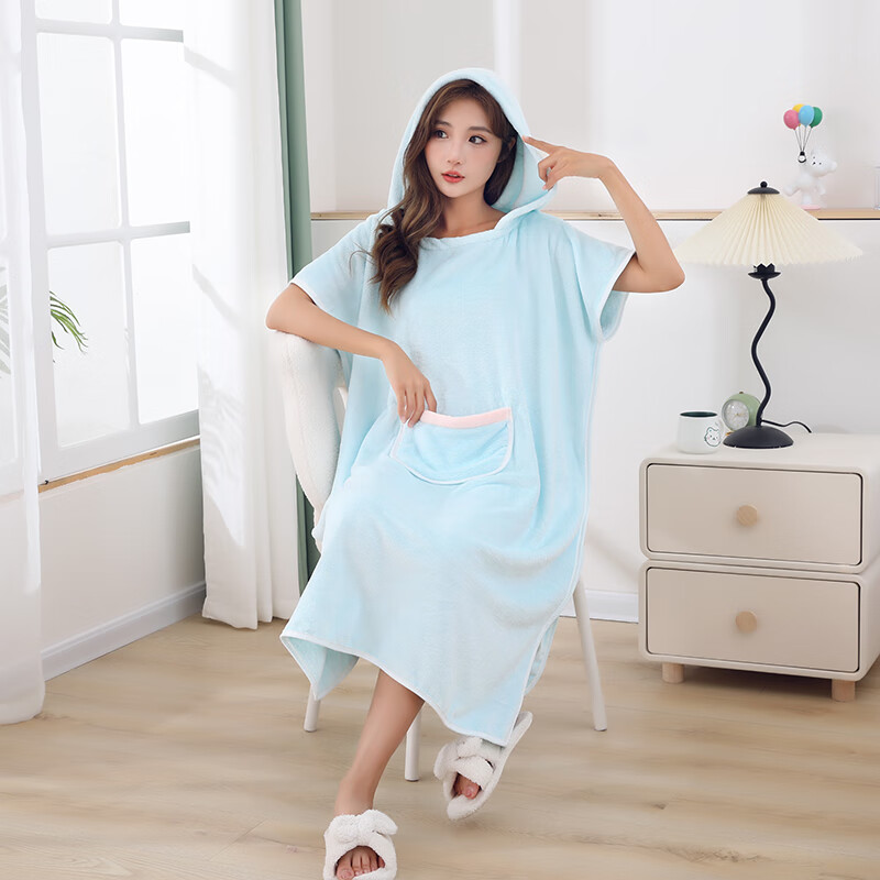 可穿式浴袍可爱成人家用长款速干吸水大码连帽学生洗澡游泳浴裙 蓝色浴裙 均码