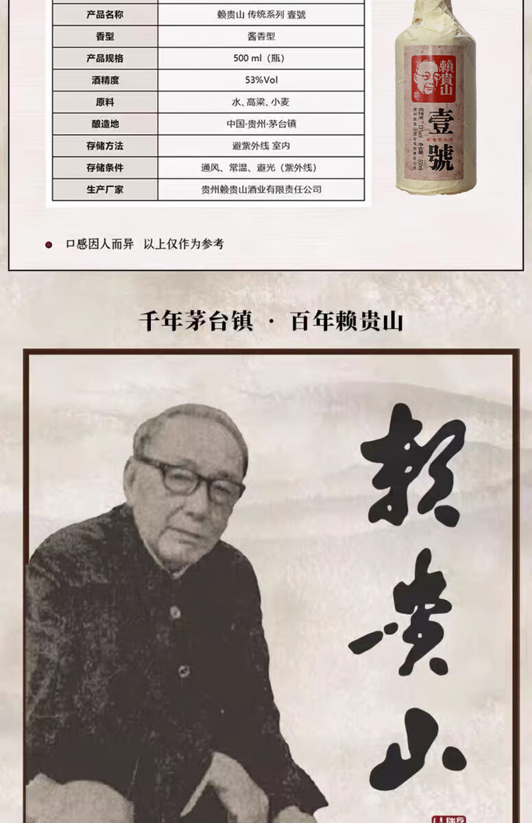 赖贵山1号贵州酱酒纯粮酿造酱香型白酒单瓶袋装 53度 500mL 6瓶