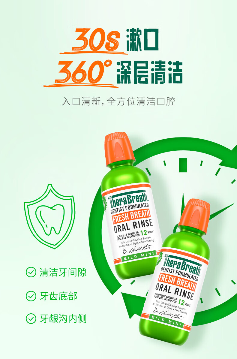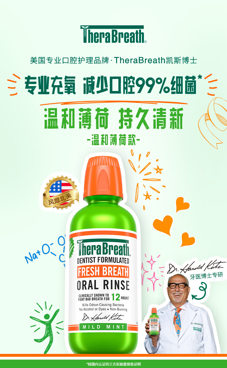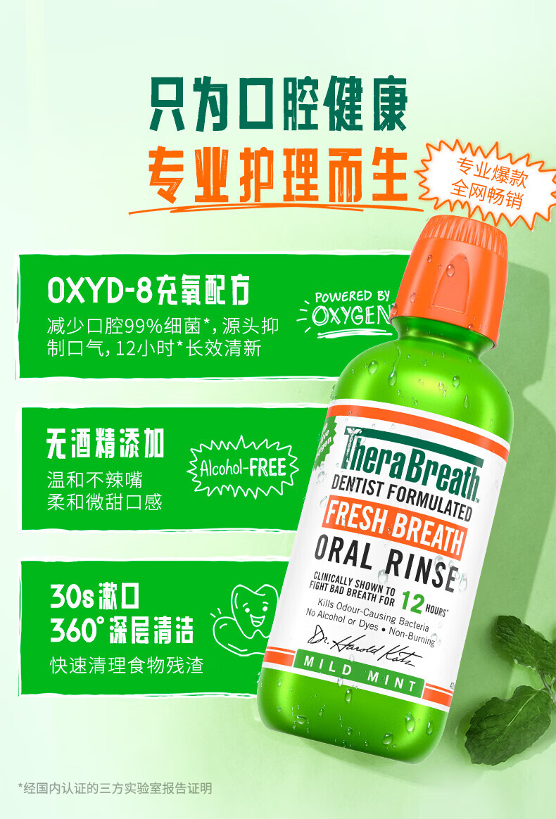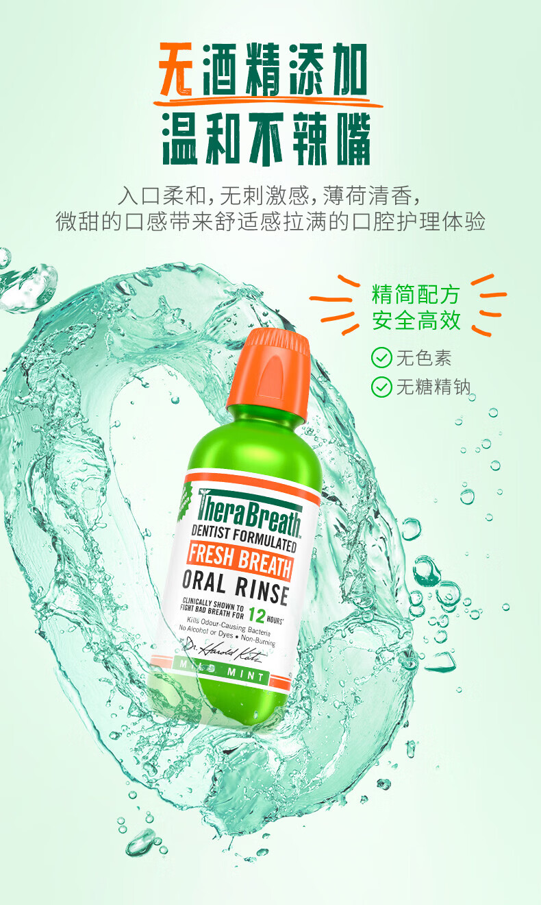 TheraBreath凯斯博士漱口水清新口气减少细菌持久去口臭神器无酒精成人儿童用 加量一升装1000ml