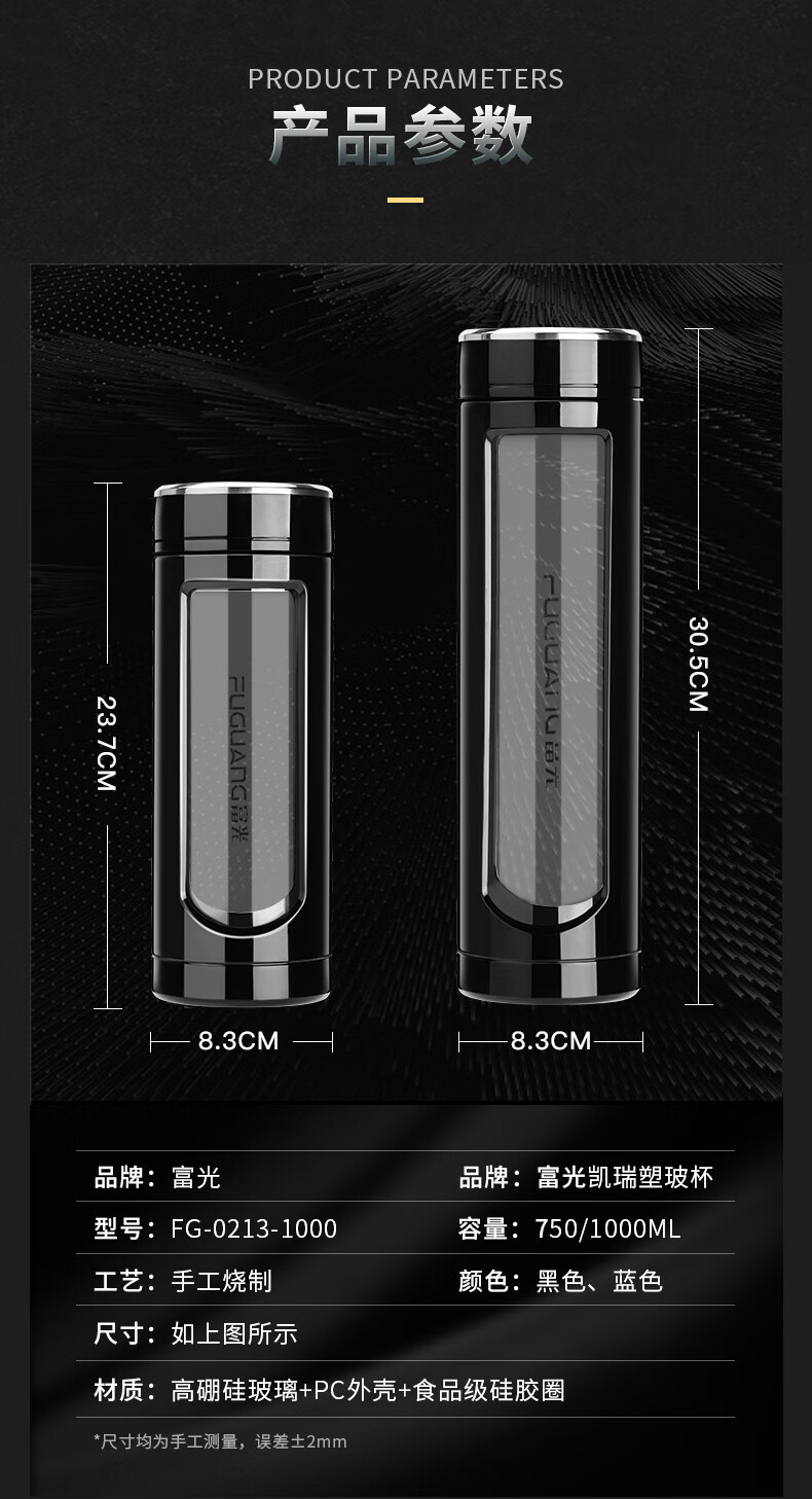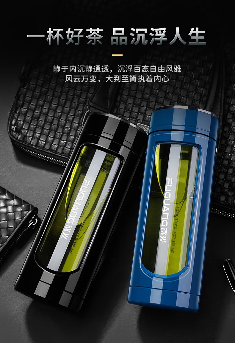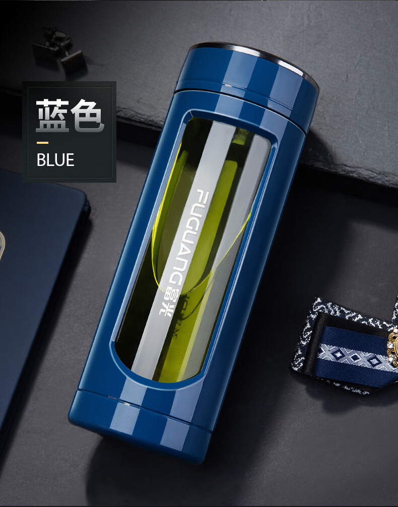 PJ玻璃杯塑玻杯防烫隔热车载防摔茶水分离车载商务茶杯 经典款大容量-蓝色1000ml